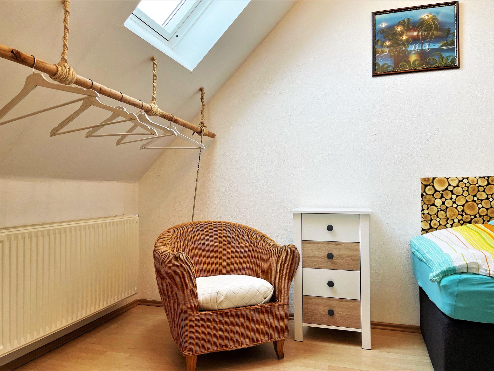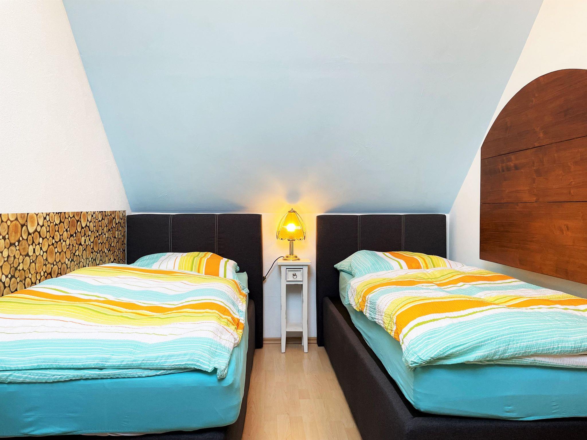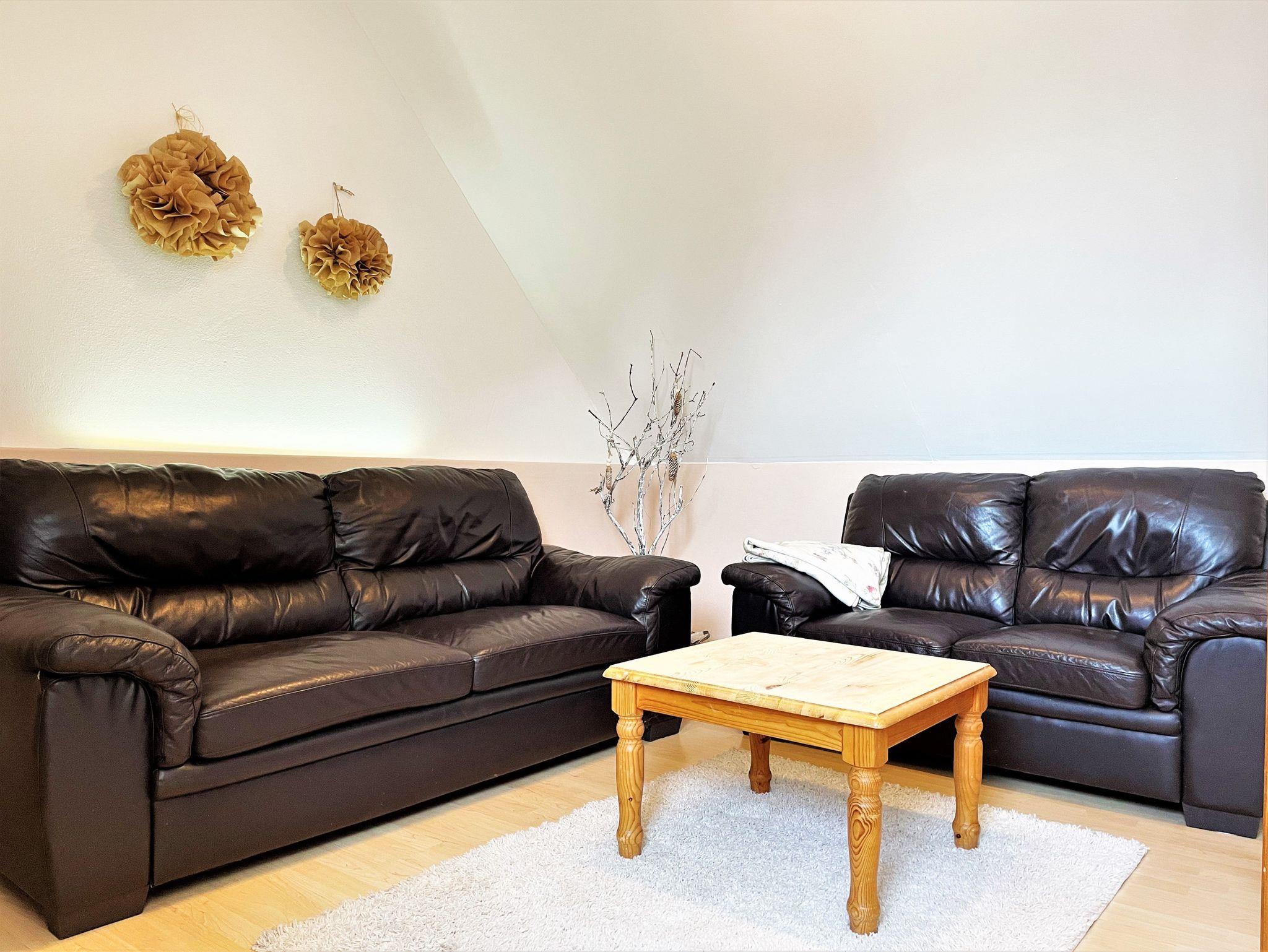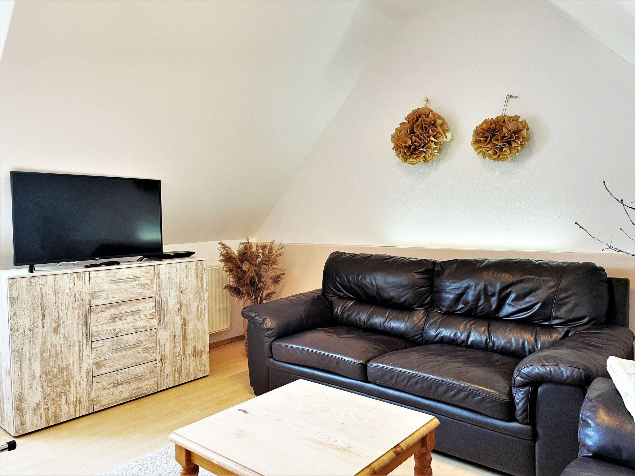 Die 72 m² große Ferienwohnung erstreckt sich über 2 Etagen und eignet sich ideal für bis zu 4 Personen. Das Erdgeschoss verfügt über einen Flur mit Garderobe, ein Bad, welches mit einer Badewanne mit Duschbrause, WC, Waschtisch, einem Spiegel sowie mit einer Waschmaschine ausgestattet ist. Eine Küche mit Essbereich sowie einer Küchenbar befindet sich ebenfalls in der unteren Ebene. Eine Fußbodenheizung sorgt im Erdgeschoss für gute Raumtemperaturen. Die obere Etage erreichen Gäste über eine moderne Holztreppe. Hier befindet sich ein großer Wohnbereich, dieser ist mit einer Schlafcouch ausgestattet und dient für 2 Gäste während des Aufenthaltes als Aufbettung. Weiterhin verfügt der Wohnbereich über eine Sitzecke mit hochwertiger Ledercouch. Hier steht auch der Fernseher mit Blu-Ray-Player. Ein Spielbereich mit Tischkicker sowie Bücher und Gesellschaftsspiele verschönen den Aufenthalt auch bei schlechtem Wetter. Das Schlafzimmer ist mit 2 modernen Boxspringbetten ausgestattet.