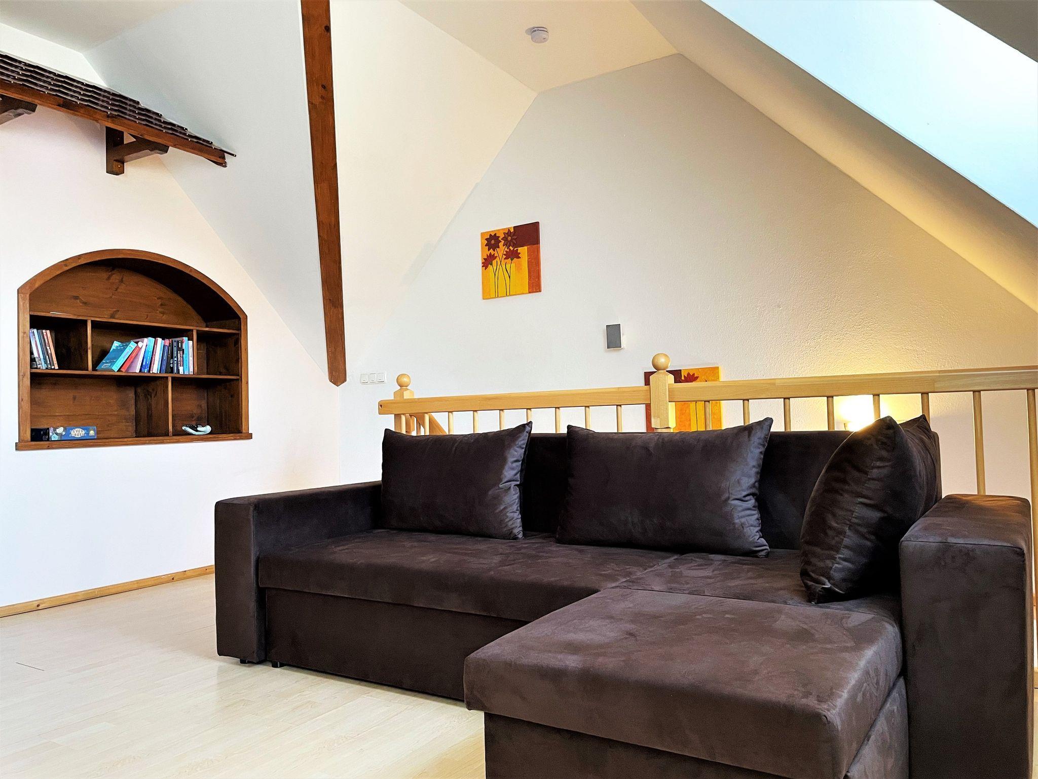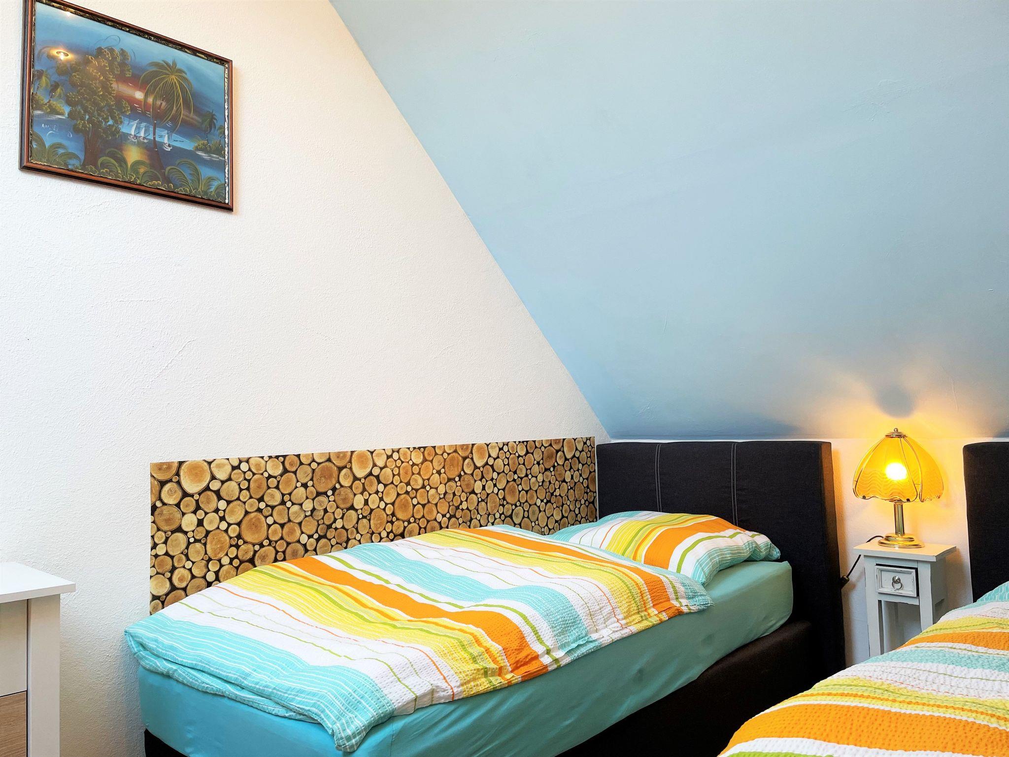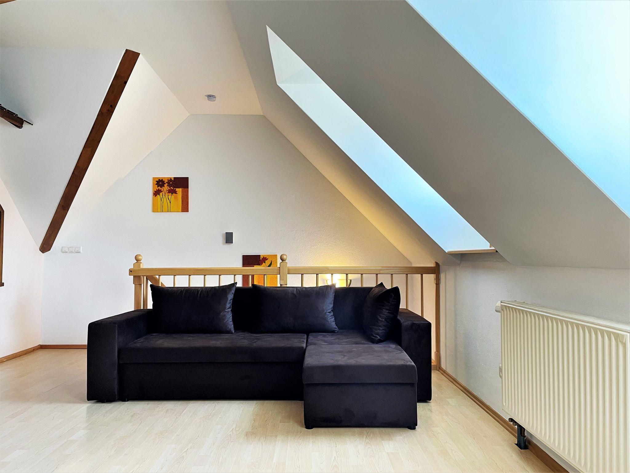 Die 72 m² große Ferienwohnung erstreckt sich über 2 Etagen und eignet sich ideal für bis zu 4 Personen. Das Erdgeschoss verfügt über einen Flur mit Garderobe, ein Bad, welches mit einer Badewanne mit Duschbrause, WC, Waschtisch, einem Spiegel sowie mit einer Waschmaschine ausgestattet ist. Eine Küche mit Essbereich sowie einer Küchenbar befindet sich ebenfalls in der unteren Ebene. Eine Fußbodenheizung sorgt im Erdgeschoss für gute Raumtemperaturen. Die obere Etage erreichen Gäste über eine moderne Holztreppe. Hier befindet sich ein großer Wohnbereich, dieser ist mit einer Schlafcouch ausgestattet und dient für 2 Gäste während des Aufenthaltes als Aufbettung. Weiterhin verfügt der Wohnbereich über eine Sitzecke mit hochwertiger Ledercouch. Hier steht auch der Fernseher mit Blu-Ray-Player. Ein Spielbereich mit Tischkicker sowie Bücher und Gesellschaftsspiele verschönen den Aufenthalt auch bei schlechtem Wetter. Das Schlafzimmer ist mit 2 modernen Boxspringbetten ausgestattet.