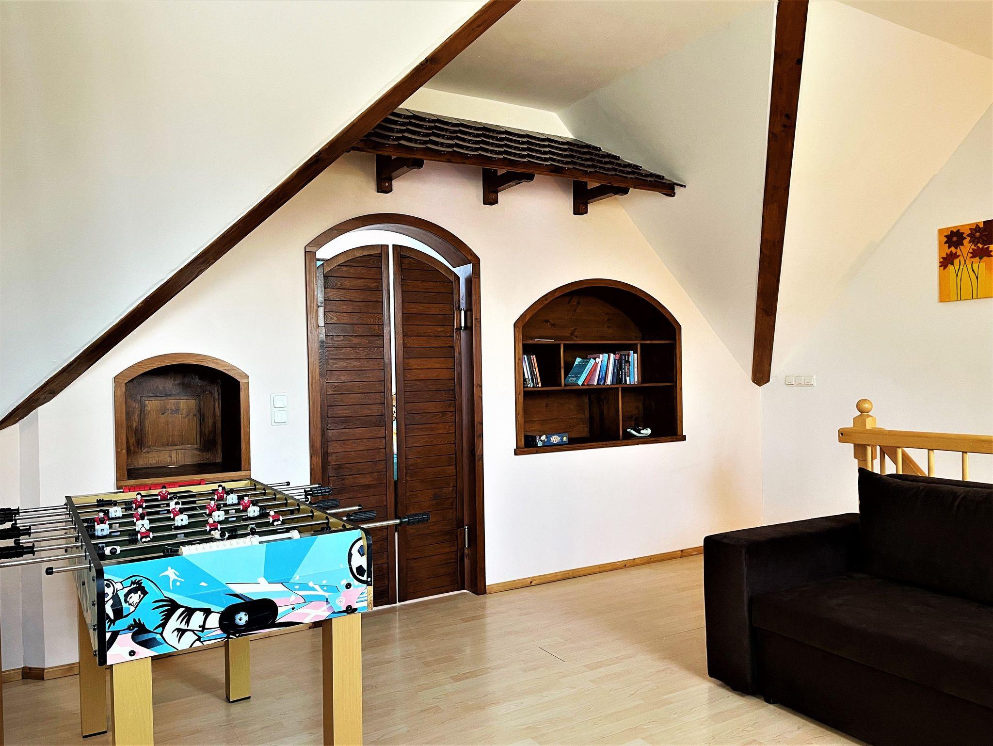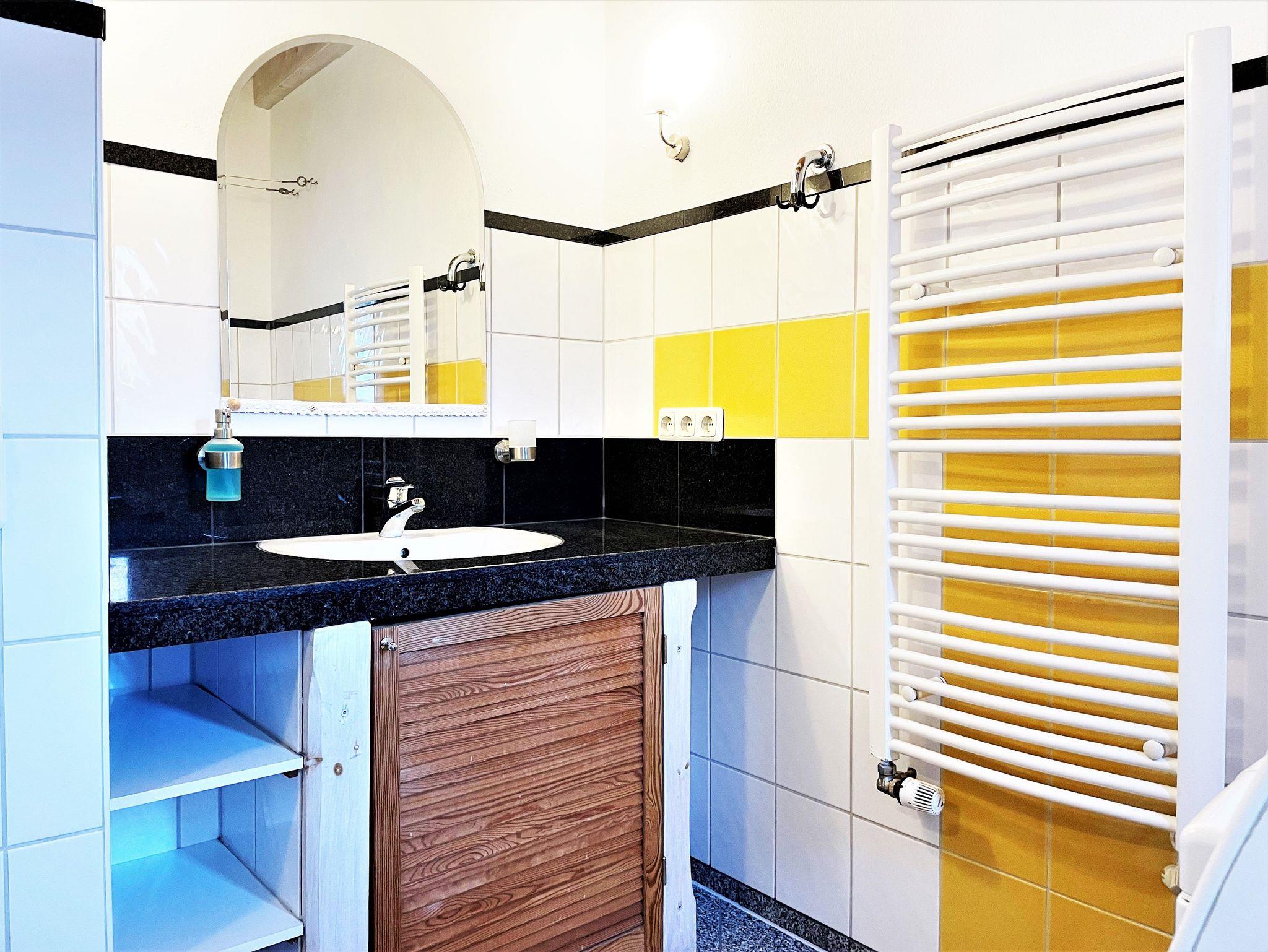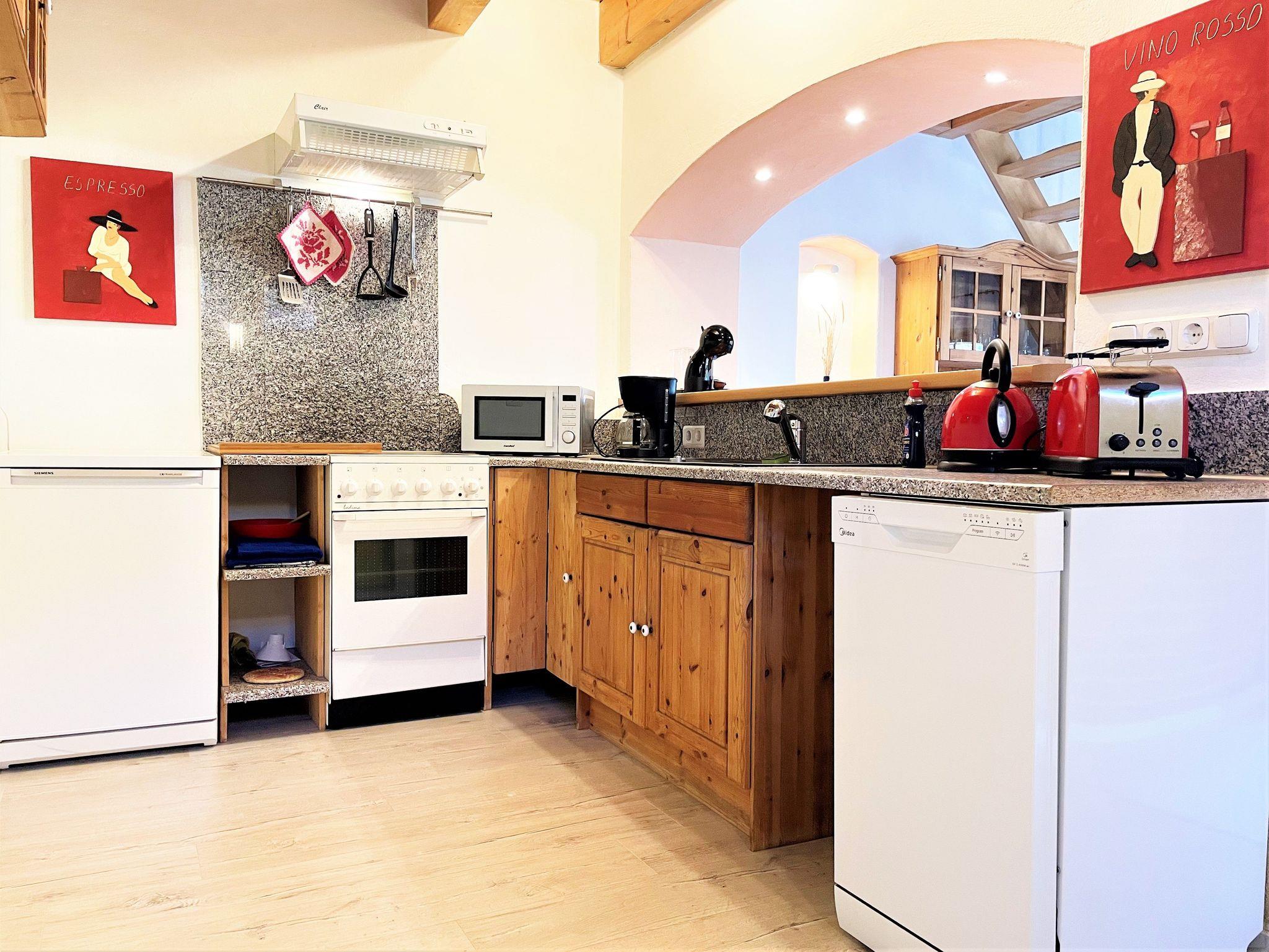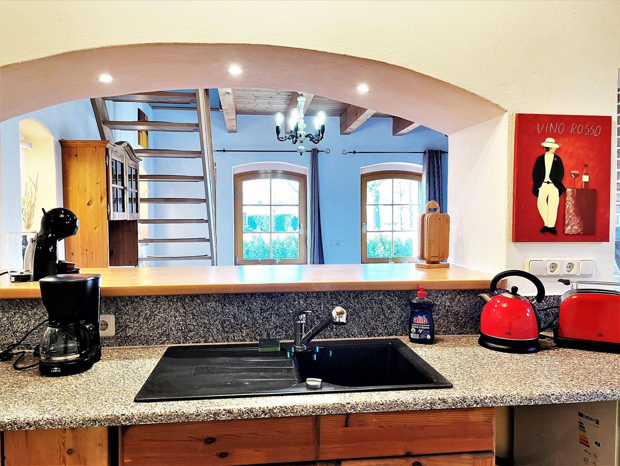 Die 72 m² große Ferienwohnung erstreckt sich über 2 Etagen und eignet sich ideal für bis zu 4 Personen. Das Erdgeschoss verfügt über einen Flur mit Garderobe, ein Bad, welches mit einer Badewanne mit Duschbrause, WC, Waschtisch, einem Spiegel sowie mit einer Waschmaschine ausgestattet ist. Eine Küche mit Essbereich sowie einer Küchenbar befindet sich ebenfalls in der unteren Ebene. Eine Fußbodenheizung sorgt im Erdgeschoss für gute Raumtemperaturen. Die obere Etage erreichen Gäste über eine moderne Holztreppe. Hier befindet sich ein großer Wohnbereich, dieser ist mit einer Schlafcouch ausgestattet und dient für 2 Gäste während des Aufenthaltes als Aufbettung. Weiterhin verfügt der Wohnbereich über eine Sitzecke mit hochwertiger Ledercouch. Hier steht auch der Fernseher mit Blu-Ray-Player. Ein Spielbereich mit Tischkicker sowie Bücher und Gesellschaftsspiele verschönen den Aufenthalt auch bei schlechtem Wetter. Das Schlafzimmer ist mit 2 modernen Boxspringbetten ausgestattet.