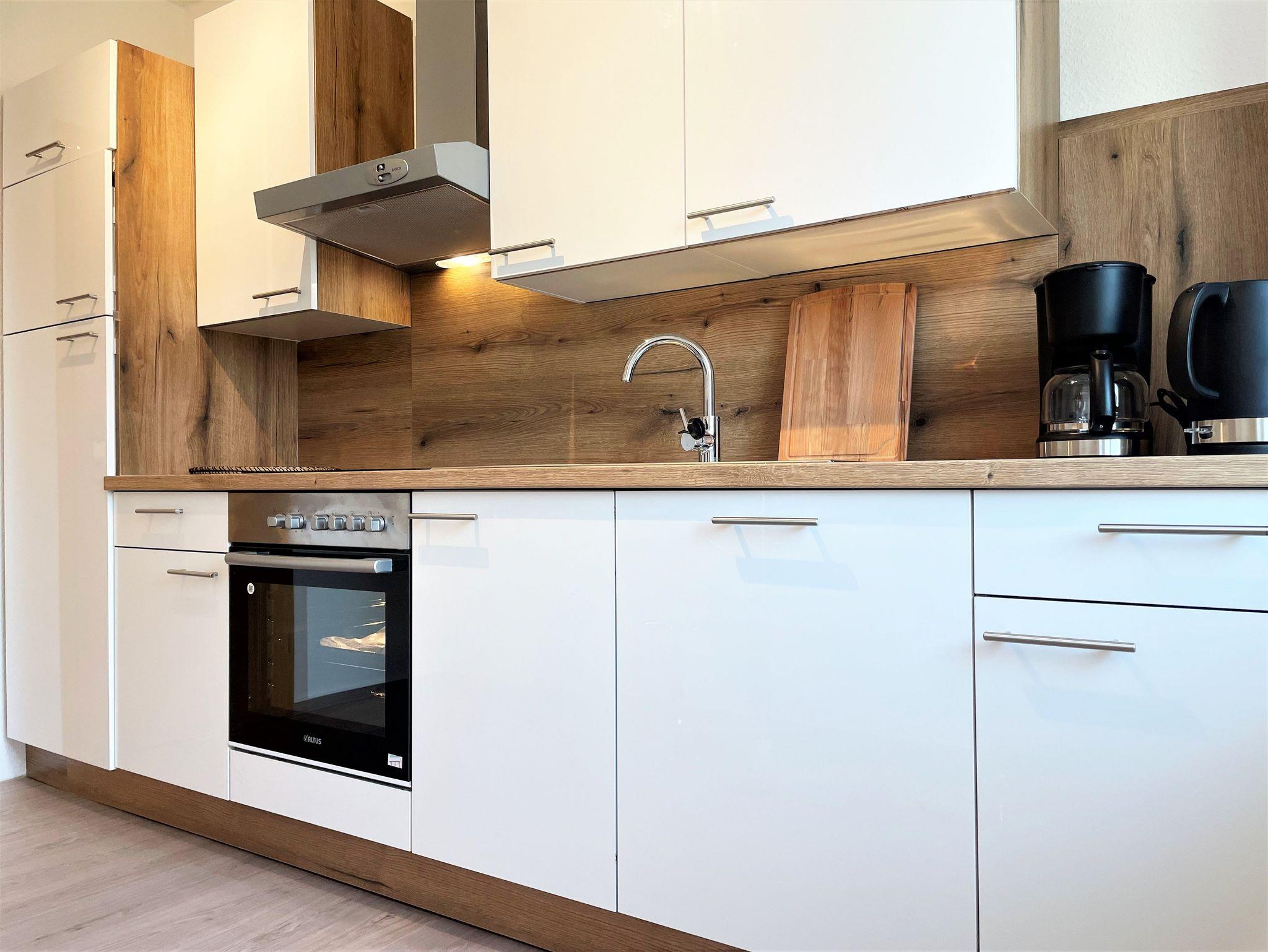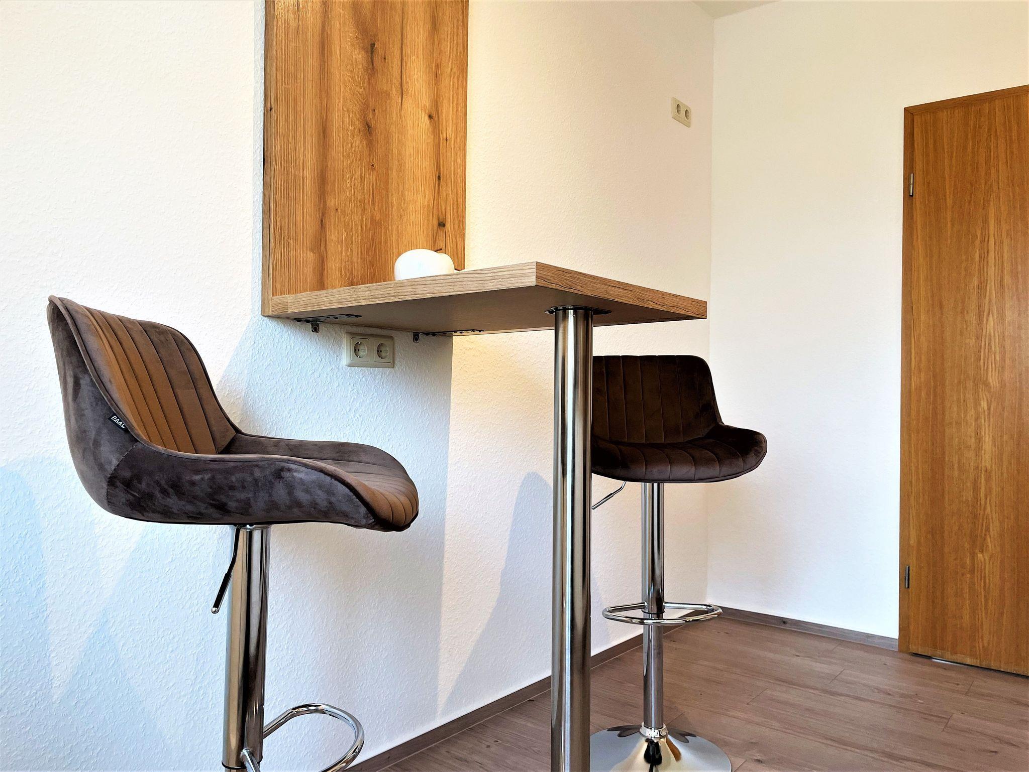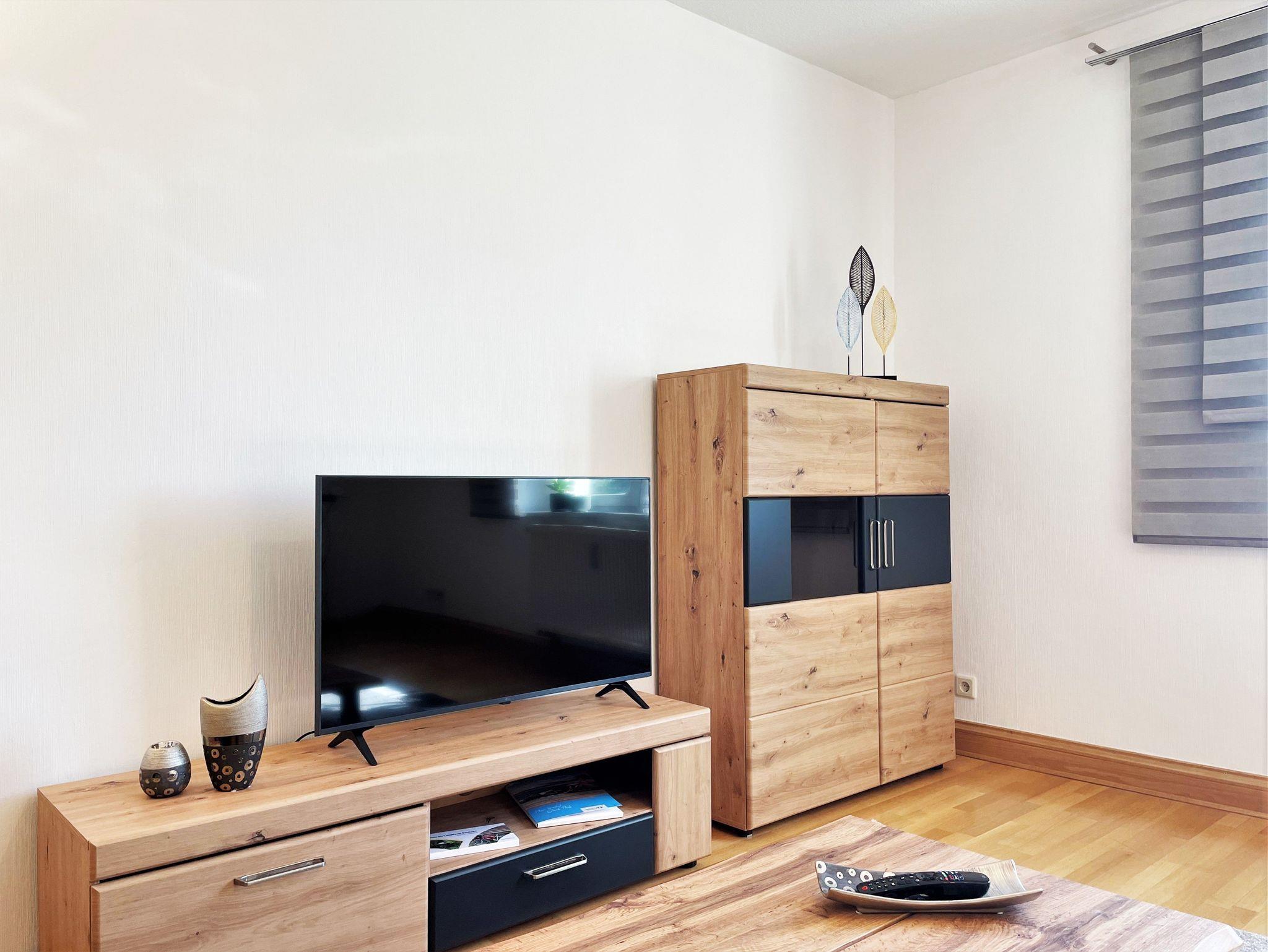 Die Gästewohnung verfügt über einen Flur mit Garderobe und ein in hellen Farben eingerichtetes Bad, welches mit einer Badewanne, WC, Waschbecken und einem Handtuchwärmer ausgestattet ist. Handtücher werden bereitgestellt und sind im Preis inbegriffen. Die separate Küche ist komplett mit Backofen, Kühlschrank mit Gefriermöglichkeit, Spülmaschine und weiteren Annehmlichkeiten ausgestattet. Weiterhin wurde ein kleiner Hochtisch mit Barhockern in der Küche verbaut. Eine schöne Ecklandschaft lädt im Wohnzimmer zum entspannten Verweilen ein. Von hier aus kann man zu jeder Zeit über einen Smart-TV sein Fernsehprogramm abrufen.
