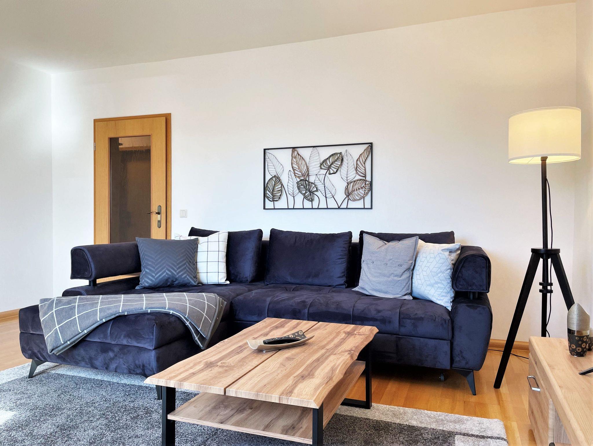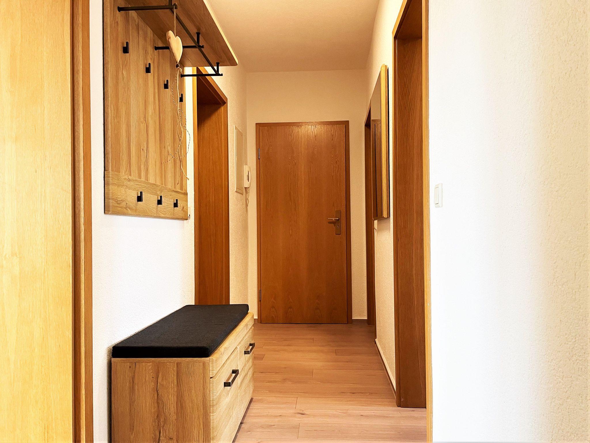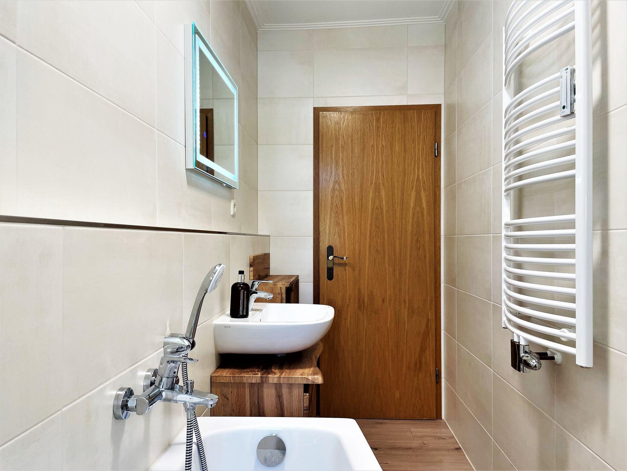 Die Gästewohnung verfügt über einen Flur mit Garderobe und ein in hellen Farben eingerichtetes Bad, welches mit einer Badewanne, WC, Waschbecken und einem Handtuchwärmer ausgestattet ist. Handtücher werden bereitgestellt und sind im Preis inbegriffen. Die separate Küche ist komplett mit Backofen, Kühlschrank mit Gefriermöglichkeit, Spülmaschine und weiteren Annehmlichkeiten ausgestattet. Weiterhin wurde ein kleiner Hochtisch mit Barhockern in der Küche verbaut. Eine schöne Ecklandschaft lädt im Wohnzimmer zum entspannten Verweilen ein. Von hier aus kann man zu jeder Zeit über einen Smart-TV sein Fernsehprogramm abrufen.