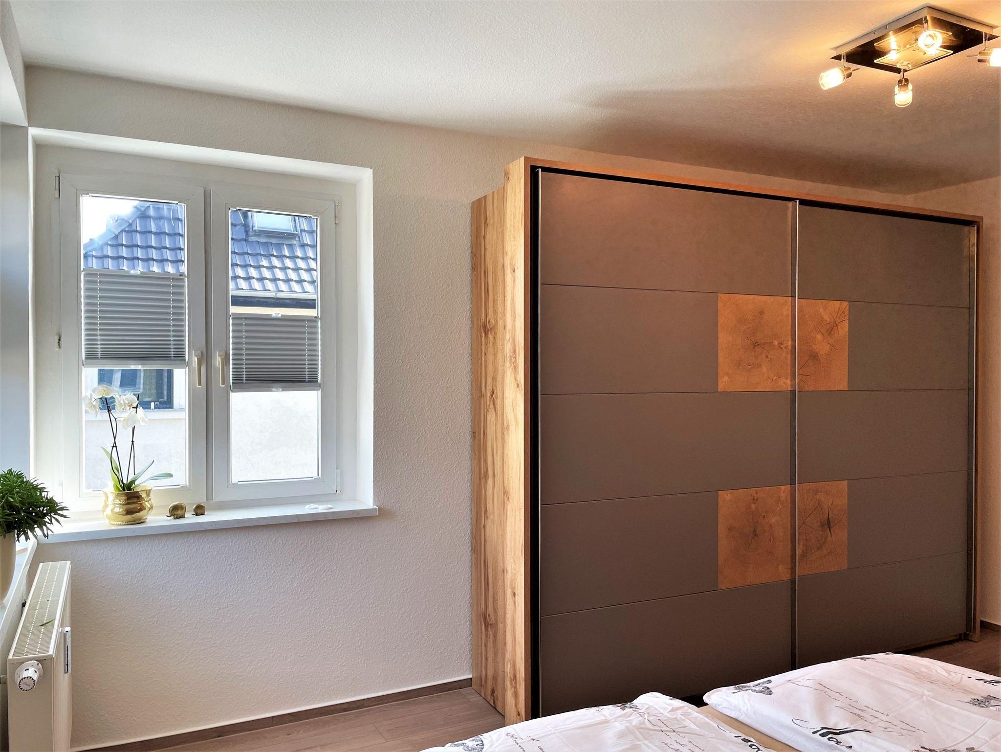 Das Schlafzimmer verfügt über ein Doppelbett sowie einen großen Kleiderschrank. Bettwäsche ist im Preis ebenfalls enthalten.