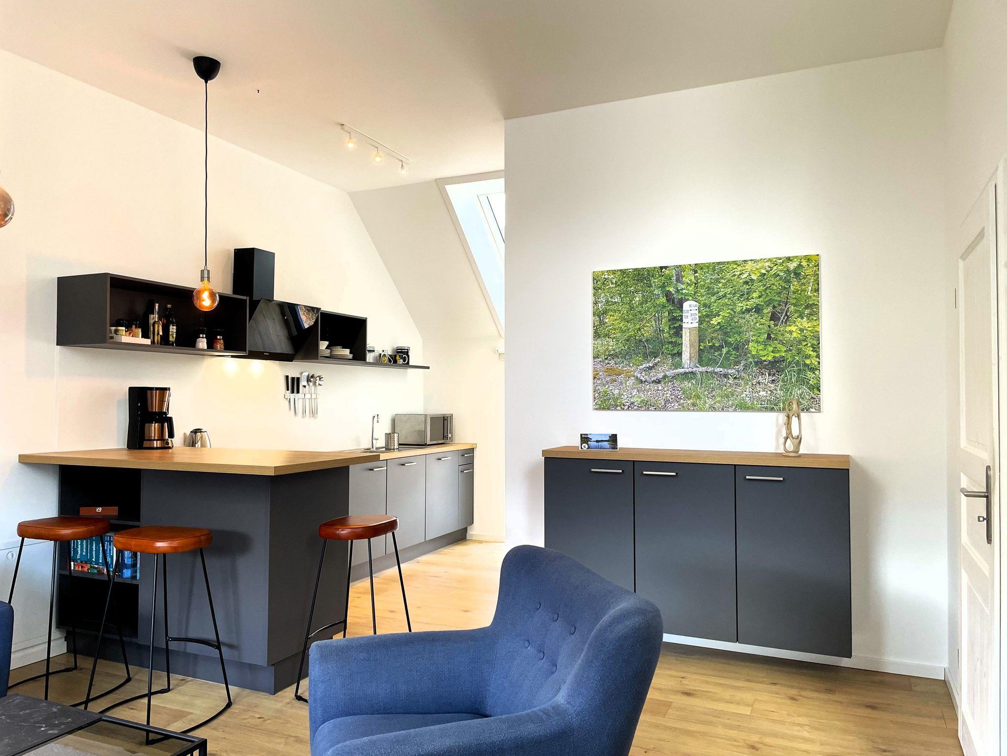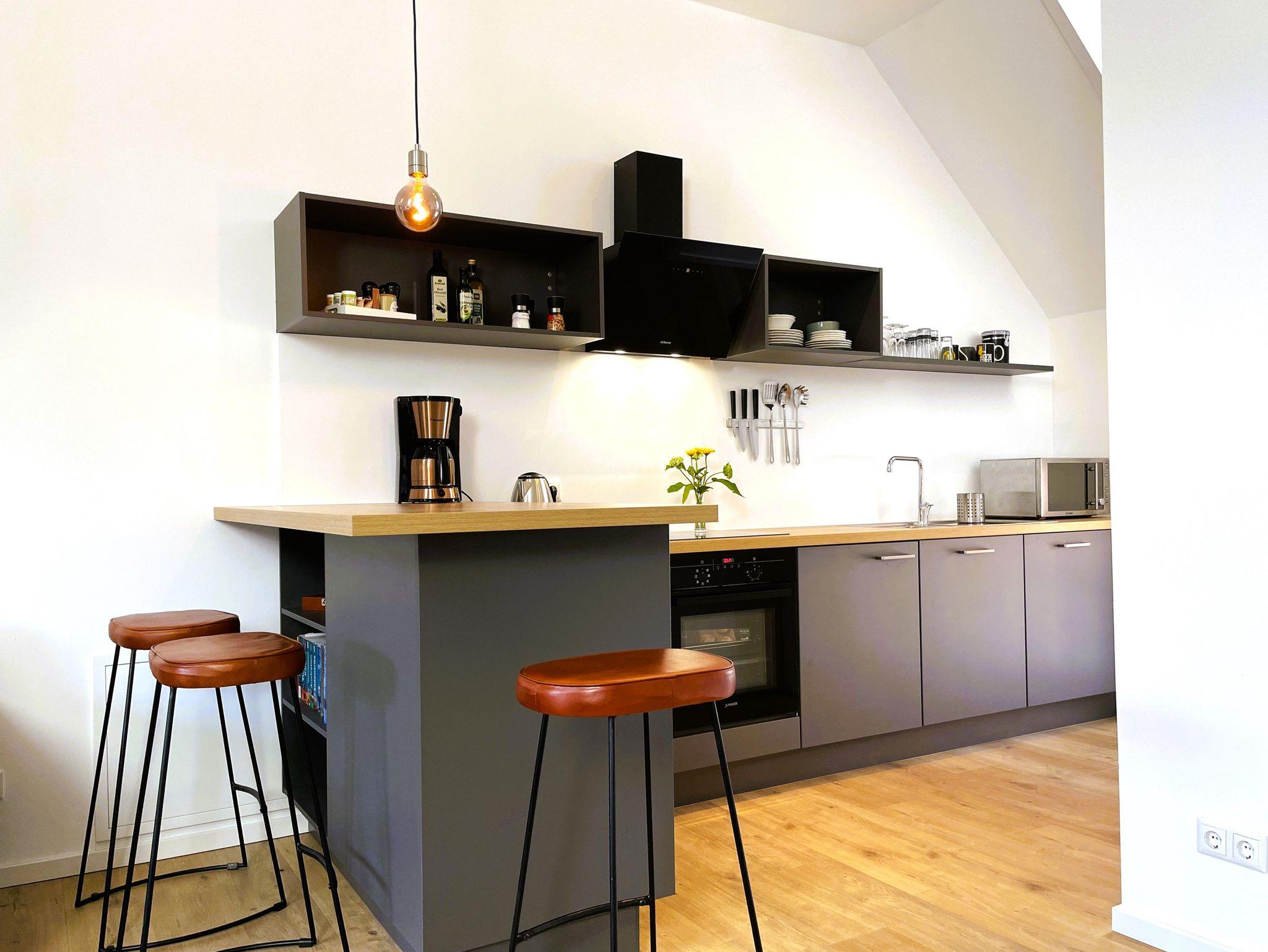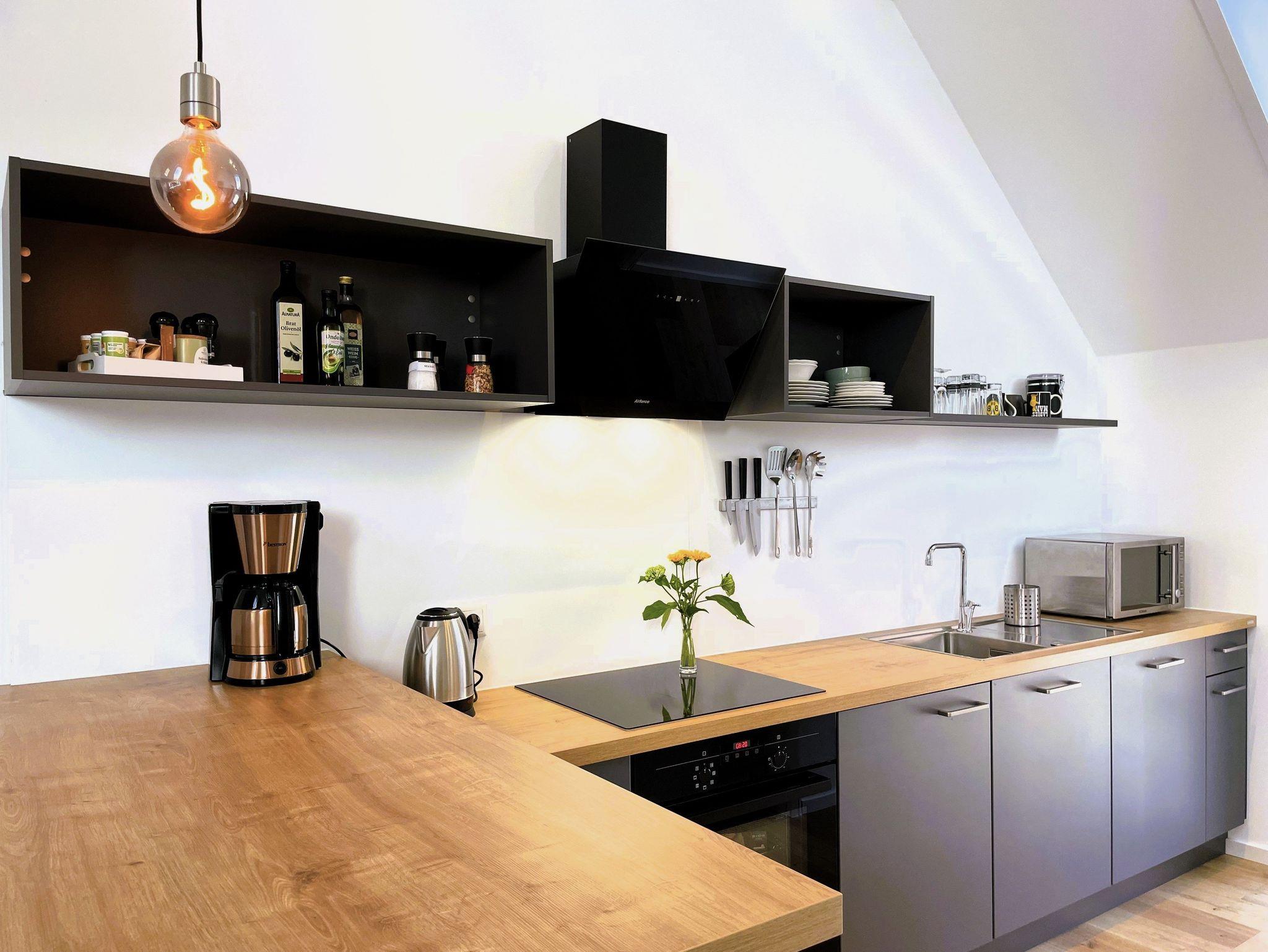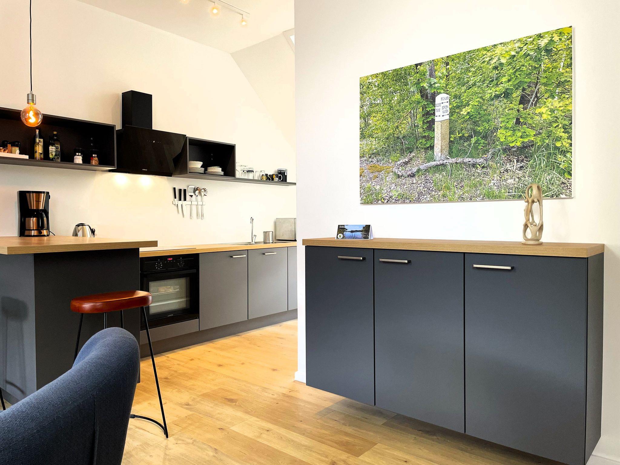 Ein separater Eingang führt direkt zur Unterkunft, wo auch Fahrräder sicher abgestellt und E-Bikes aufgeladen werden können. Die offene, modern gestaltete Küche ist bestens ausgestattet ? mit Kühlschrank, Gefriermöglichkeit, Spülmaschine, Backofen, Mikrowelle, Kaffeemaschine und Wasserkocher. Alle Einrichtungselemente sind zeitgemäß und farblich harmonisch abgestimmt.