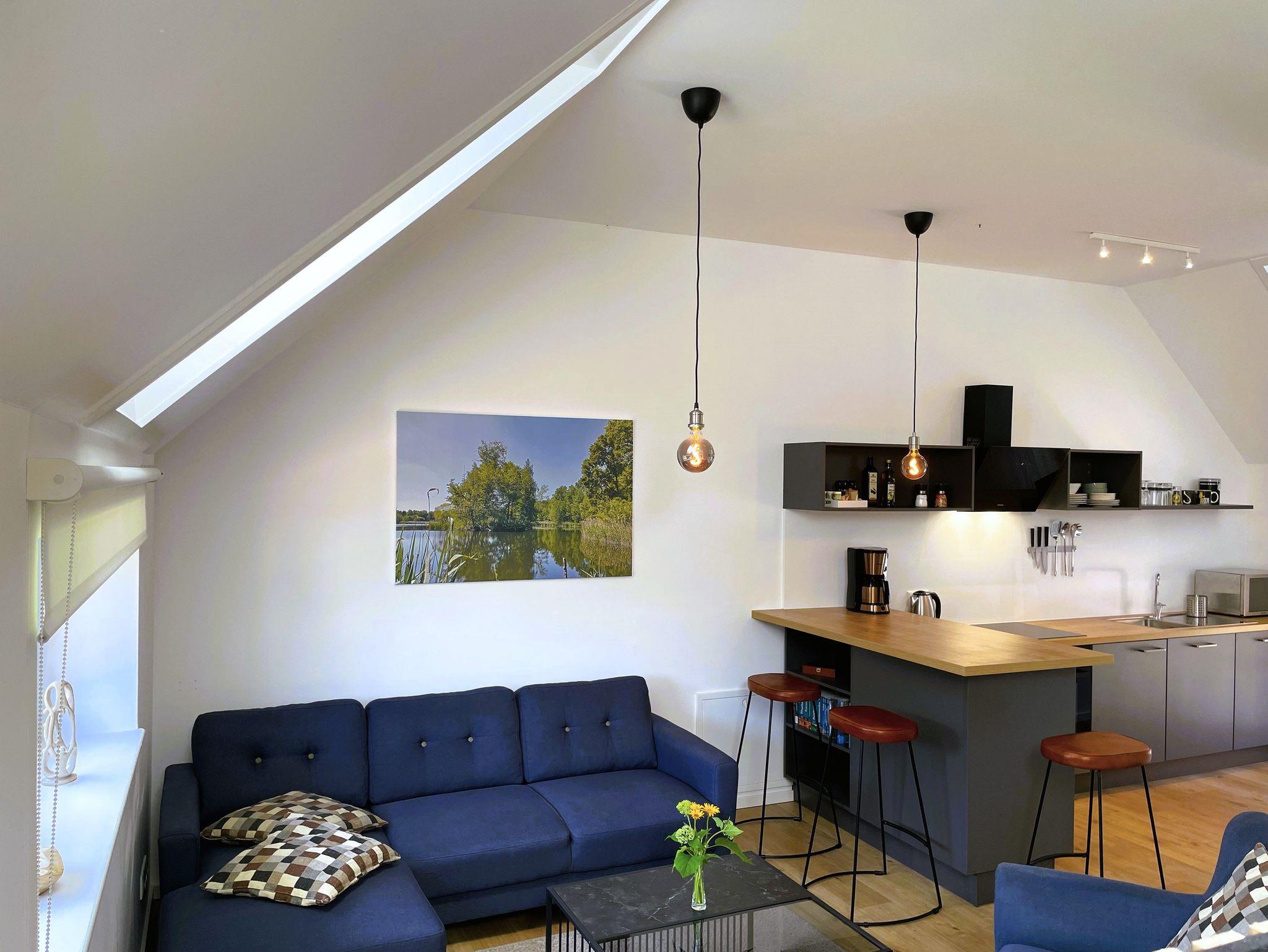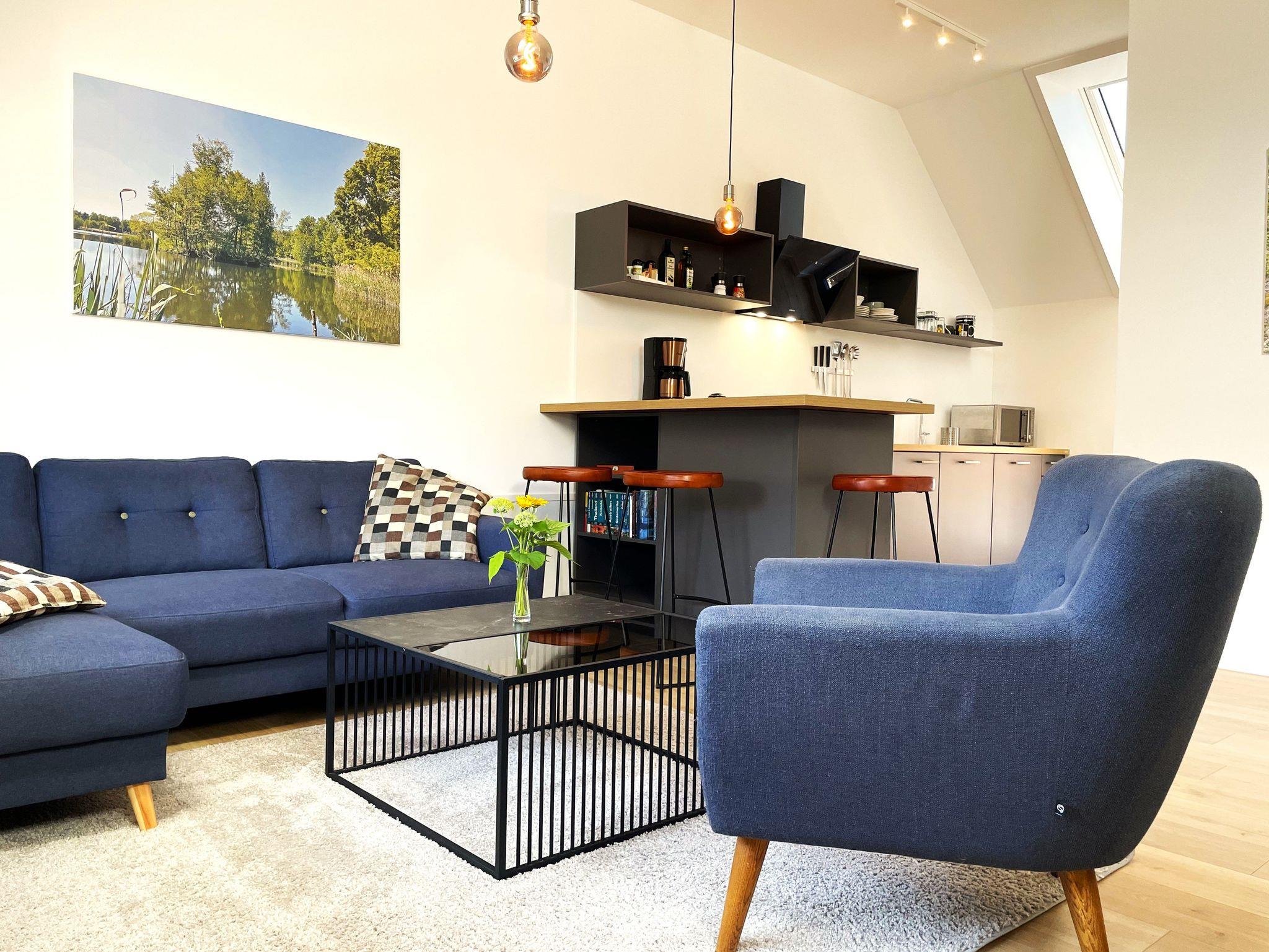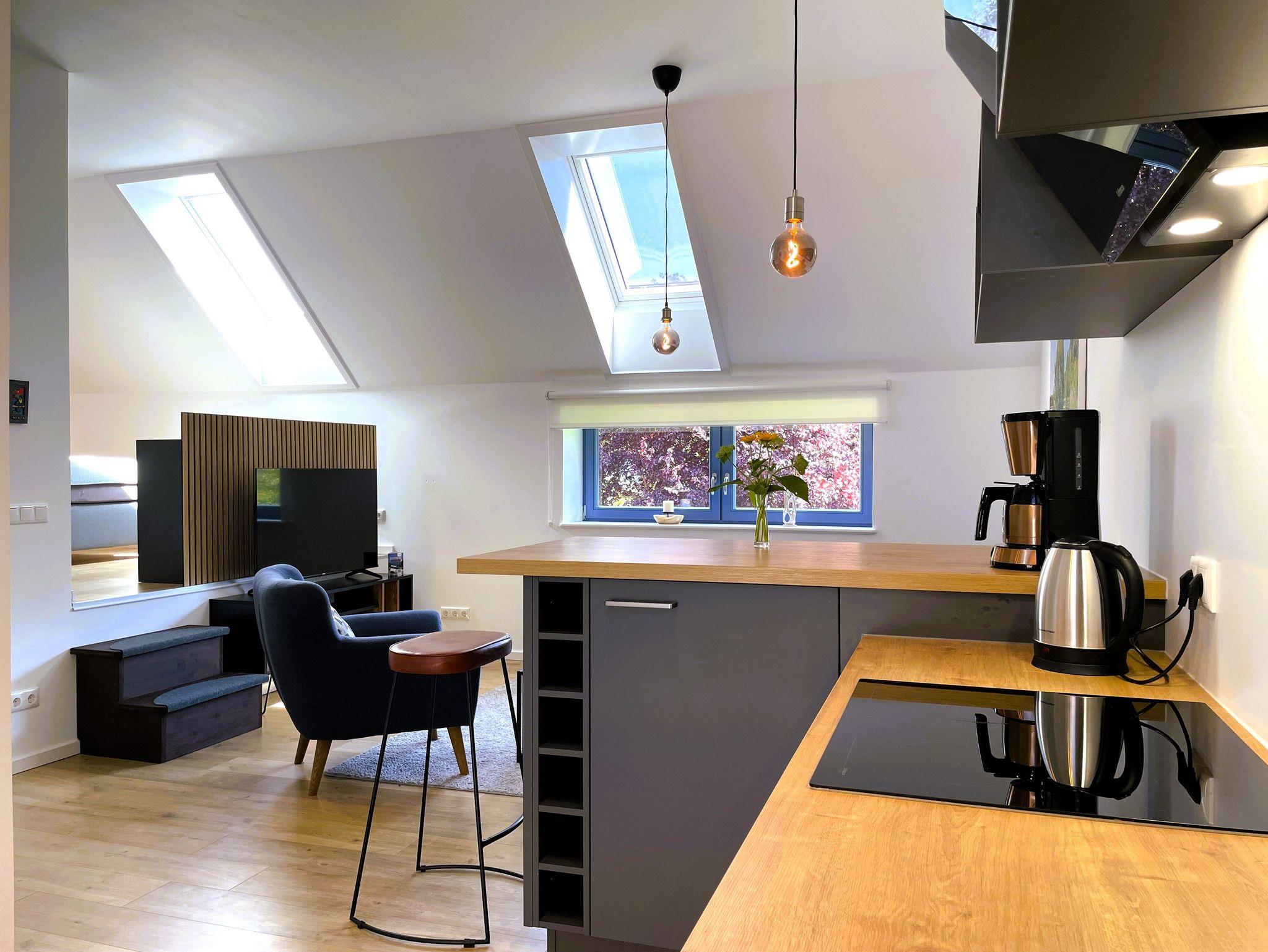 Ein separater Eingang führt direkt zur Unterkunft, wo auch Fahrräder sicher abgestellt und E-Bikes aufgeladen werden können. Die offene, modern gestaltete Küche ist bestens ausgestattet ? mit Kühlschrank, Gefriermöglichkeit, Spülmaschine, Backofen, Mikrowelle, Kaffeemaschine und Wasserkocher. Alle Einrichtungselemente sind zeitgemäß und farblich harmonisch abgestimmt.