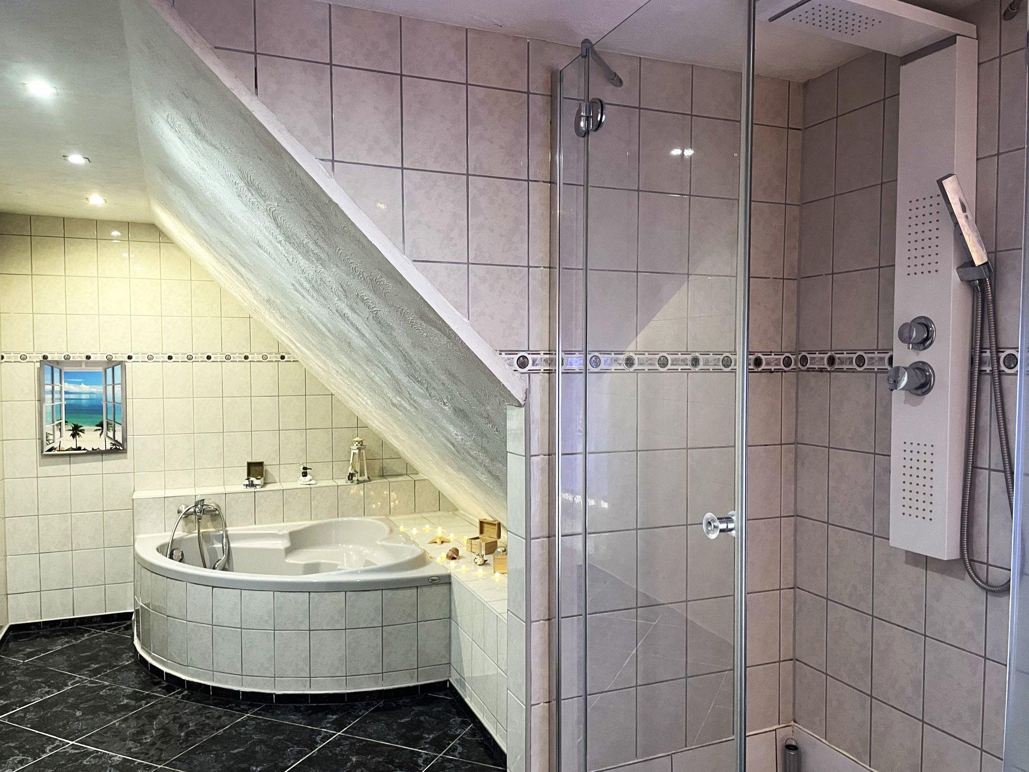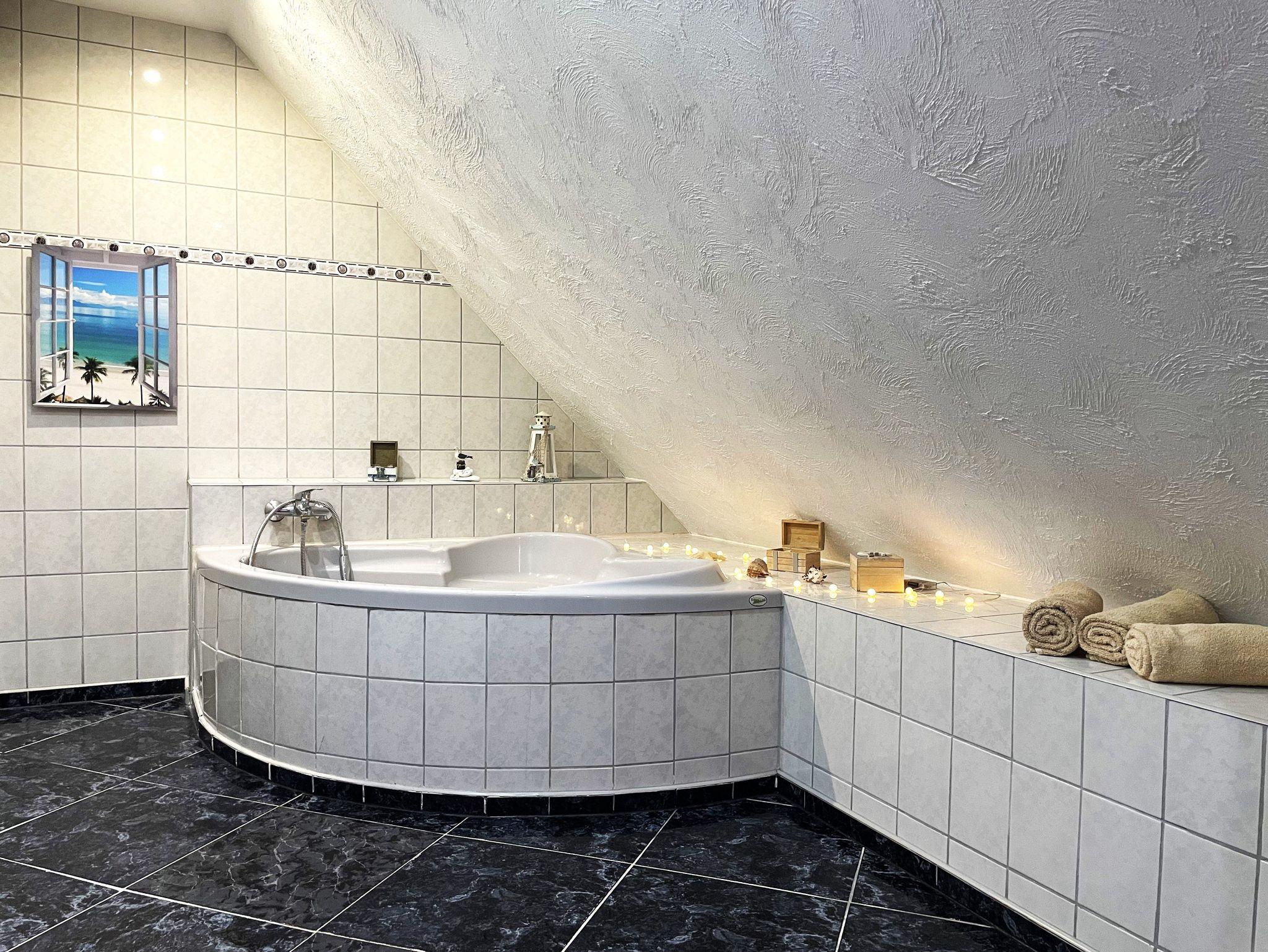 Die Ferienwohnung verfügt über ein Badezimmer mit Waschtisch und WC. Ein weiteres Badezimmer bietet eine Eckbadewanne und eine Dusche sowie eine Waschmaschine für Ihren Komfort.