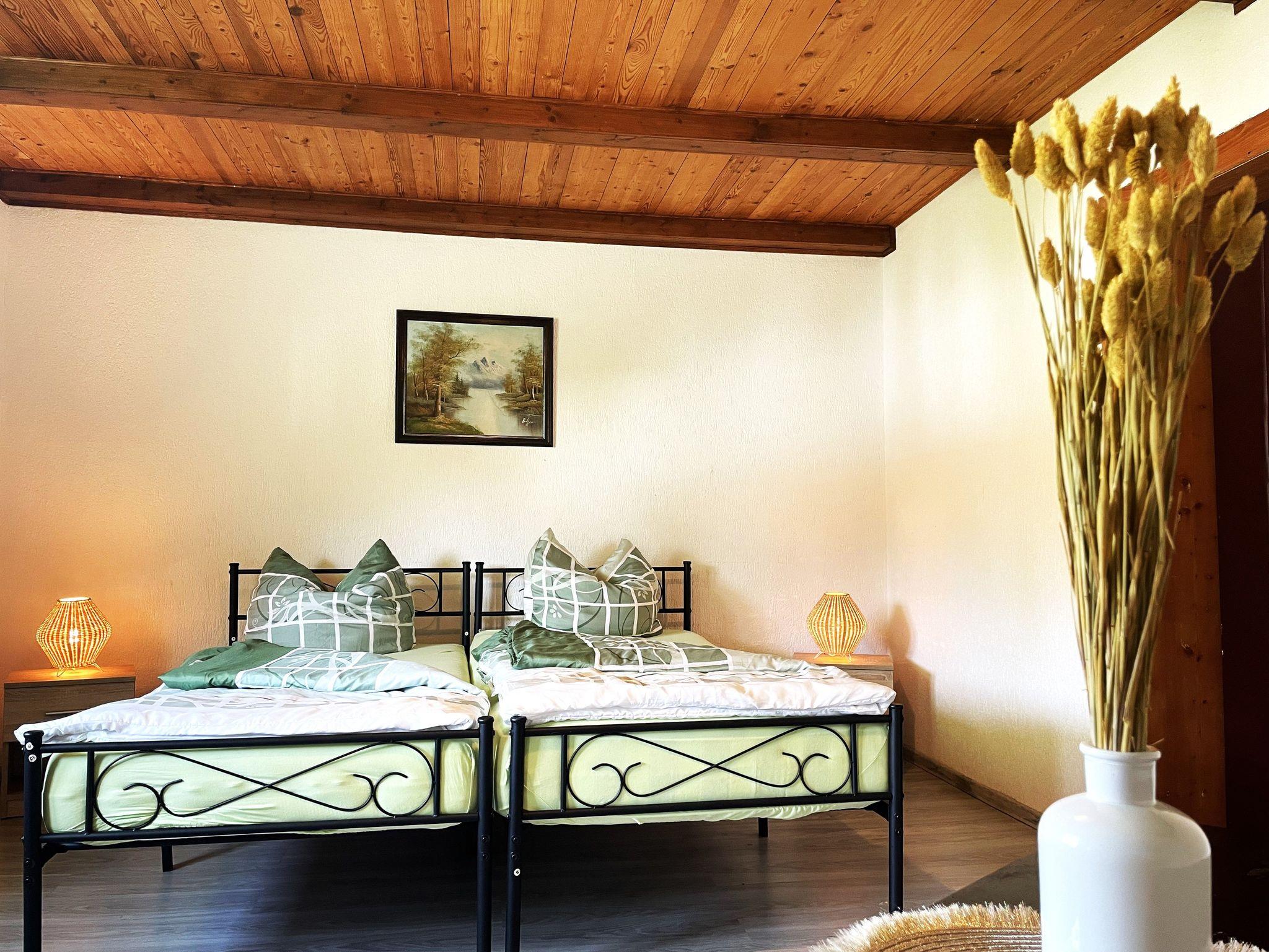 Die 90 m² große Nichtraucher-Ferienwohnung befindet sich im 1. Stock und bietet bequem Platz für bis zu 7 Personen. Die Wohnung verfügt über zwei getrennte Schlafzimmer. Das erste Schlafzimmer befindet sich direkt in der Ferienwohnung und ist mit zwei Betten, einem geräumigen Kleiderschrank und einem Schlafsofa für eine weitere Person ausgestattet. Dieses Zimmer ist ideal für diejenigen, die Privatsphäre und Komfort schätzen.