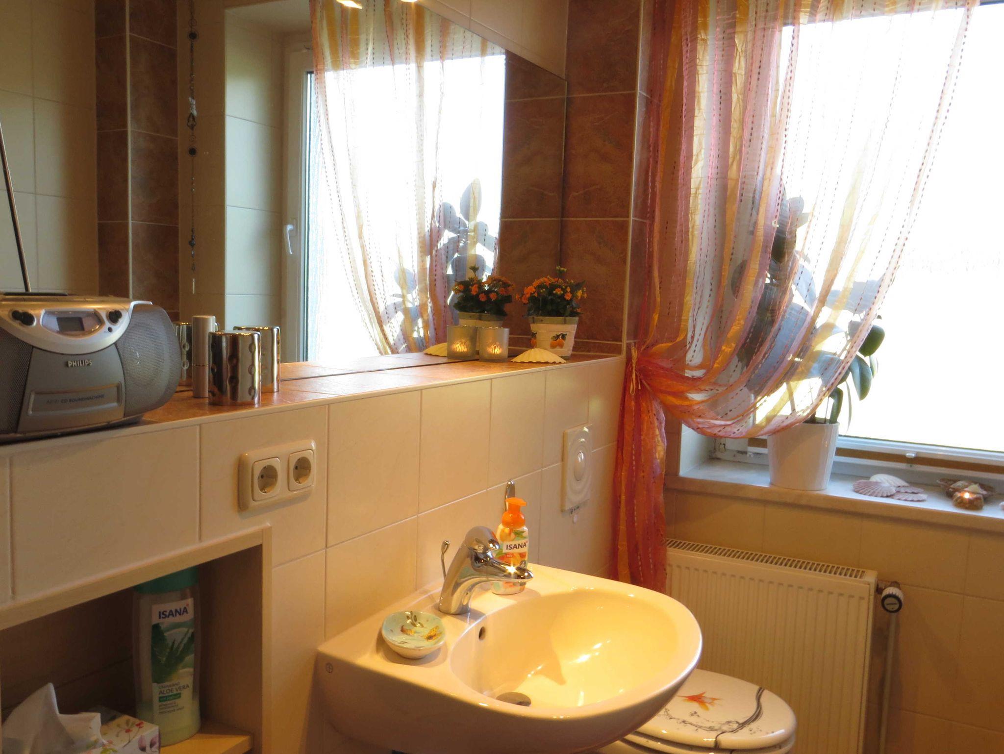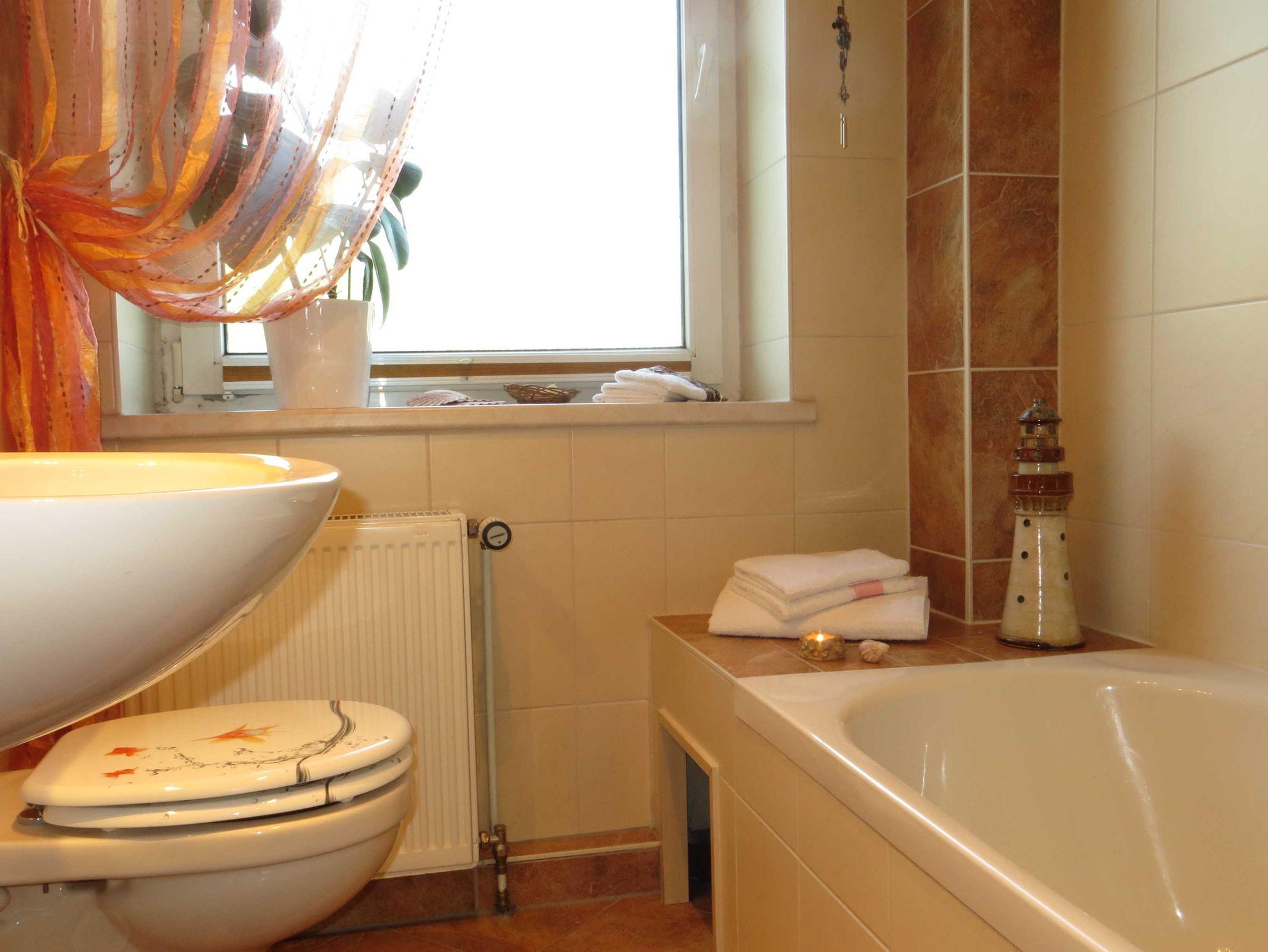Das Bad ist mit Badewanne und Duschwand, Waschbecken und WC ausgestattet.