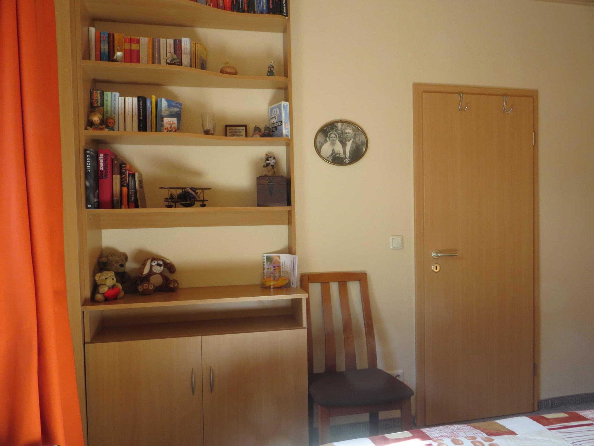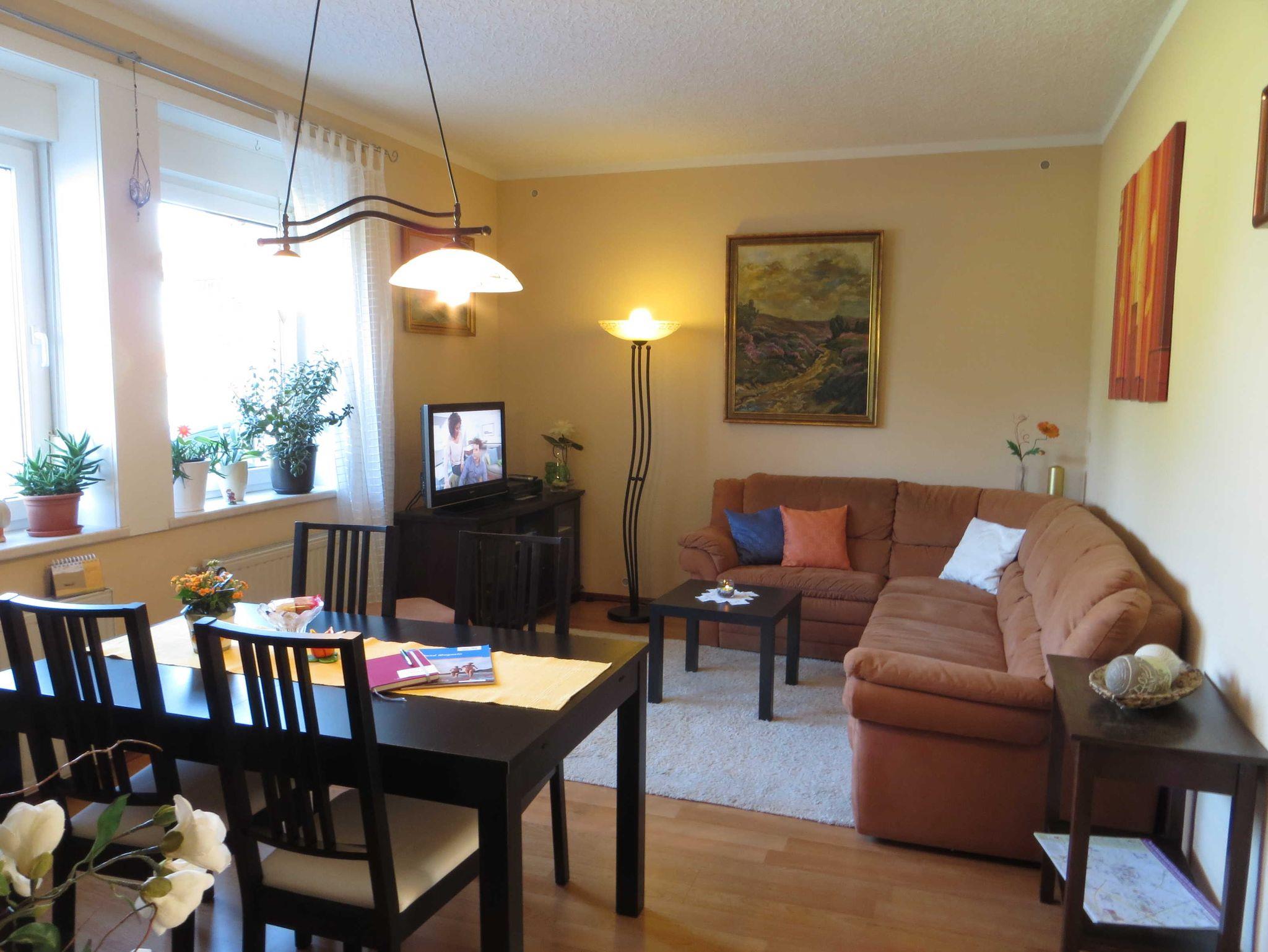 Die gemütlich eingerichtete 2-Raum Gästewohnung (50 qm) befindet sich im Erdgeschoss und ist über einen separatem Eingang zugänglich. Sie hat ein separates Schlafzimmer, Wohnzimmer, separate offene Küche, sowie ein Badezimmer mit Badewanne, Waschmaschine (gegen Gebühr nutzbar) und Haartrockner. Zur Ausstattung der Wohnung gehören ein Flachbild-TV, CD-Player, Radio und Wecker. Im Schlafzimmer steht ein Doppelbett. Im Wohnbereich ist eine Aufbettung (Luftgästebett) für 2 Personen möglich. Zusätzlich kann eine Person das Sofa als Aufbettung nutzen. Die Küche ist mit Kühlschrank, Backofen und Geschirrspüler ausgestattet. Eine Terrasse mit Grillmöglichkeit lädt zum Verweilen und Entspannen ein.