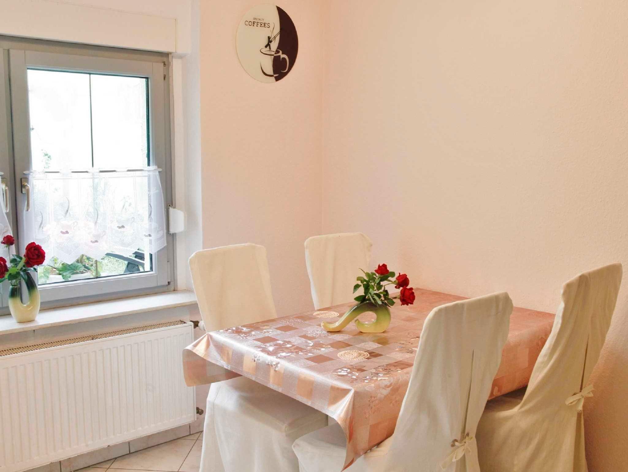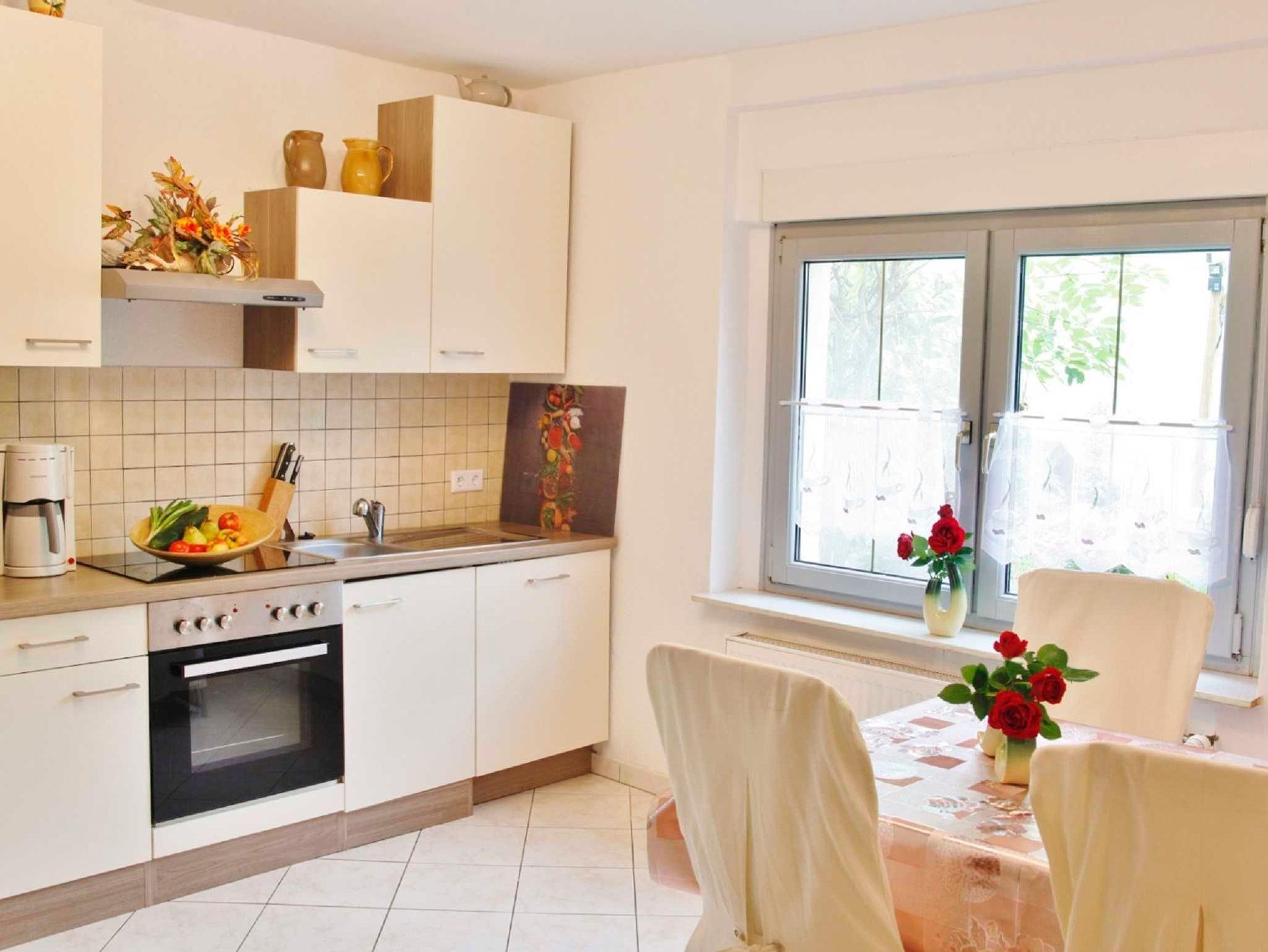 Die Wohnküche ist mit einer kompletten Küchenzeile eingerichtet. Zur Ausstattung gehören ein Kühlschrank mit Gefrierfach, Spülmaschine, Herd, Mikrowelle, Kaffeemaschine, Toaster und ein Eierkocher. Eine Sitzecke für 4 Personen, abgestimmt in hellrosé Farbton und mit Glitzer-Effekt gehört zur Einrichtung.