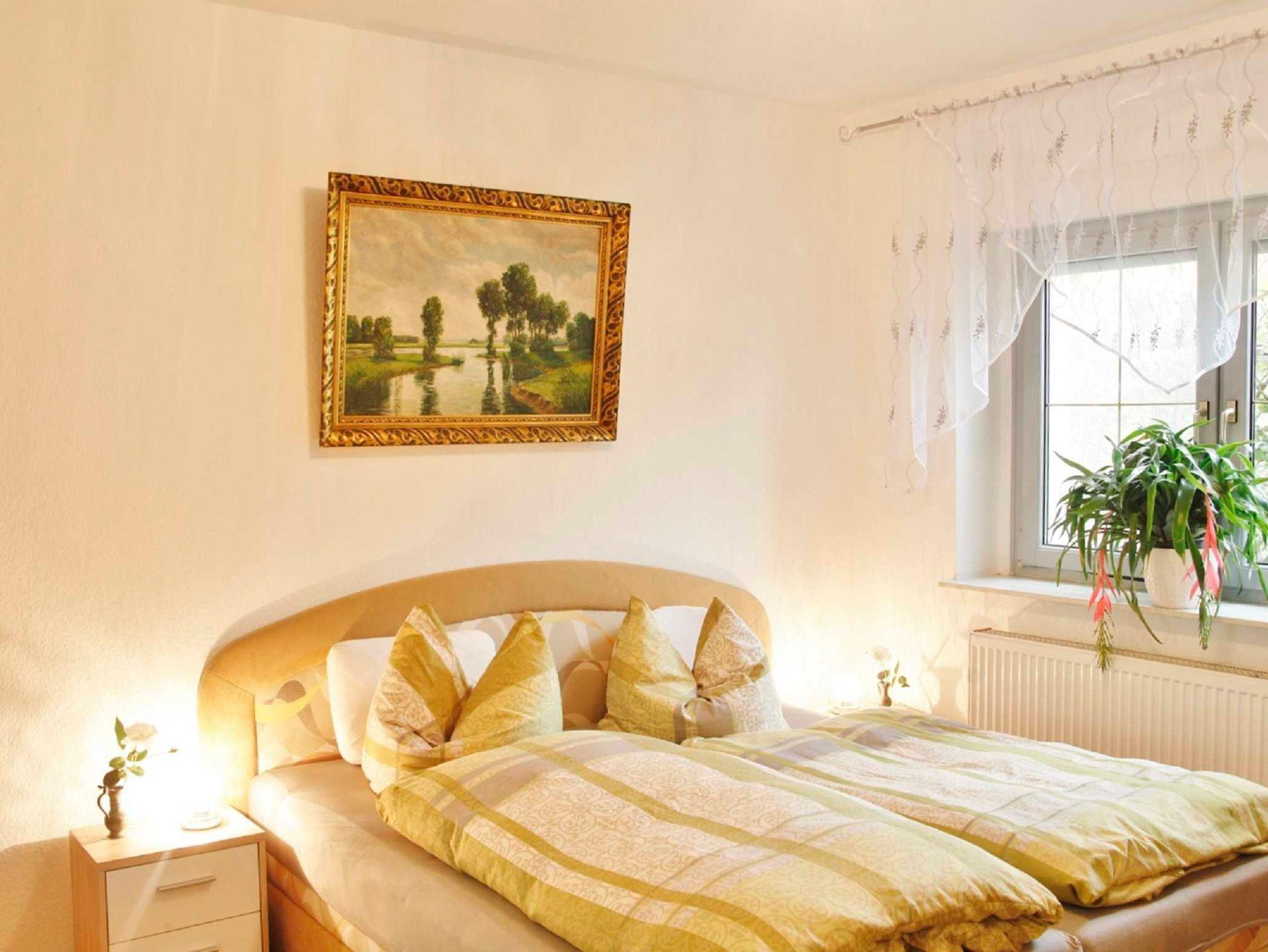 Im Schlafzimmer finden Gäste ein Doppelbett mit Nachtschränken, eine Kommode mit Spiegel sowie einen Ganzkörperspiegel, 2 helle Stühle und ein grüner Teppich rundet das Zimmer ab. Auch die grau glitzernde tapezierte Wand dient für ein gemütliches Wohlbefinden.