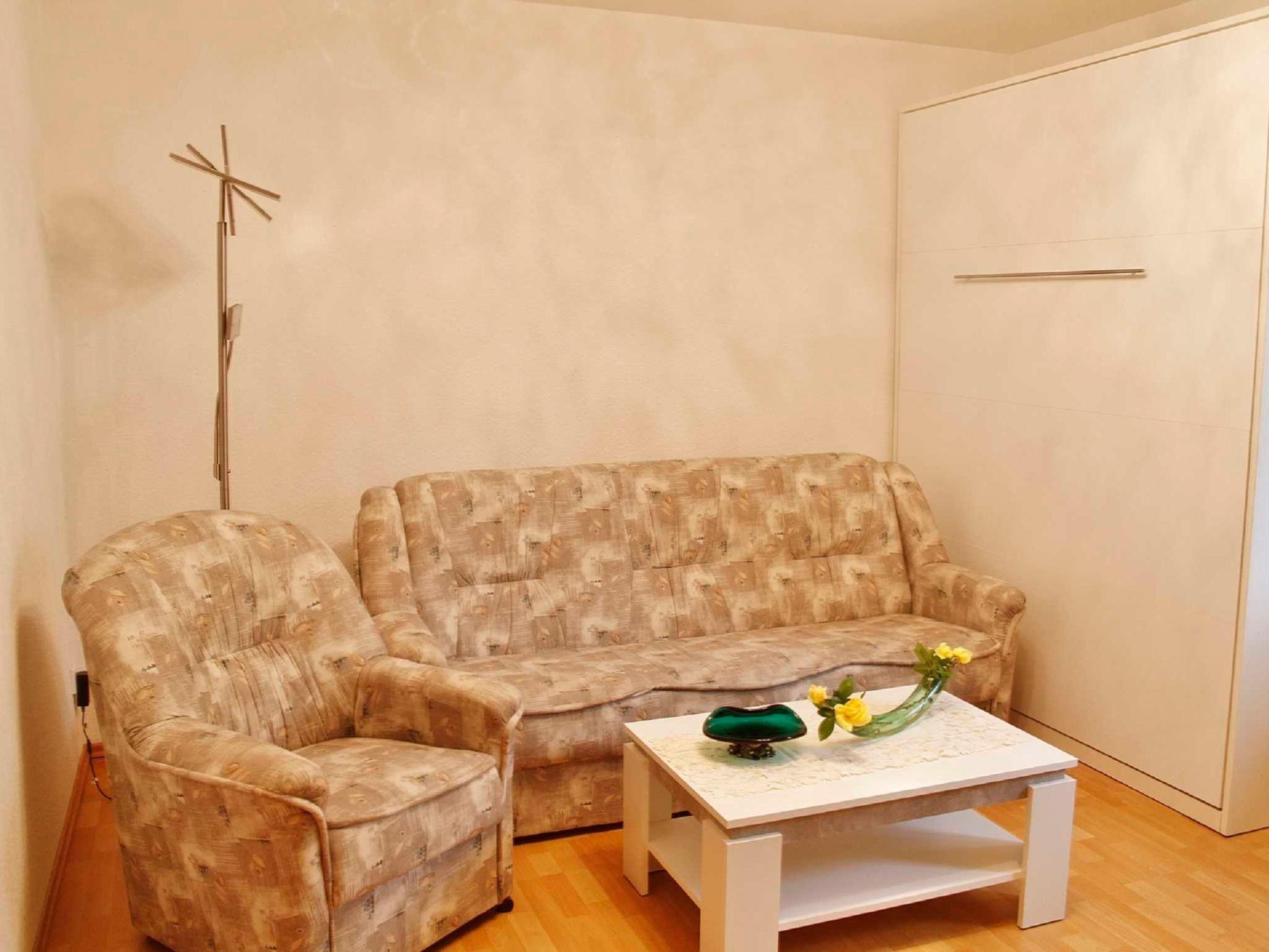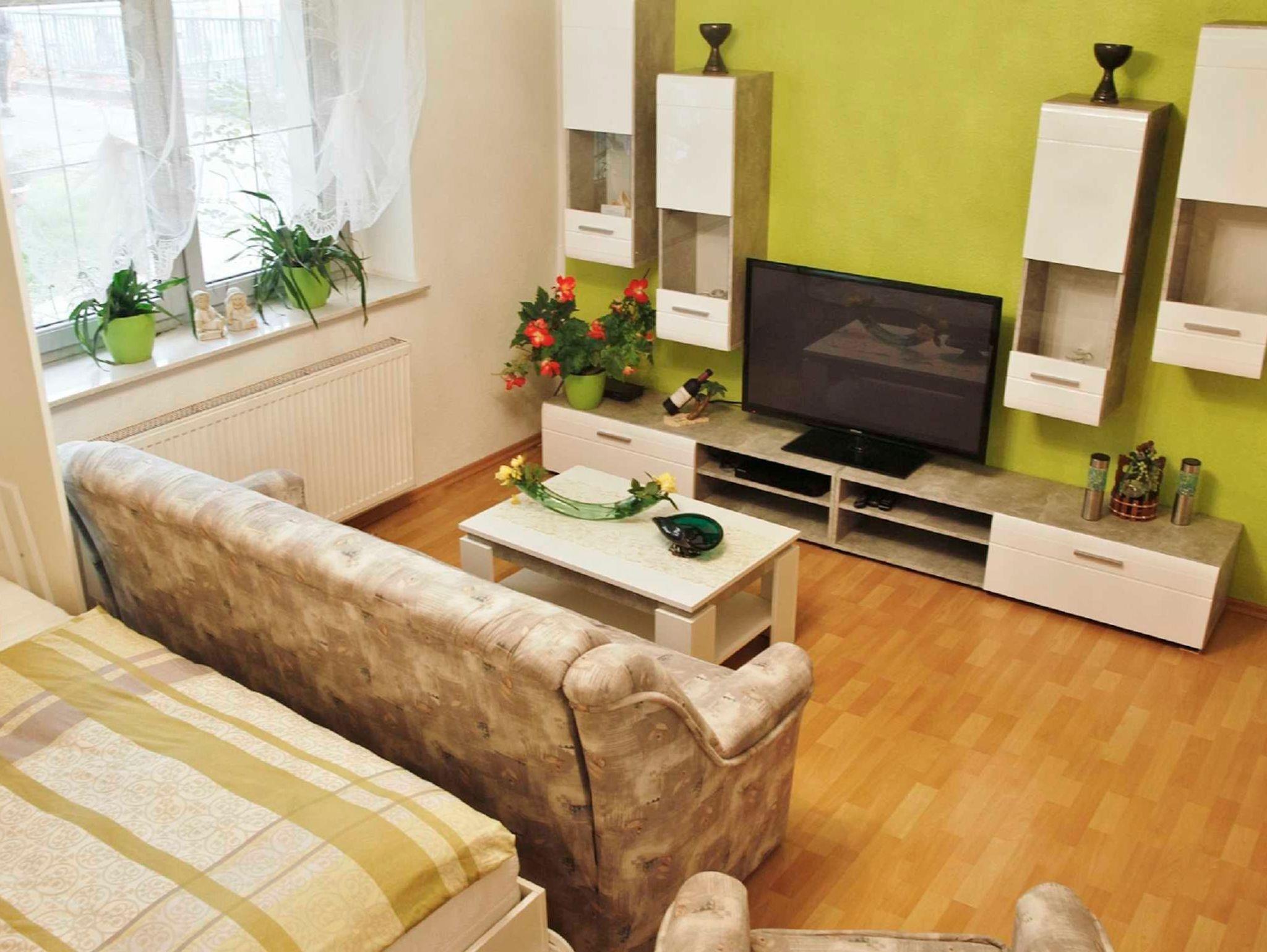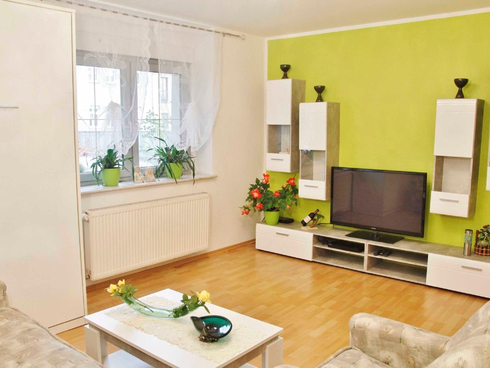 Das gemütliche Wohnzimmer erzeugt eine warme Ausstrahlung durch eine grün gemalerte Wand, die hellen Möbel runden das Gesamtbild ab und sorgen so für ein angenehmes Raumgefühl. Zur Einrichtung gehört eine moderne Anbauwand,ein 3-Sitzer mit Sessel, Couchtisch sowie ein Schrankbett. Dieses ist 1,60m x 2m groß und dient für 2 weitere Schlafplätze.