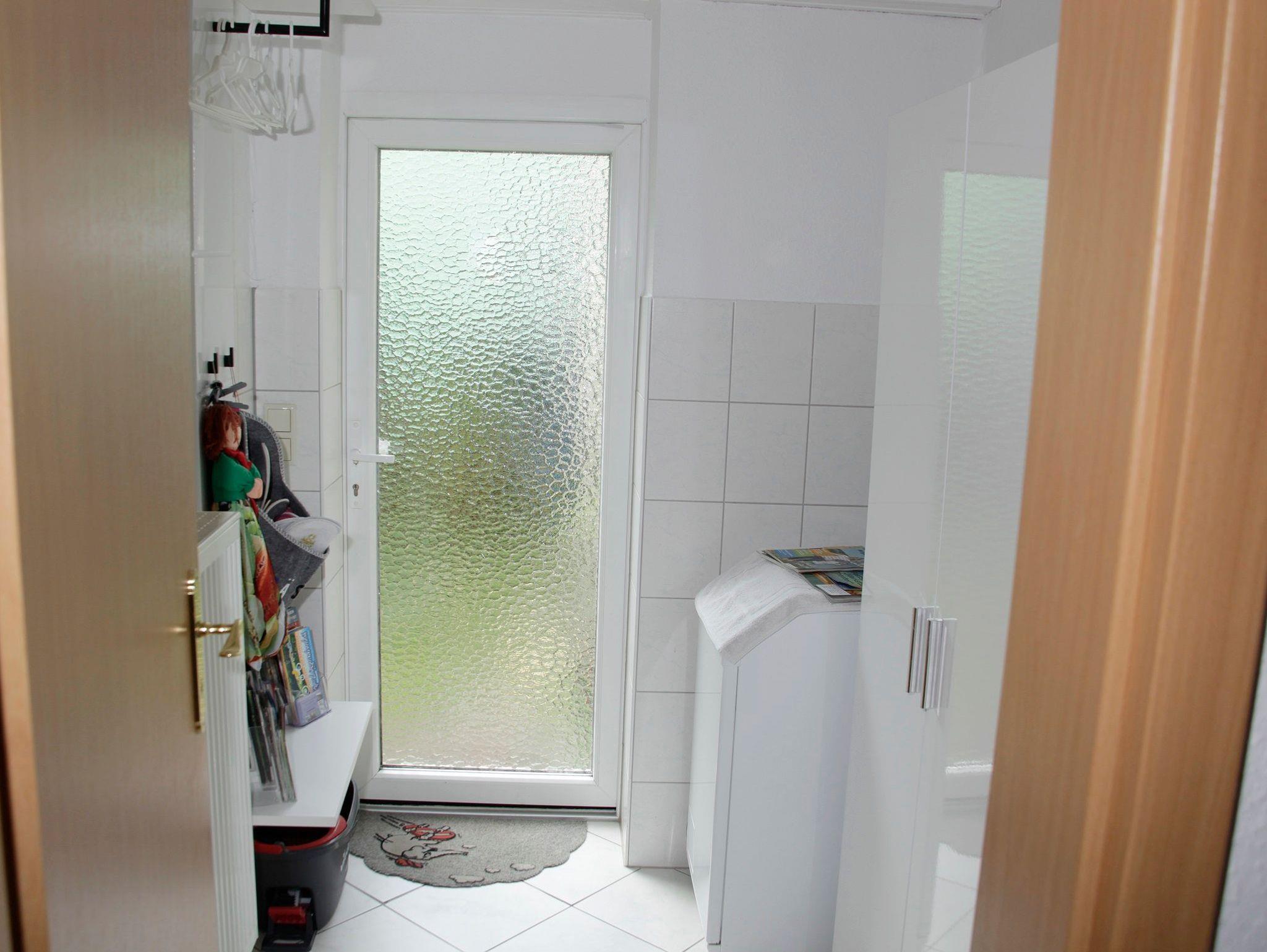 Die Garderobe ist sehr hell, hier finden Urlauber eine Kommode und einen kleinen Kleiderschrank. Durch das Garderobenzimmer gelangt man direkt in den schon erwähnten Innenhof