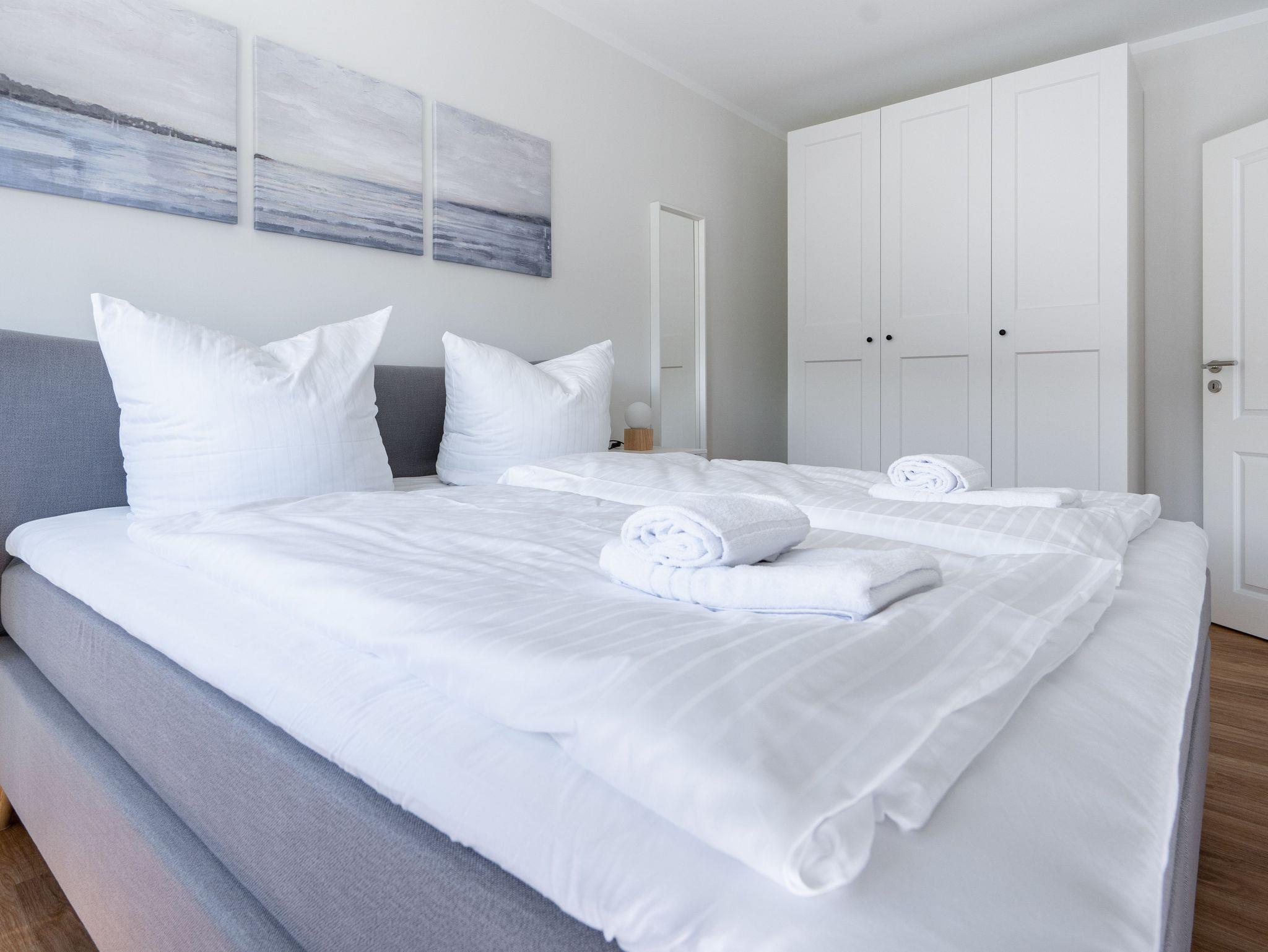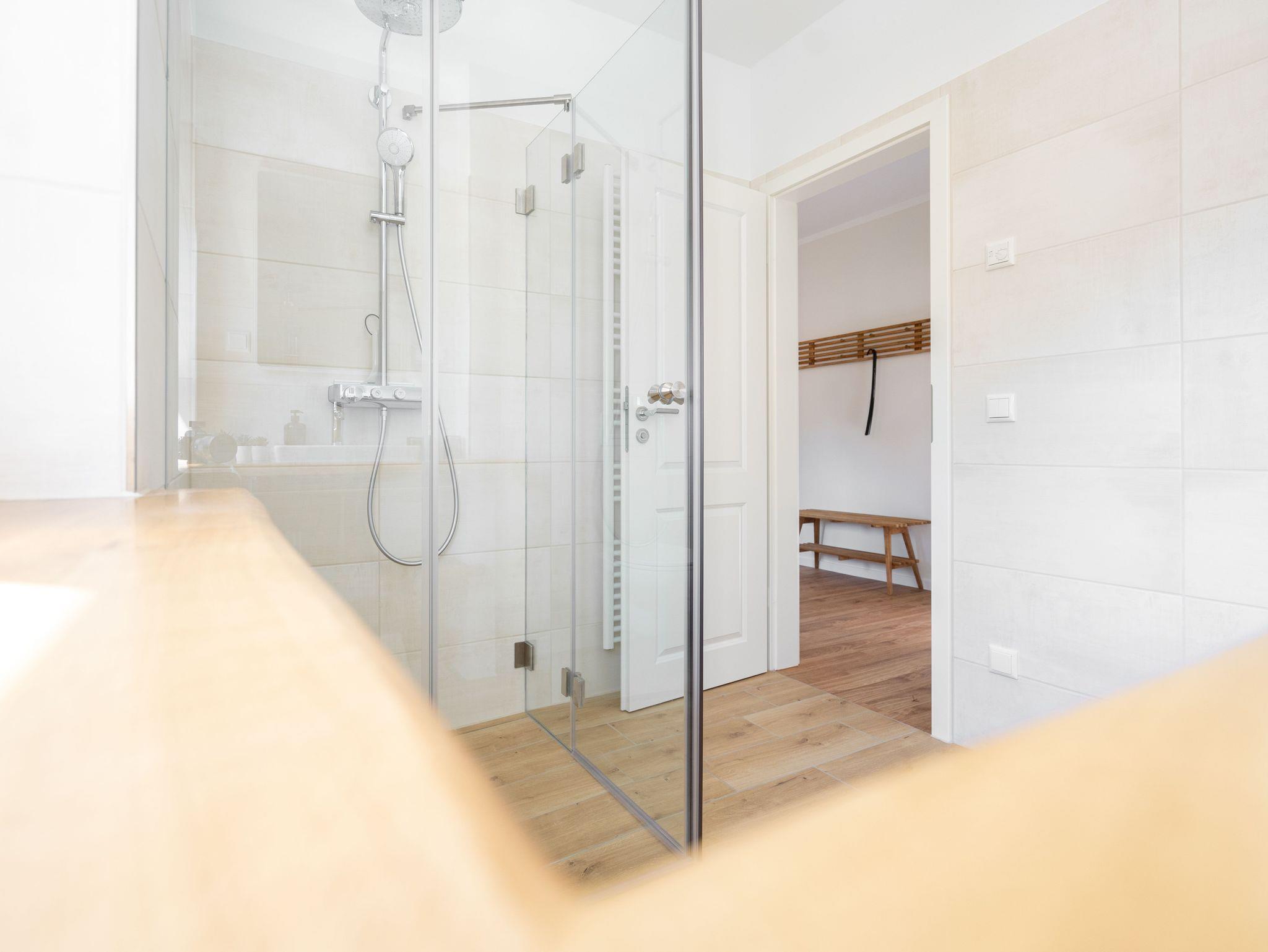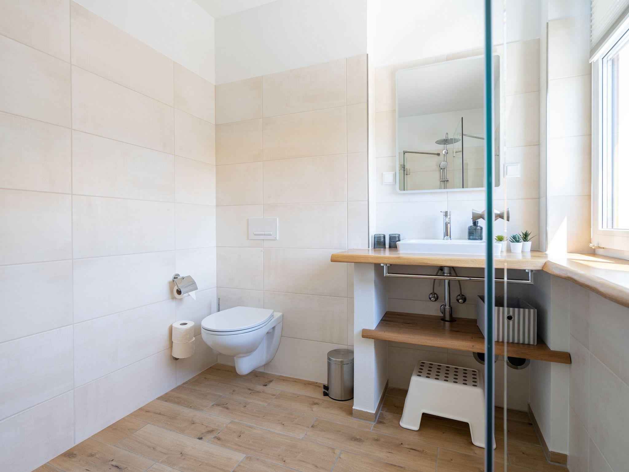 Unser charmantes Apartment Annemarie liegt im Obergeschoss des Neubaus und verfügt über 2 getrennte Schlafräume mit je einem Doppelbett. Es bietet Platz auf 68m² und hat einen üppigen Balkon, der zum Sonnenbaden einlädt, mit tollem Ausblick hinunter in unseren kleinen Hofgarten. Egal ob auf dem gemütlichen Sofa oder am großen Esstisch, Annemarie lädt zum Verweilen von bis zu 4 Personen ein. Das helle Bad verfügt über eine ebenerdige Dusche und einem aus Eiche gefertigten Waschtisch mit integrierter Fensterbank.