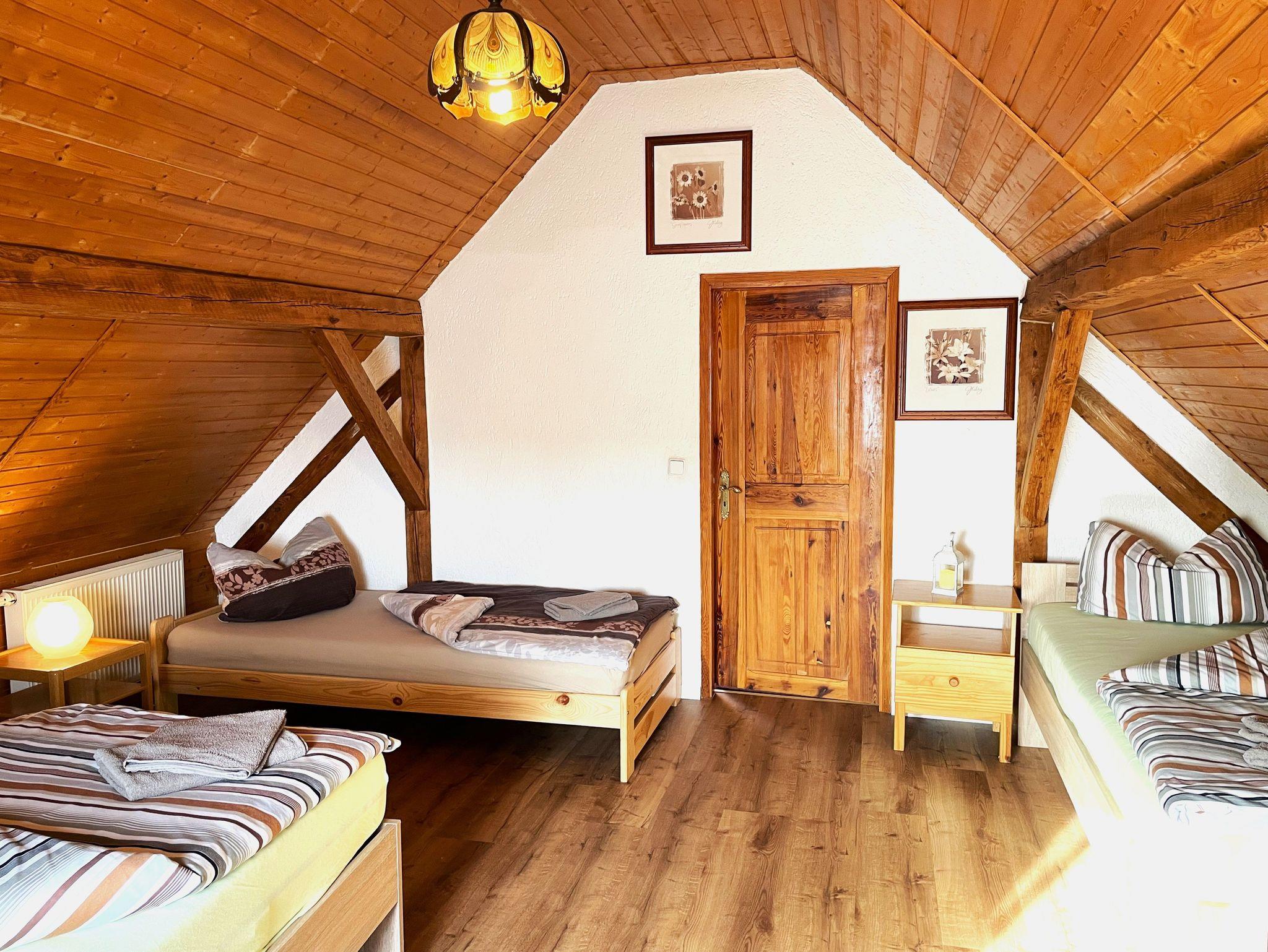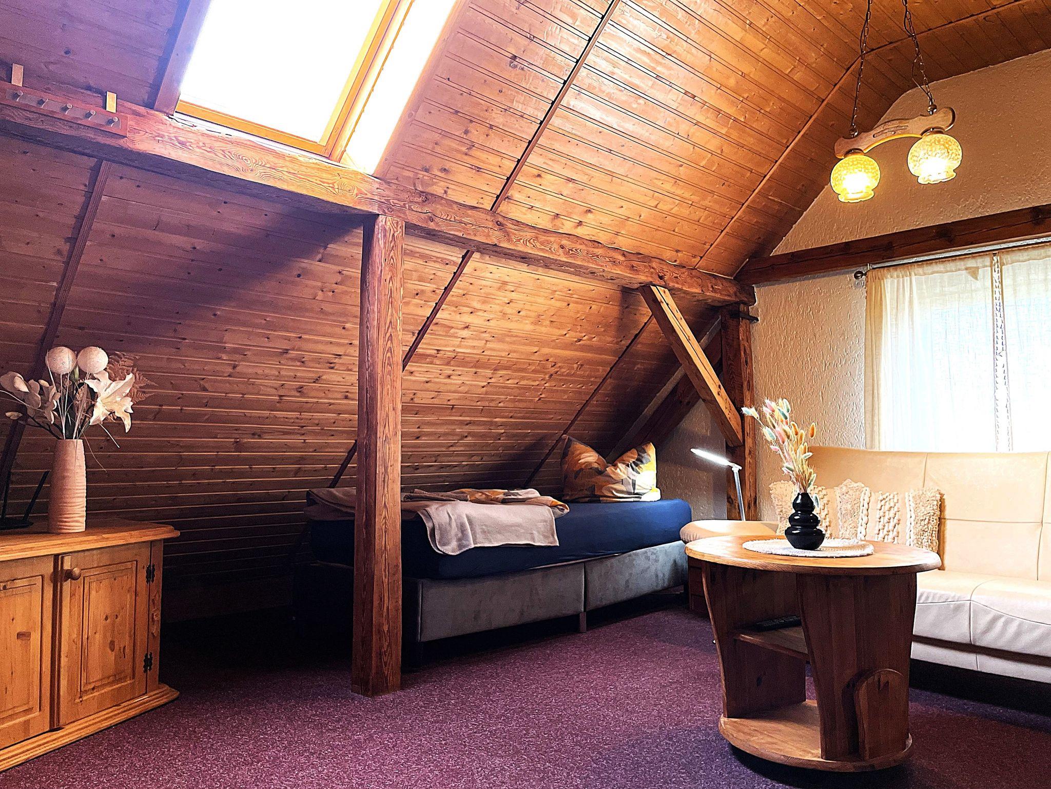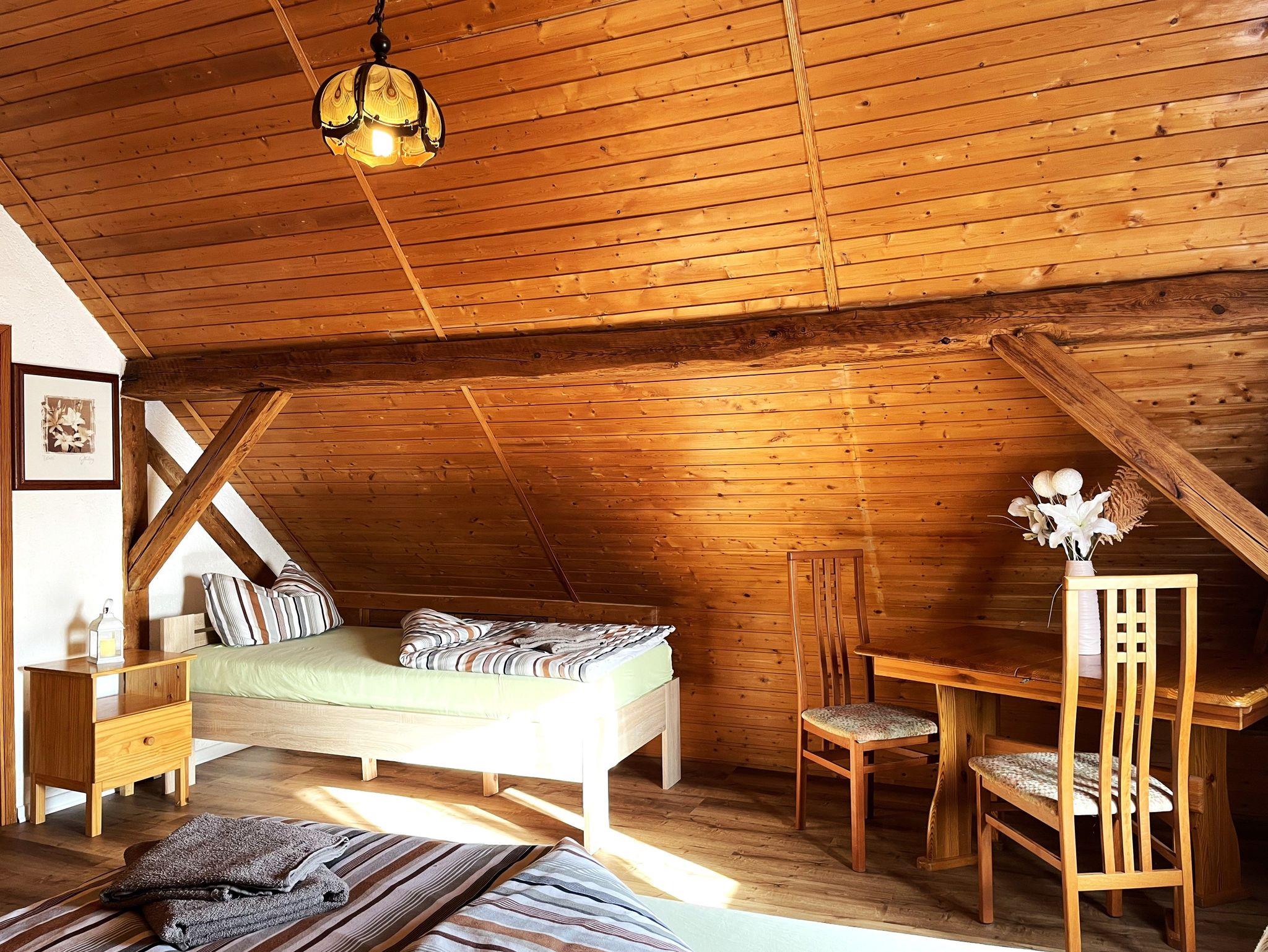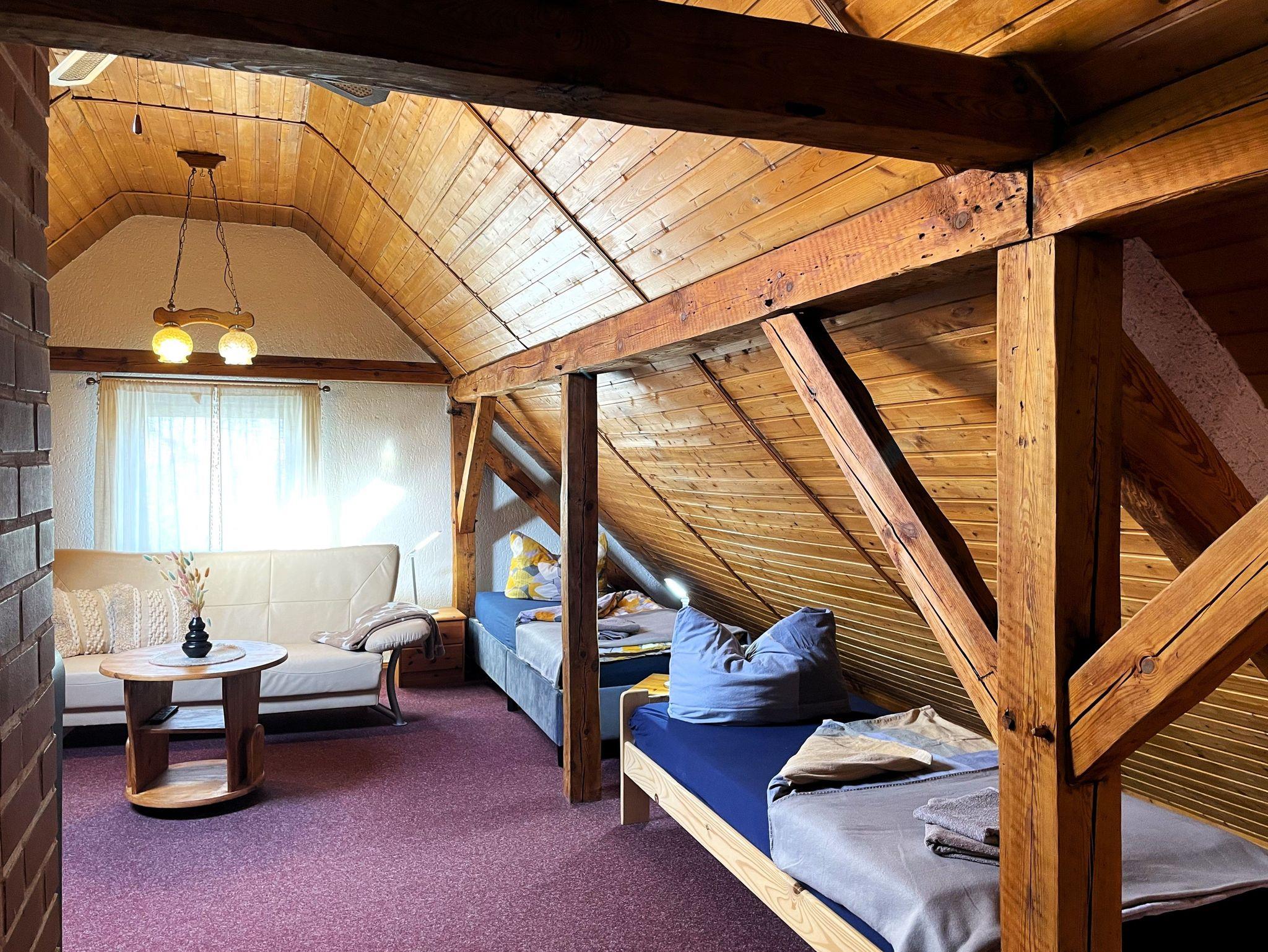 Die Ferienwohnung befindet sich im Dachgeschoss des Lausitzhofes und ist über eine Treppe erreichbar. Diese gemütliche Unterkunft bietet Platz für bis zu 6 Personen und besticht durch ihre warme Atmosphäre, die durch die vollständige Verkleidung mit Holzpaneelen im Dachgeschoss entsteht.