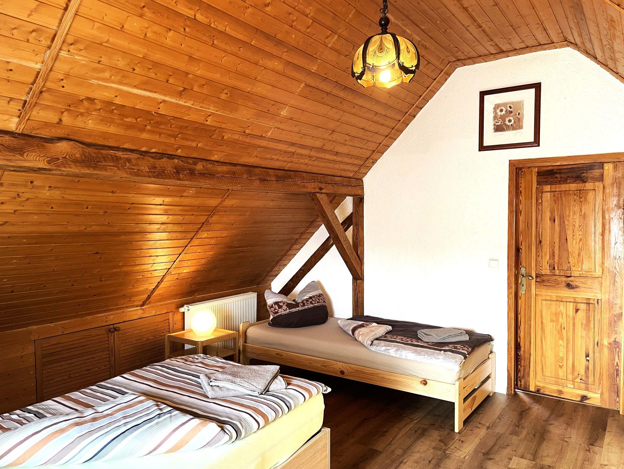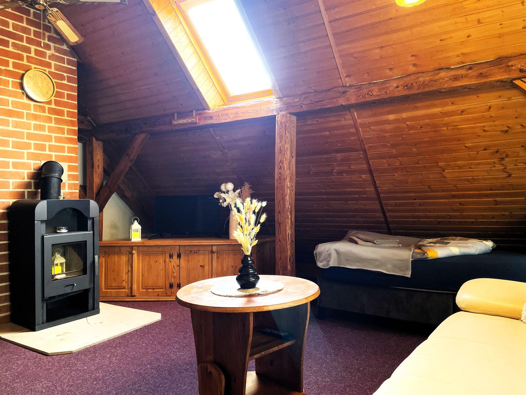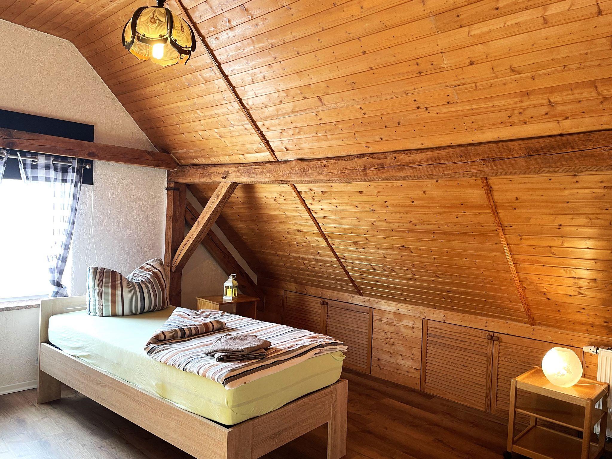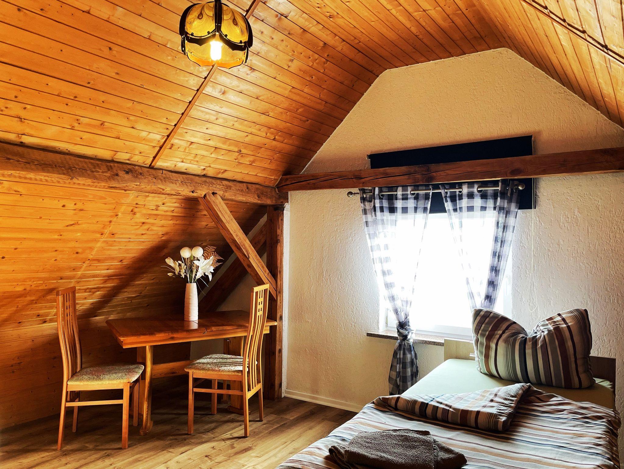 Die Ferienwohnung befindet sich im Dachgeschoss des Lausitzhofes und ist über eine Treppe erreichbar. Diese gemütliche Unterkunft bietet Platz für bis zu 6 Personen und besticht durch ihre warme Atmosphäre, die durch die vollständige Verkleidung mit Holzpaneelen im Dachgeschoss entsteht.