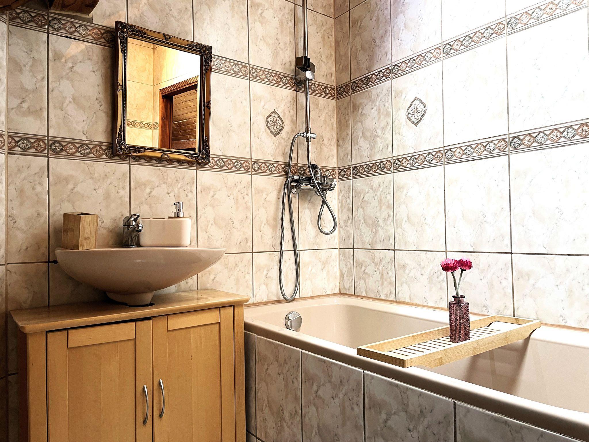 Das Badezimmer ist funktional und komfortabel eingerichtet, mit einer Badewanne, einem Waschbecken und einem WC.