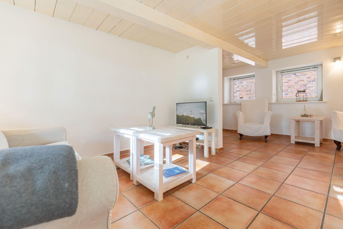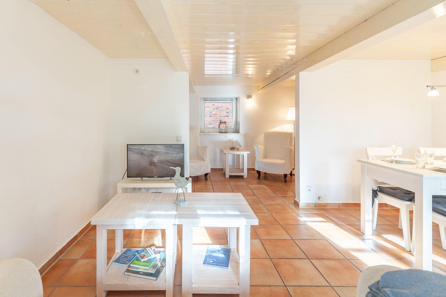 Das gemütliche Wohnzimmer mit bequemen Sofas, Flachbild-TV (SAT) und einem einladenden Essbereich lädt zu entspannten Stunden ein. Die offene Küche ist ausgezeichnet ausgestattet und bietet Ihnen alles, was Sie für Ihren Urlaub benötigen: Geschirrspüler, Kühlschrank mit Gefrierfach, Backofen, Cerankochfeld mit vier Kochplatten, Filterkaffeemaschine (Filtergröße 4), Wasserkocher und Toaster.