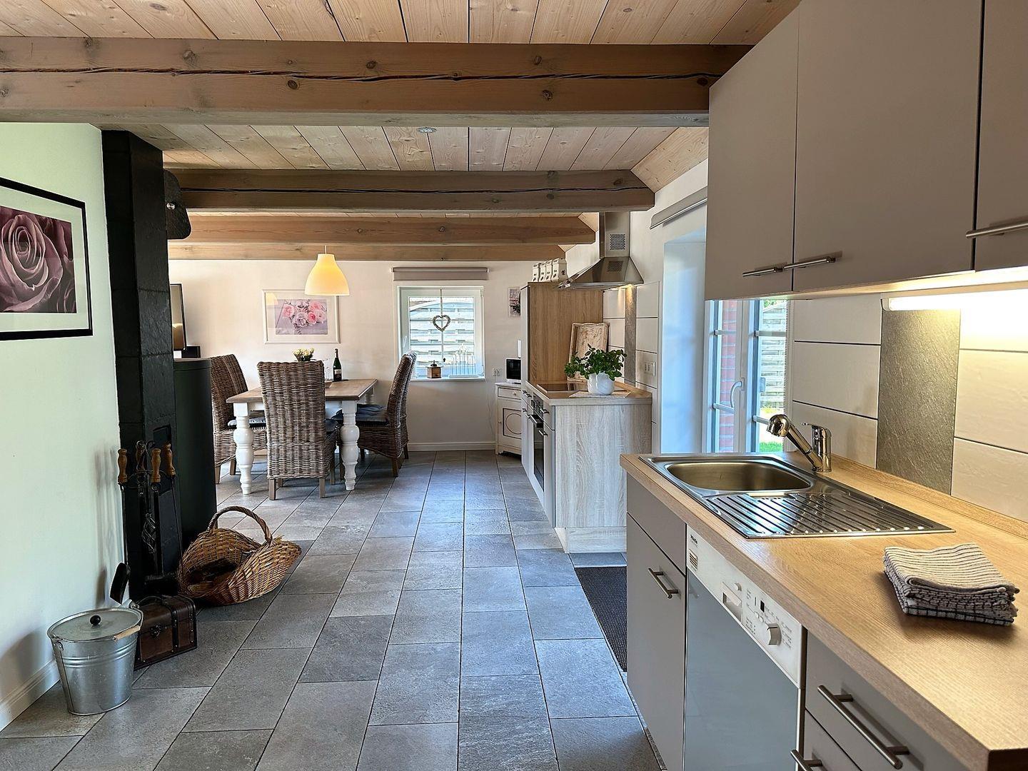 Die geräumige Unterkunft erstreckt sich auf zwei Etagen und bietet insgesamt vier Zimmer – drei gemütliche Schlafzimmer und ein helles Wohnzimmer, in dem sich die ganze Familie versammeln kann. Der offene Wohn- und Essbereich ist mit einer modernen, voll ausgestatteten Küche verbunden und lädt zu gemeinsamen Kochabenden ein. Hier findet jeder Platz am Esstisch, und die hochwertige Ausstattung sorgt dafür, dass es an nichts fehlt. Genießen Sie Ihren Kaffee am Morgen in der Sofaecke oder auf der großen Terrasse mit Blick auf die umliegende Natur.