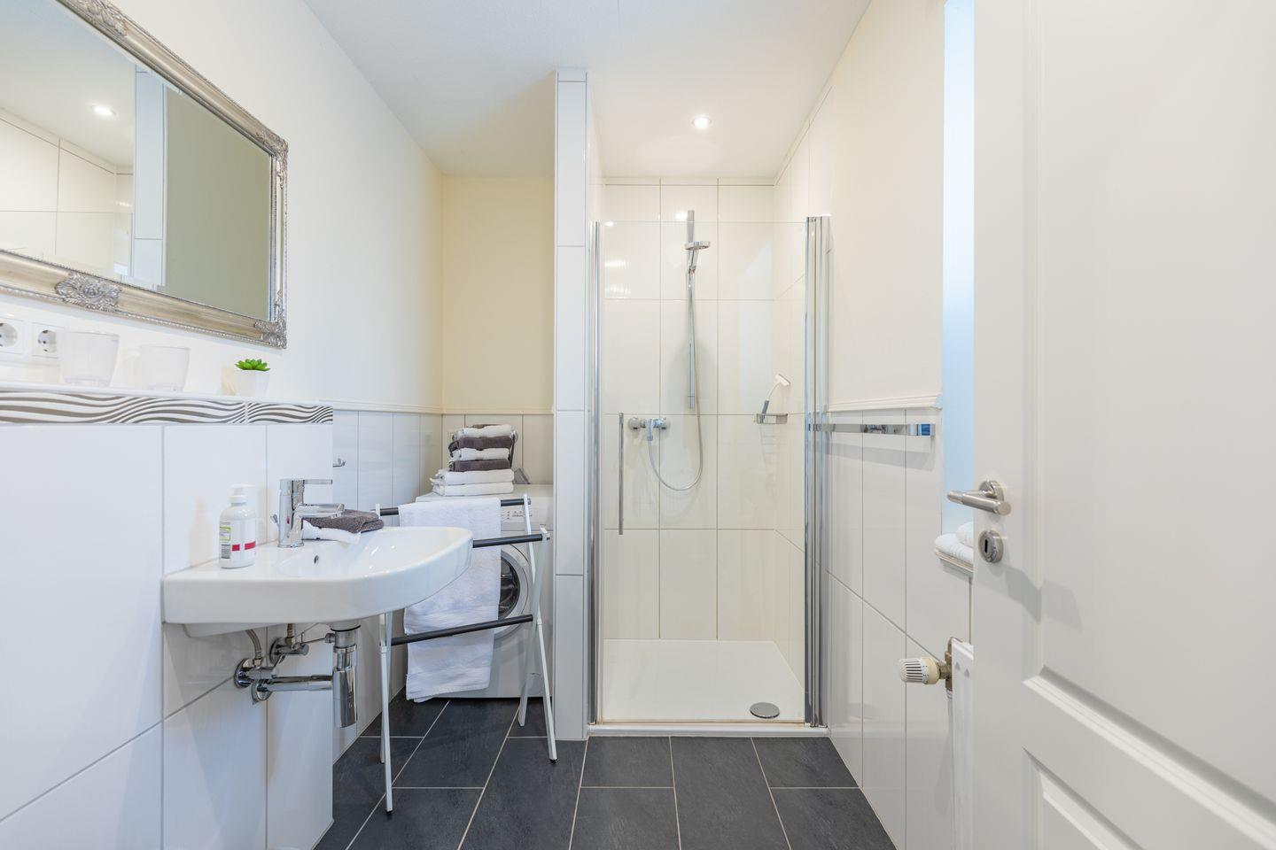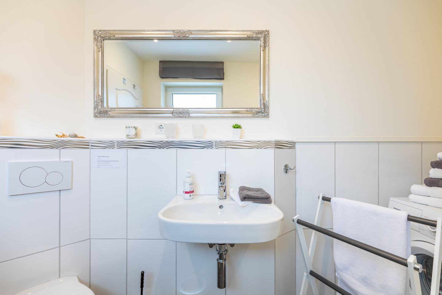 Das Haus verfügt über ein Badezimmer im Erdgeschoss mit Dusche, WC, Waschbecken, Spiegel, Fenster und Warmwasser sowie zusätzlich über ein separates Gäste-WC im Obergeschoss. Die Waschmaschine im Badezimmer steht Ihnen zur alleinigen Nutzung.