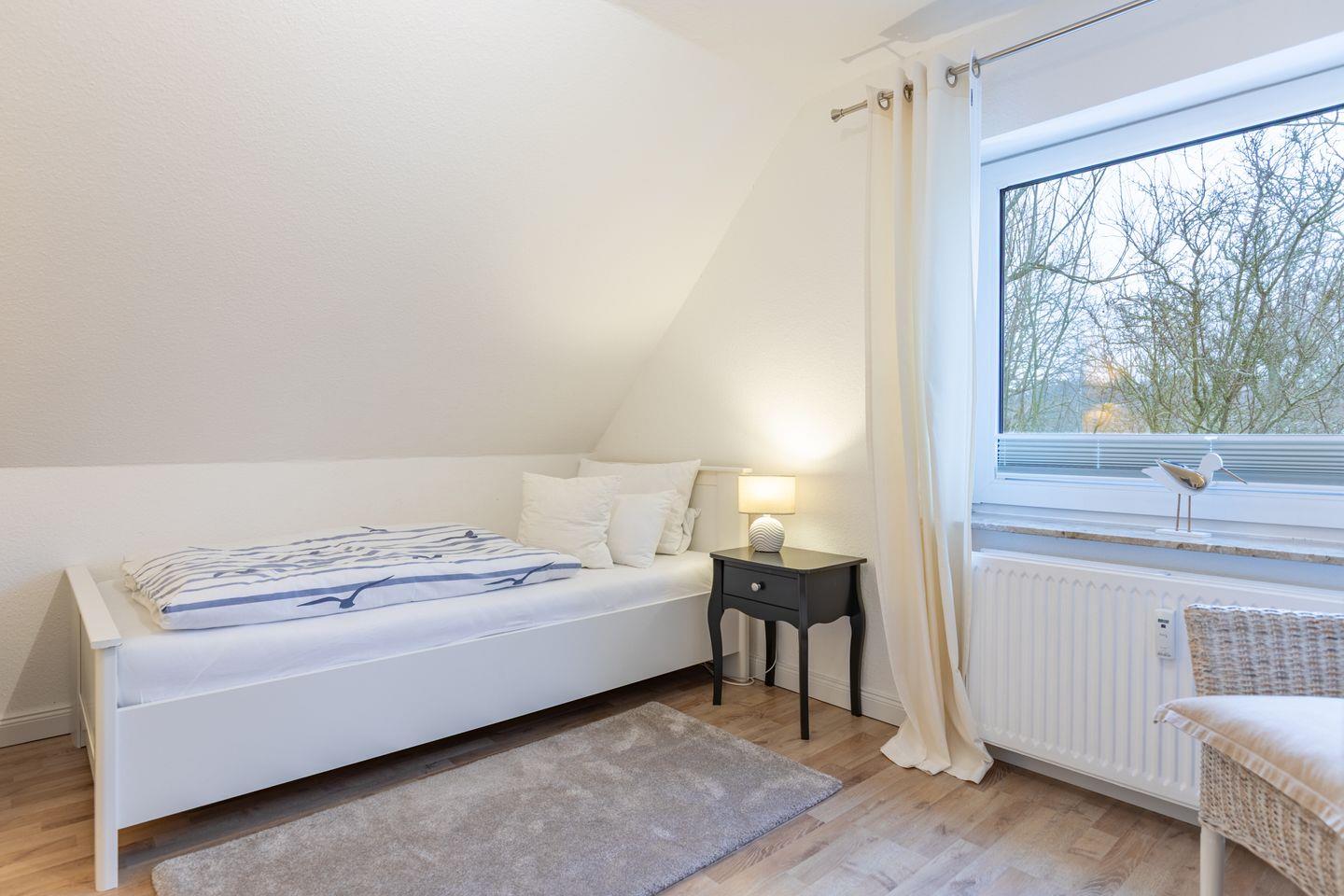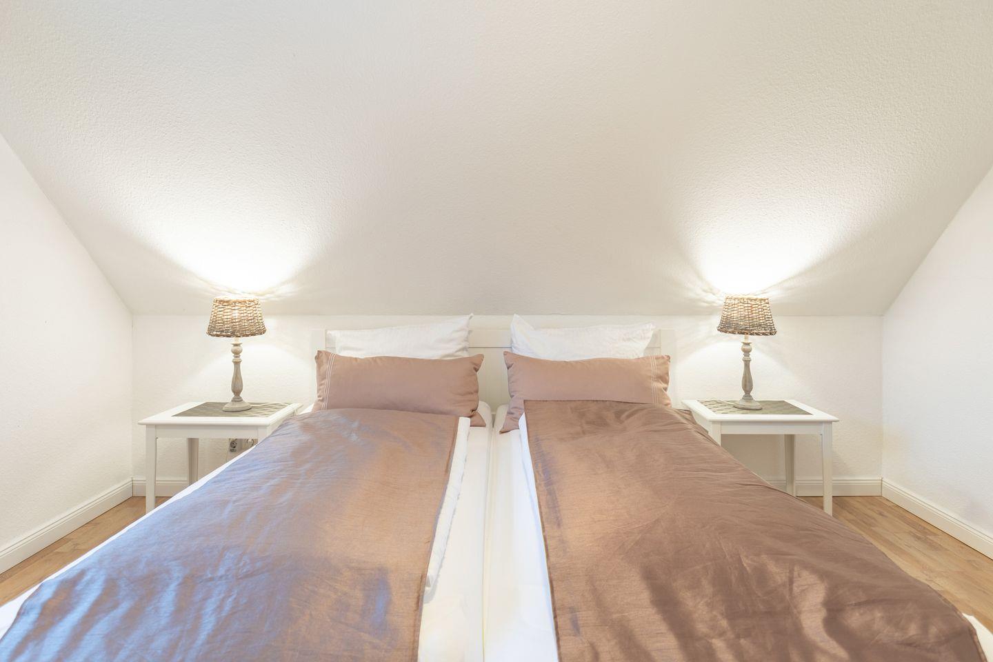 Die drei Schlafzimmer befinden sich im ersten Obergeschoss. Beide größeren Schlafzimmer sind mit einem Doppelbett mit der Größe 1,80 x 200cm ausgestattet. Das Schlafzimmer mit dem Einzelbett hat die Größe 90x200cm.