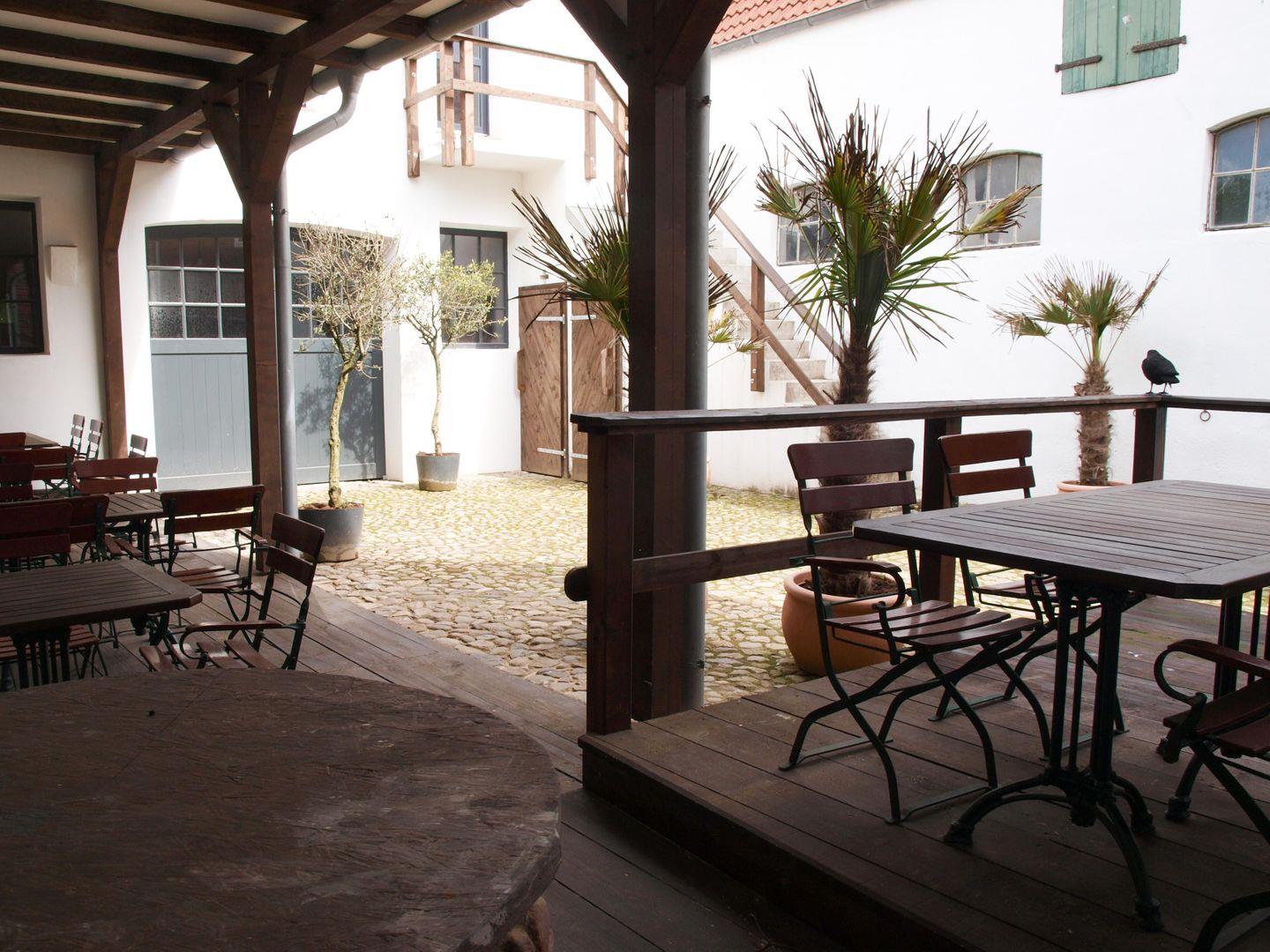 Der idyllische und ruhige Innenhof ist zum Teil überdacht und lädt Sie ein auf ein kühles Getränk in netter Runde.