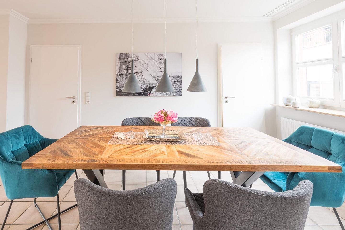 Die Ferienwohnung mit 74 qm Wohnfläche wurde komplett renoviert und komfortabel eingerichtet. Geschmackvolles Wohnzimmer mit Schlafsofa und Flachbild-TV, Essbereich, komfortabel eingerichtete Küche mit Geschirrspüler, 4-Platten-Ceranfeld, Mikrowelle, Kühlschrank mit Gefrierfach, Waschmaschine, Filterkaffeemaschine (Filtergröße 4), Nespresso-Maschine, Wasserkocher und Toaster. Das Schlafzimmer ist mit einem gemütlichen Boxspringbett (180x200) und mit einem TV ausgestattet.