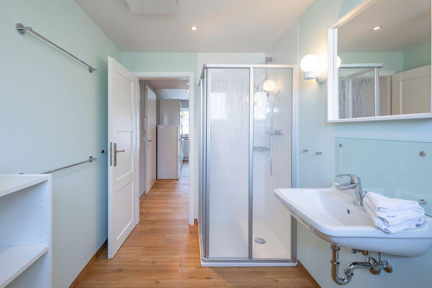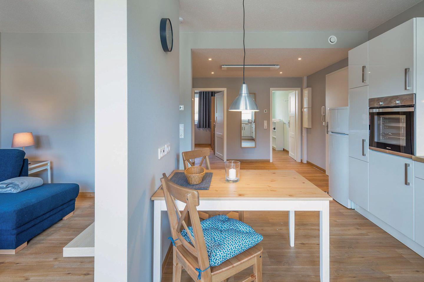 Die Ferienwohnung ist sehr hochwertig eingerichtet: ein Schlafzimmer mit einem bequemen Boxspringbett (180 x 200). Ein weiteres, kleines Schlafzimmer mit einem Boxspringbett (90 x 200) verschafft Ihnen den nötigen Freiraum. Die offene und komfortable Einbauküche bietet Ihnen ein Ceranfeld, Backofen, Geschirrspülmaschine, Kaffeemaschine (Filtergröße 4), Toaster und Wasserkocher, sowie einen SODA - Stream (Gasflaschen müssten mitgebracht werden, wenn die vorhandene leer ist). Der Wohnbereich verfügt über ein gemütliches Sofa und einen Flachbild-TV. Das moderne Badezimmer ist mit einer großen Dusche, WC und Waschbecken eingerichtet. Auf der sonnigen Terrasse können Sie den Tag gemütlich ausklingen lassen.