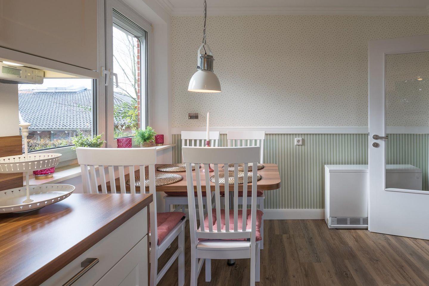 Das ebenerdige Haus eignet sich für bis zu vier Personen. Es ist mit zwei Schlafzimmern mit jeweils einem Doppelbett (180 x 200) ausgestattet. Die Betten sind bei Ankunft liebevoll bezogen. Die komfortabel eingerichtete Küche bietet Ihnen eine Geschirrspülmaschine, Backofen, Herd, Dunstabzugshaube, Wasserkocher, Toaster, Filterkaffeemaschine uvm. Das Badezimmer ist mit einer bodengleichen Dusche und einer Waschmaschine ausgestattet. Das Wohnzimmer bietet Ihnen eine gemütliche Sitzecke mit großem Flachbild-TV (SAT), eine Musikanlage, einen großzügigen Essbereich und den Zugang zur herrlichen Terrasse. Zum Haus gehört ein Kfz-Stellplatz.