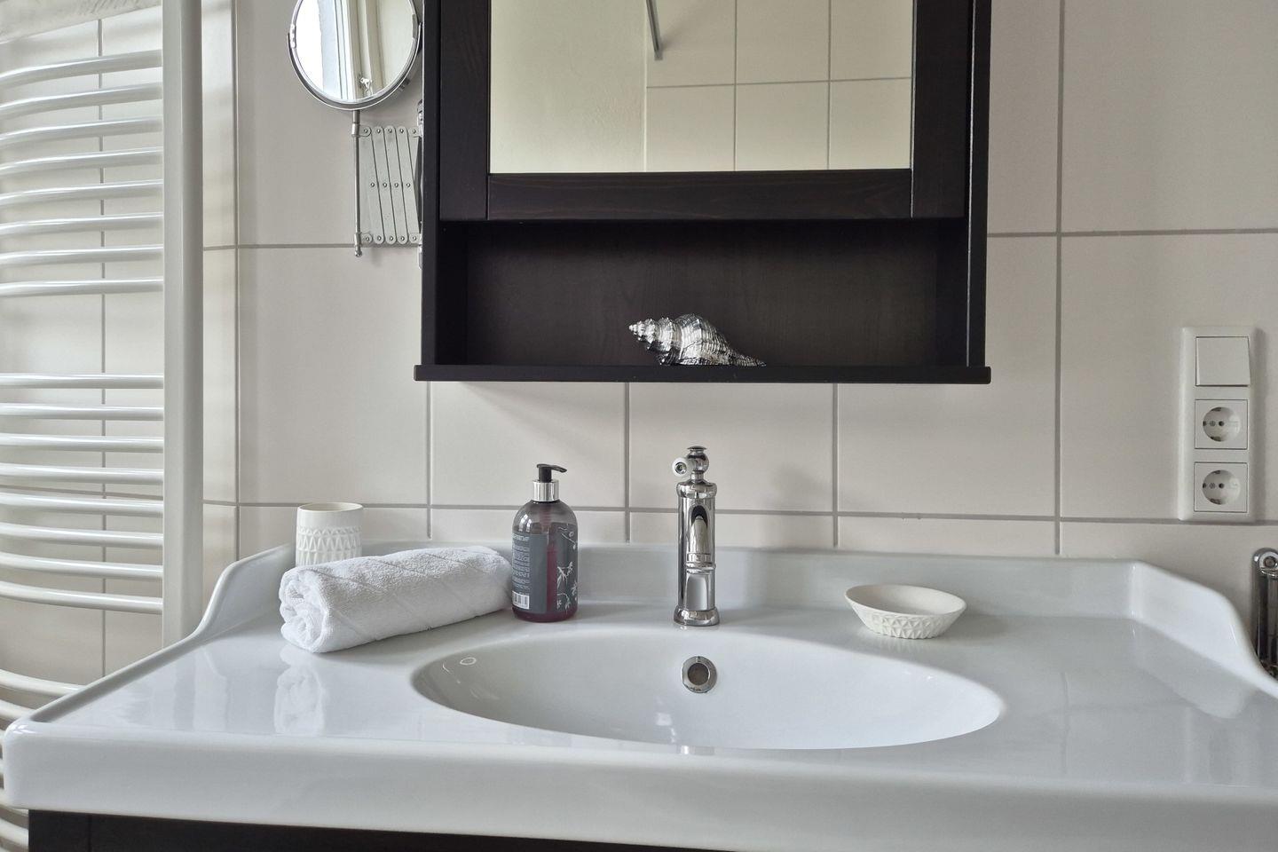 Das moderne Badezimmer ist mit einer Badewanne (mit Duschvorrichtung), einem Handwaschbecken, WC und einer Waschmaschine eingerichtet.