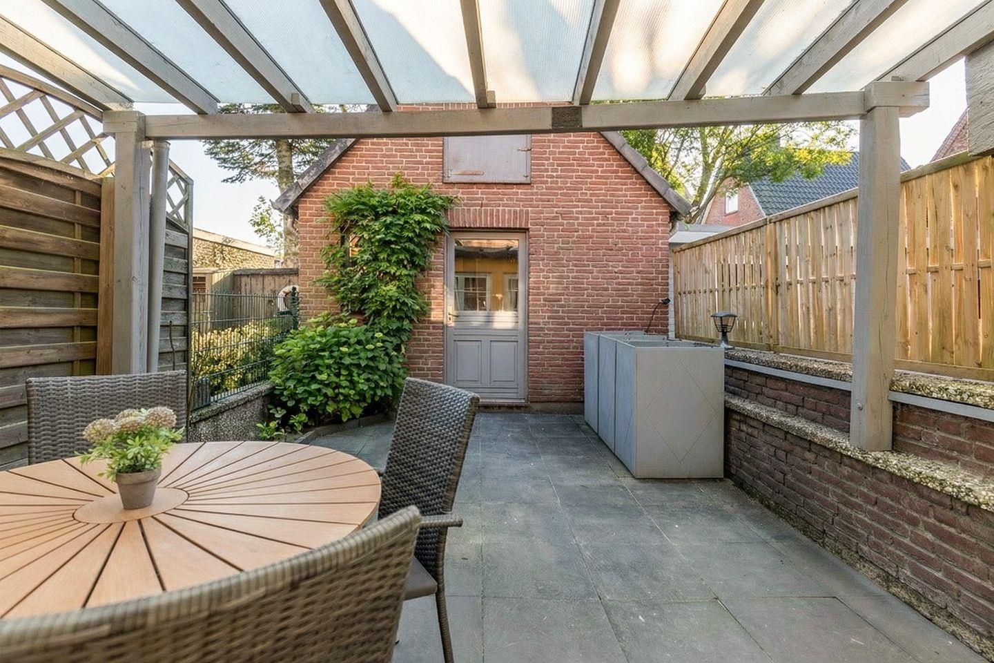 Auf der überdachten Terrasse mit den Gartenmöbeln können Sie den Tag gemütlich ausklingen lassen.