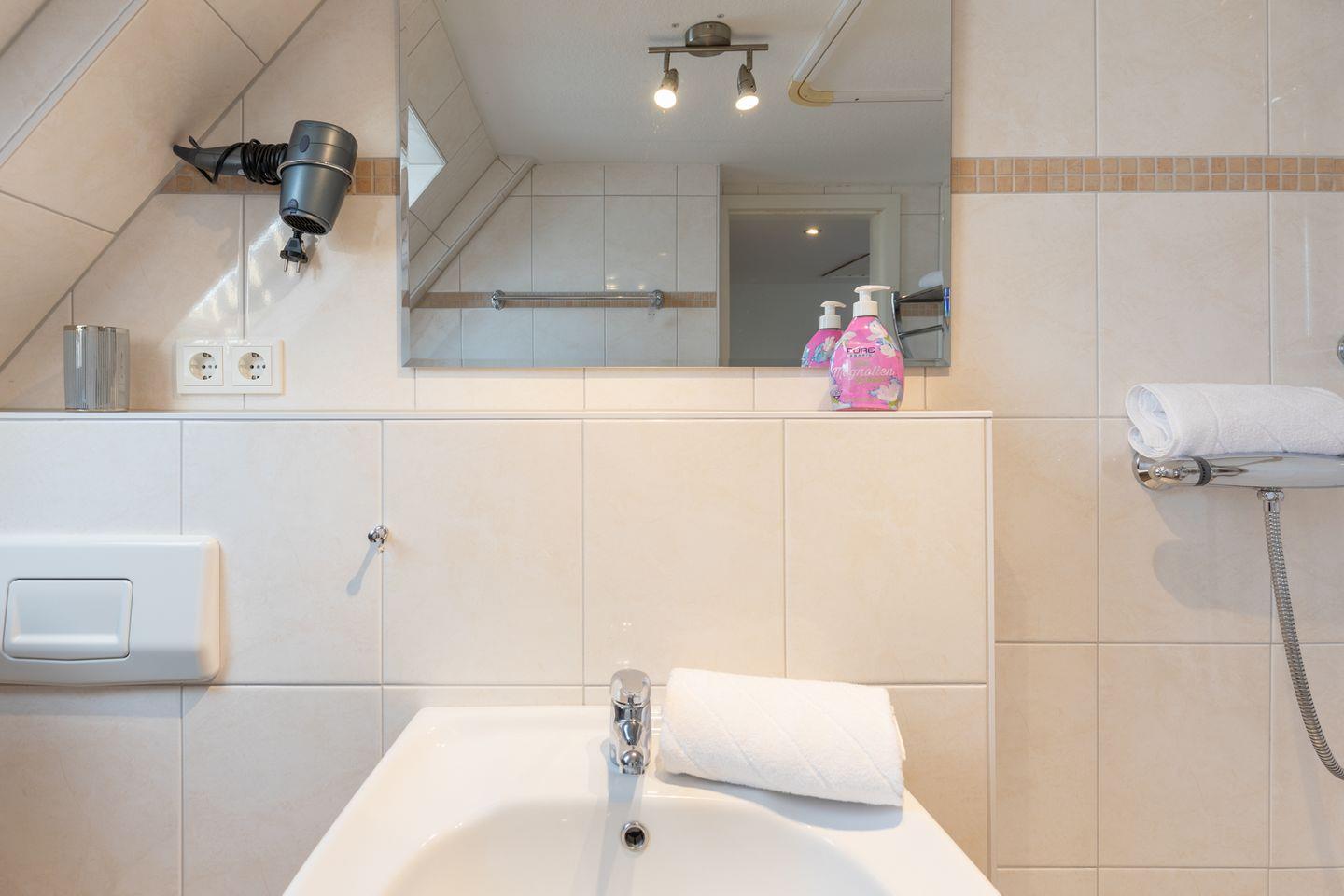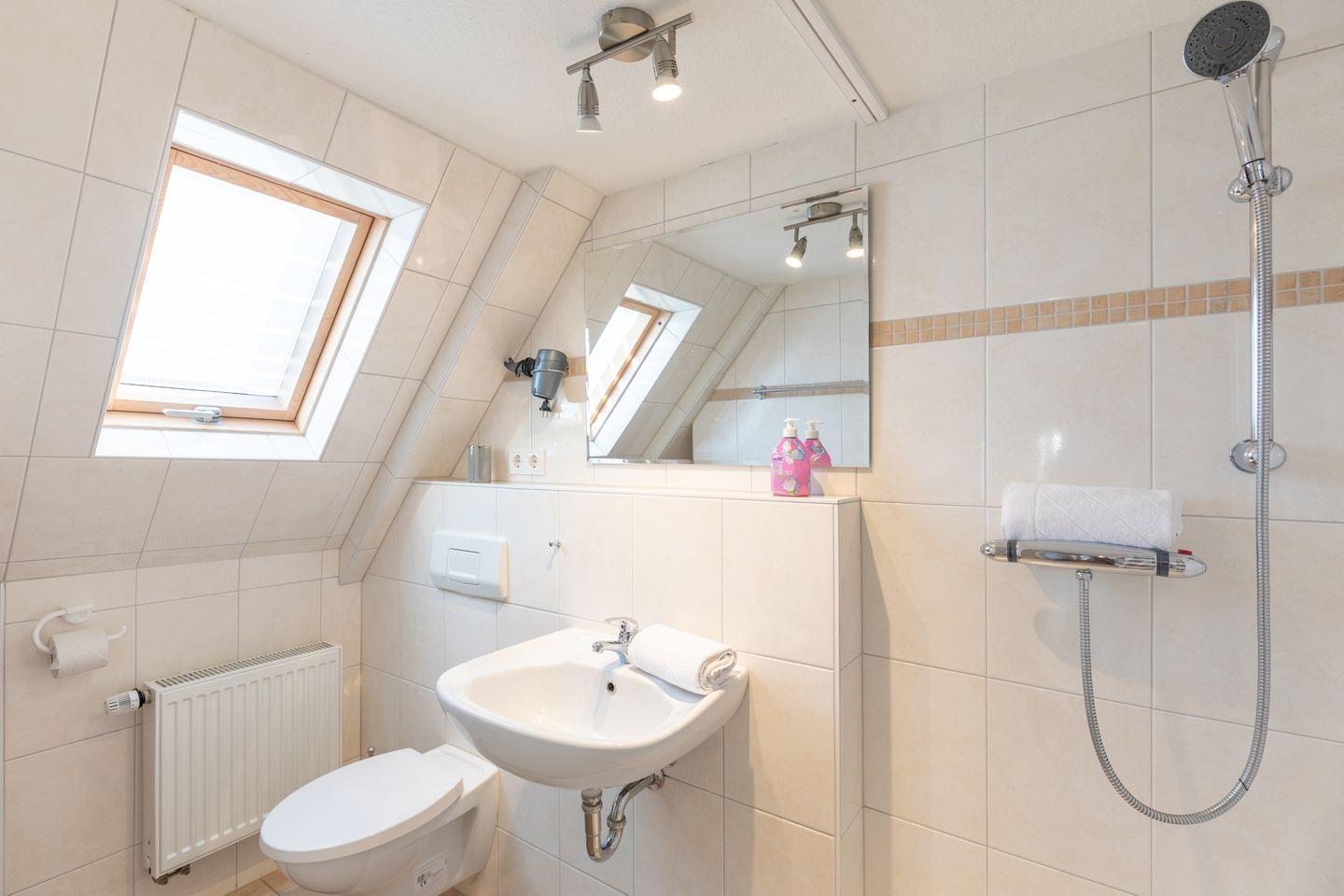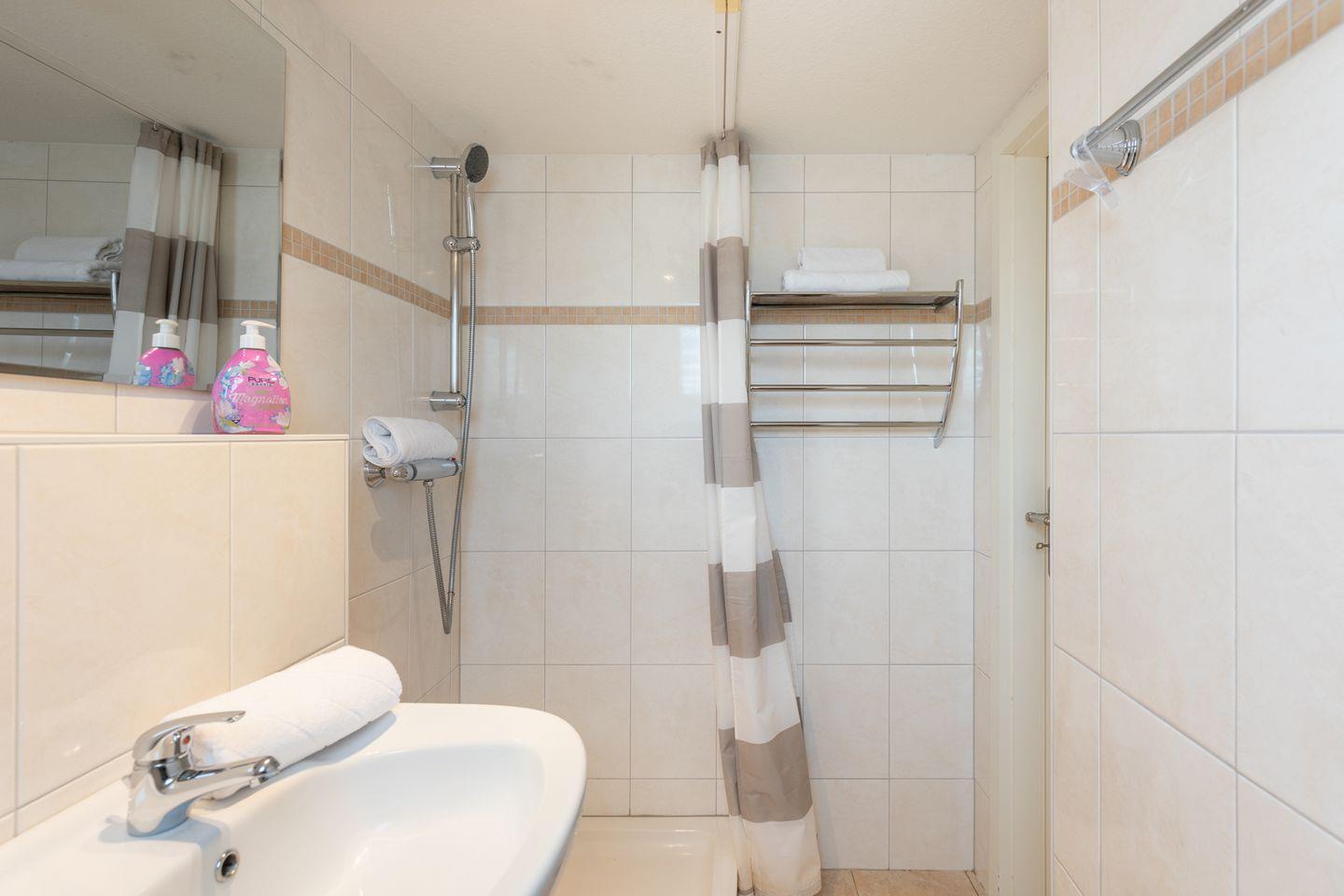 Das schöne Schlafzimmer mit einem Doppelbett (180 x 200) und das moderne Duschbad runden das Bild ab.