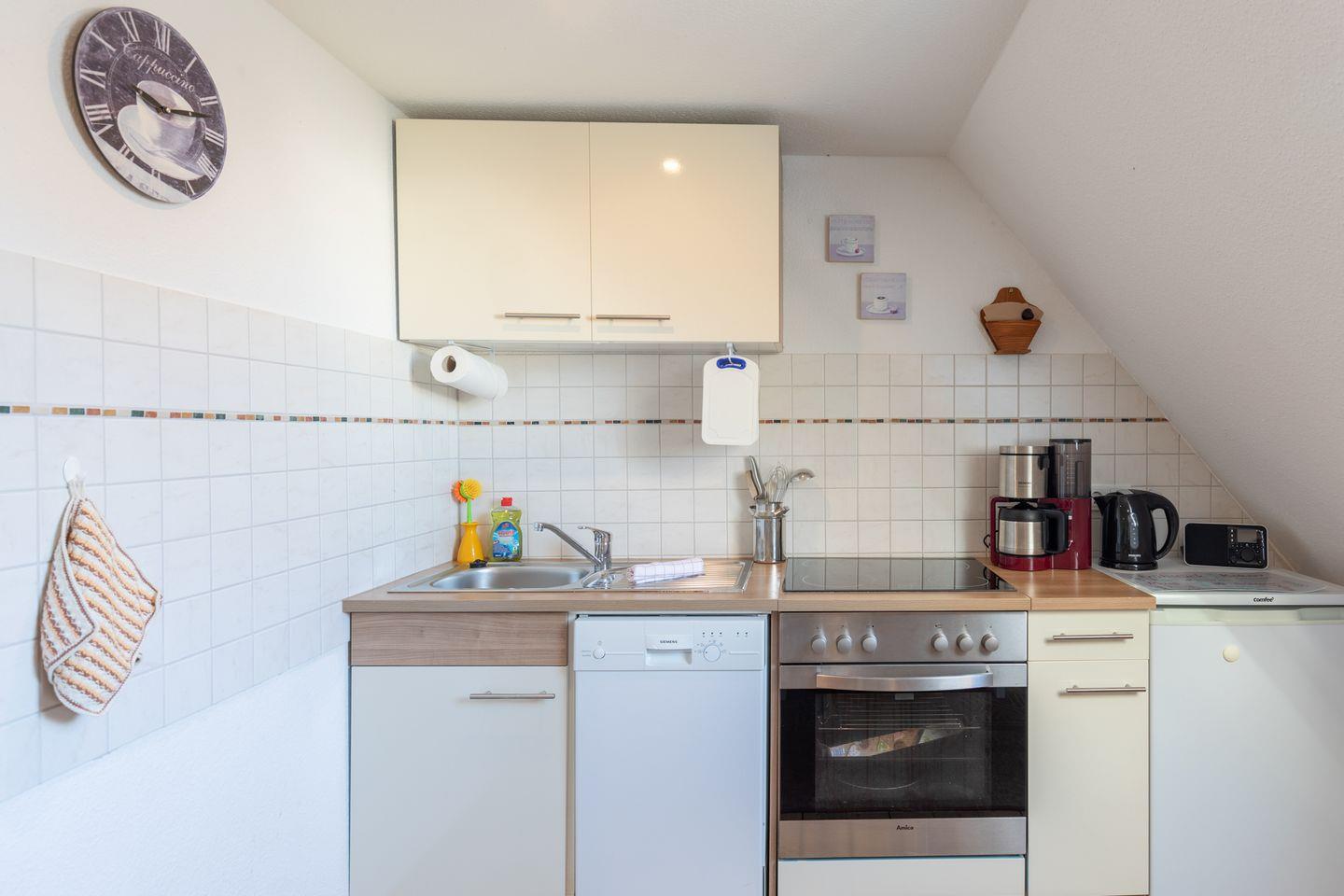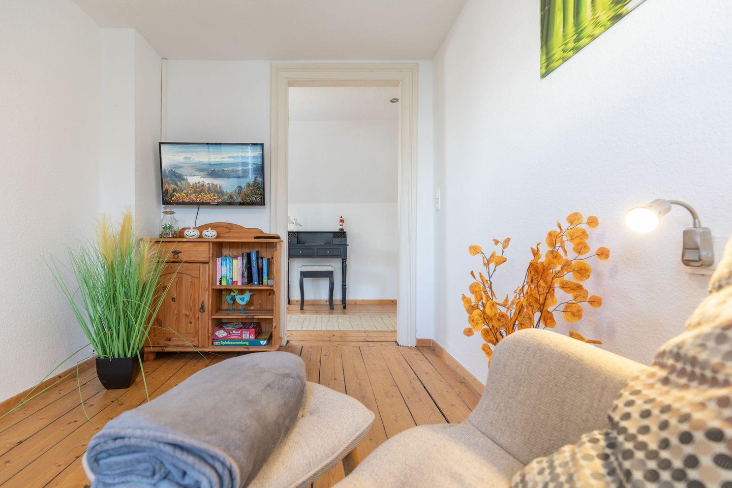 Die kleine aber feine Ferienwohnung ist mit schönen Holzdielenboden ausgestattet. Das Wohnzimmer bietet Ihnen ein gemütliches Sofa (mit Schlaffunktion), einen Sessel und einen Fernseher. In der separaten Küche finden Sie einen großzügigen Essbereich. In der Küchenzeile stehen Kühlschrank mit Gefrierfach, Geschirrspülmaschine, Kaffeemaschine (Filtergröße 4), Herd mit Backofen, Wasserkocher und Toaster für Sie bereit.
