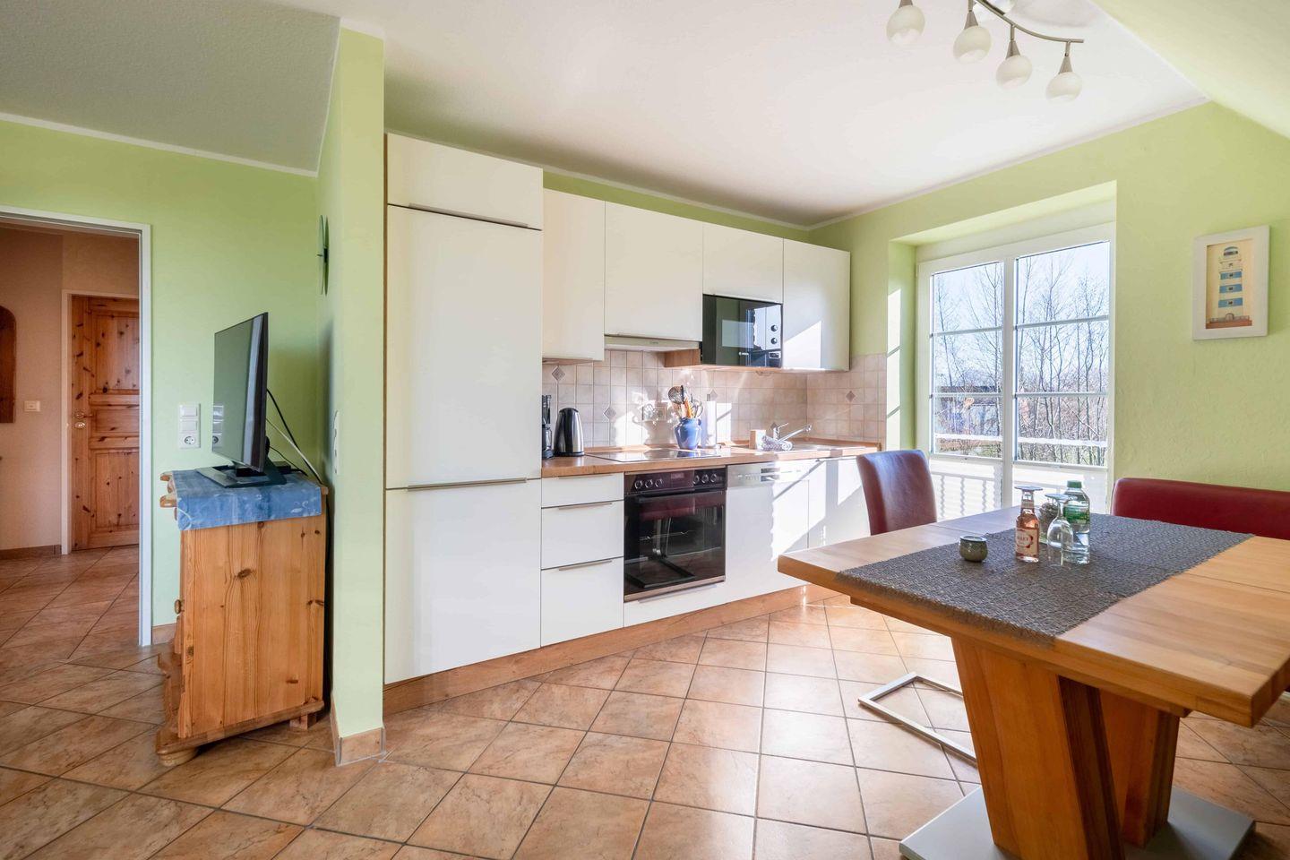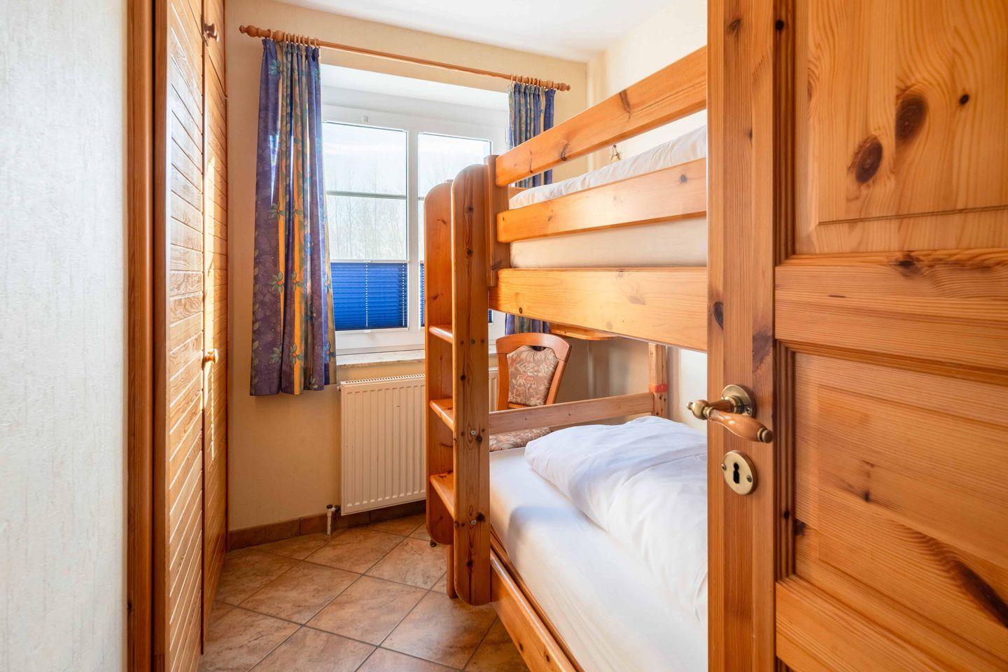 Der helle Wohnraum bietet Ihnen eine gemütliche Sofaecke mit TV, einen Essbereich und eine offene Küchenzeile mit Geschirrspüler, Glaskeramikherd, Backofen, Kühlschrank mit Gefrierfach, Kaffeemaschine und Wasserkocher. Im Schlafzimmer steht Ihnen ein Doppelbett (180 x 200) für Ihren erholsamen Schlaf zur Verfügung. Das zweite Schlafzimmer ist mit einem Etagenbett ausgestattet. Das Duschbad rundet das Bild ab.