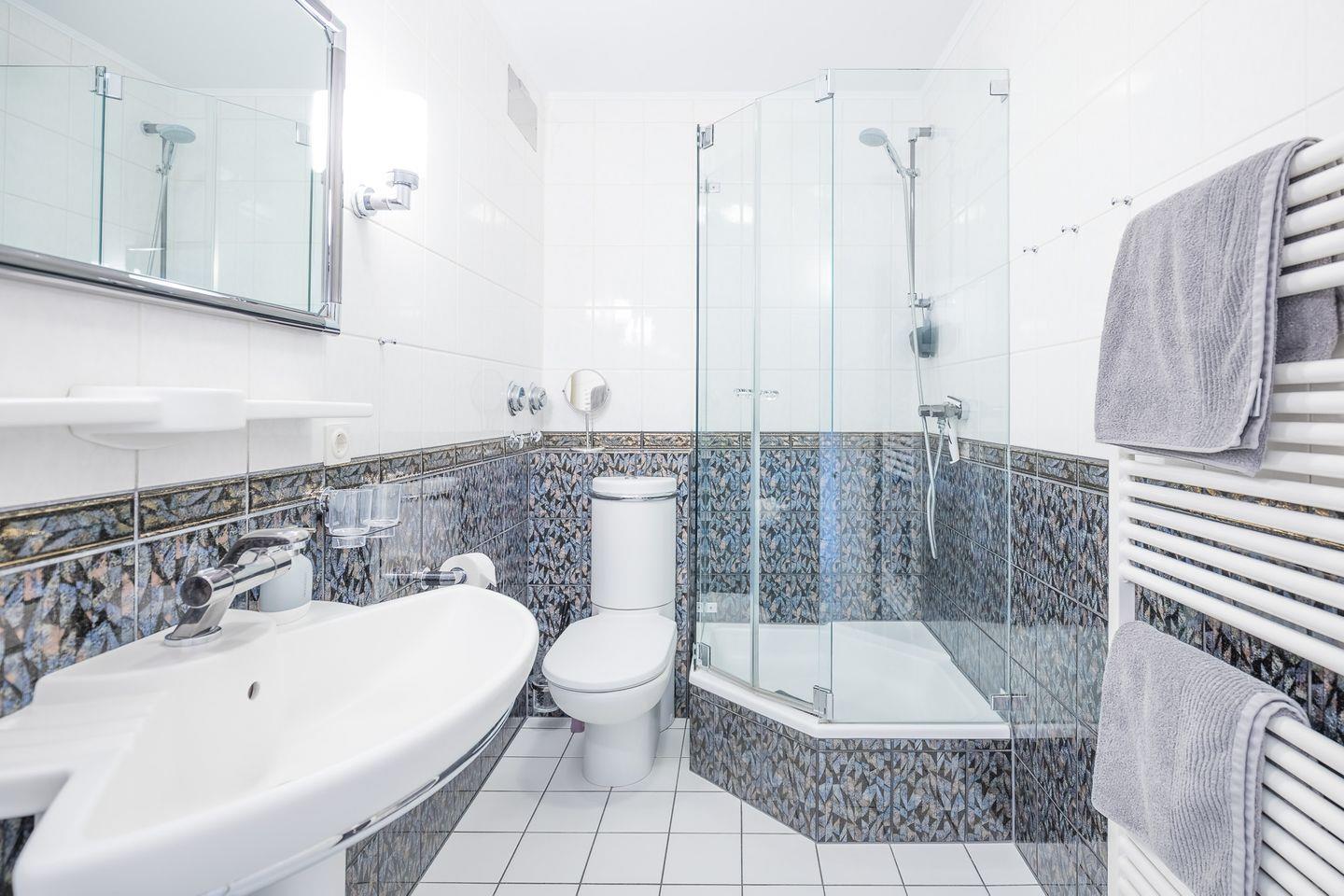 Das großzügige Schlafzimmer garantiert erholsame Nächte. Das Badezimmer verfügt über eine Dusche mit Wanne, einen Haartrockner und einen Kosmetikspiegel – ideal für eine entspannte Körperpflege.