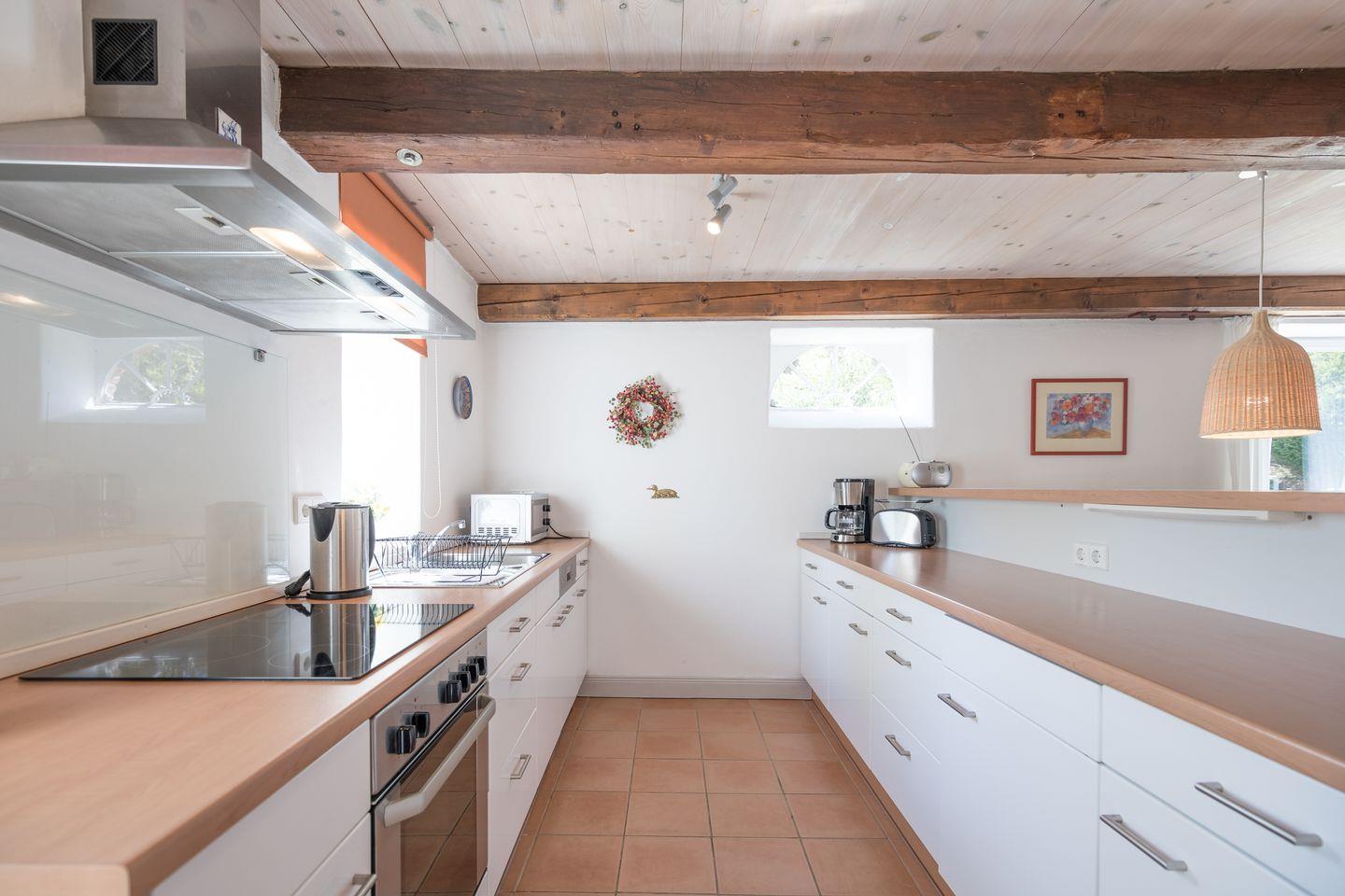Die offene Küche ist komplett ausgestattet: Ceranfeld, Backofen, Kühlschrank mit Gefrierfach, Spülmaschine, Mikrowelle, Filterkaffeemaschine (Filtergröße 4), Wasserkocher, Toaster und vieles mehr.