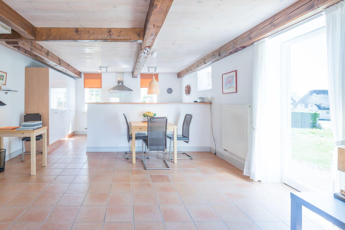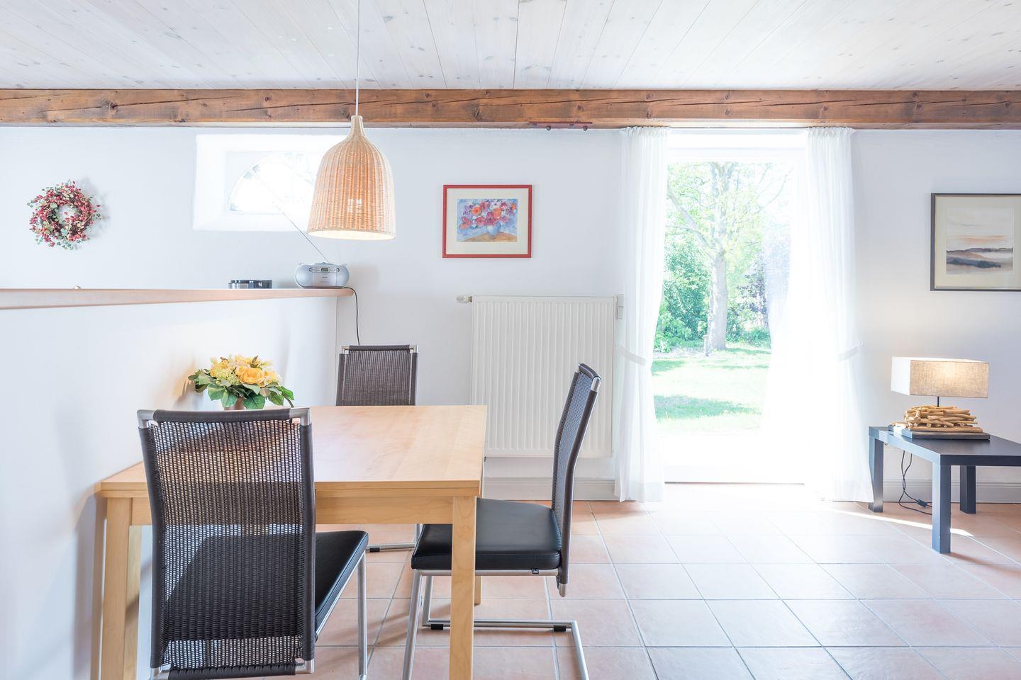 Die Ferienwohnung ist schön und modern eingerichtet: der große Wohnraum (ca. 45 qm) bietet Ihnen eine gemütliche Sitzecke, einen Fernseher, Radio/CD-Player. Für alle, die auch mal im Urlaub arbeiten müssen, bietet der Schreibtisch einen guten Rückzugsort.