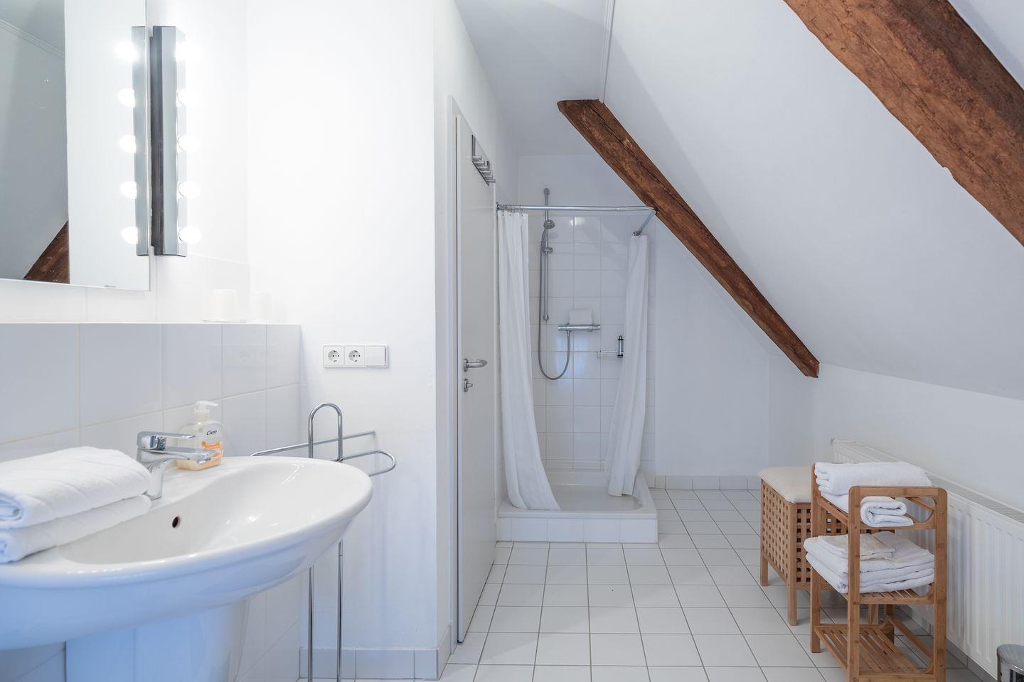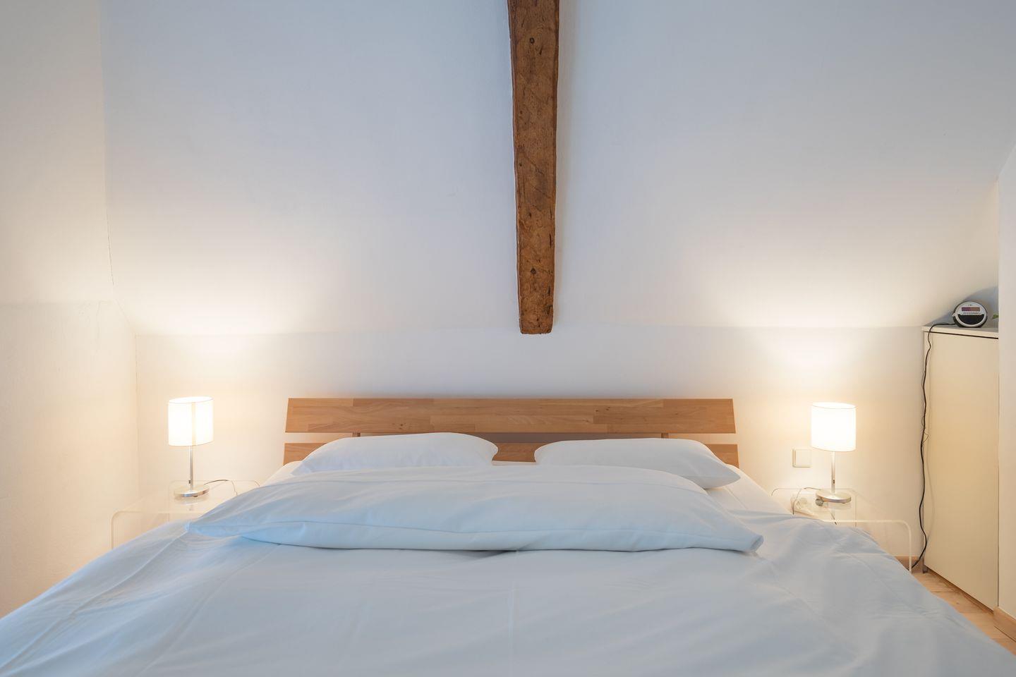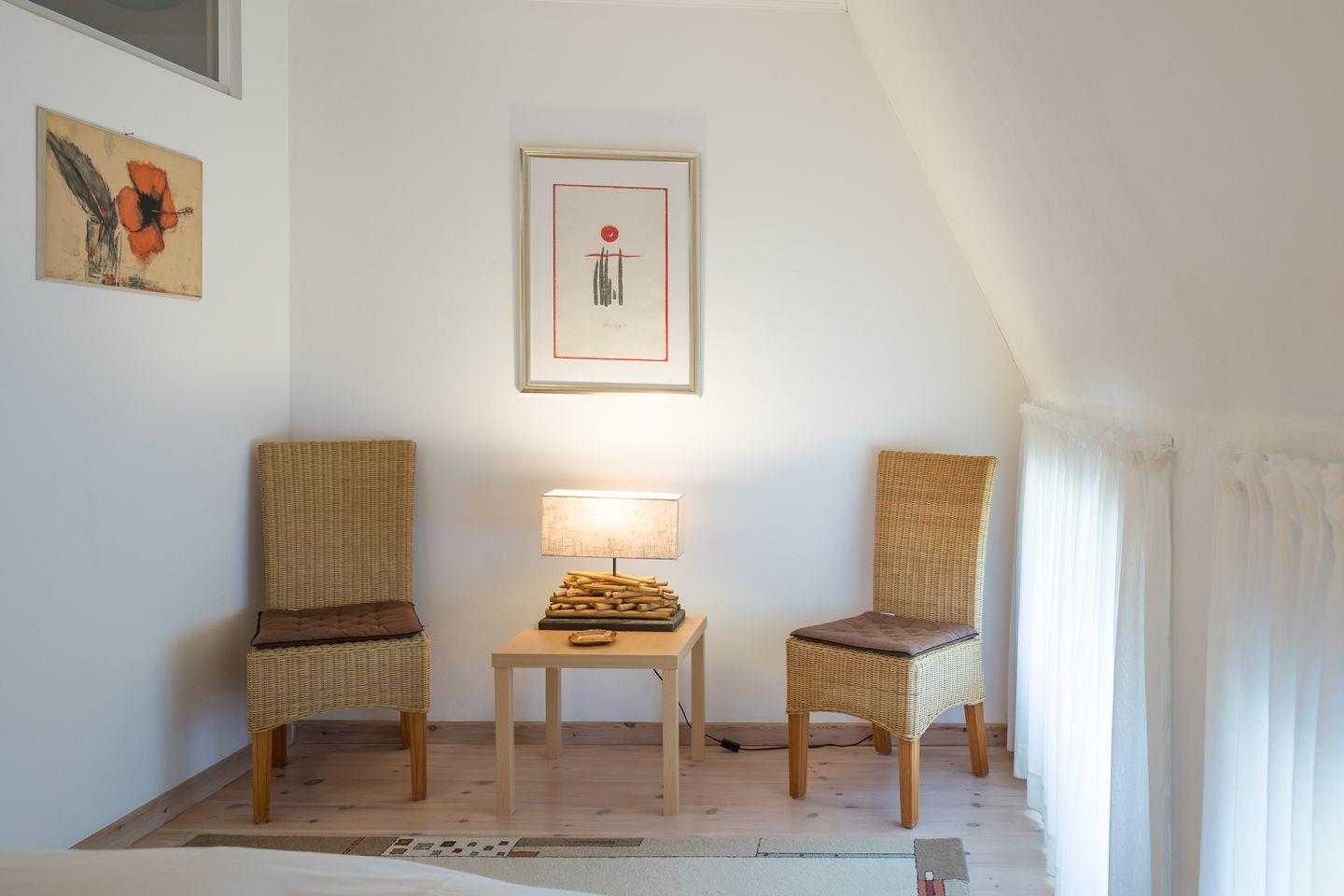 Über eine Treppe erreichen Sie im 1. Obergeschoss das ruhige Schlafzimmer mit komfortablen Betten (180 x 200) und einer kleinen Sitzecke. Das geräumige Badezimmer ist mit einer Dusche, einer Badewanne, Waschbecken und WC ausgestattet.
