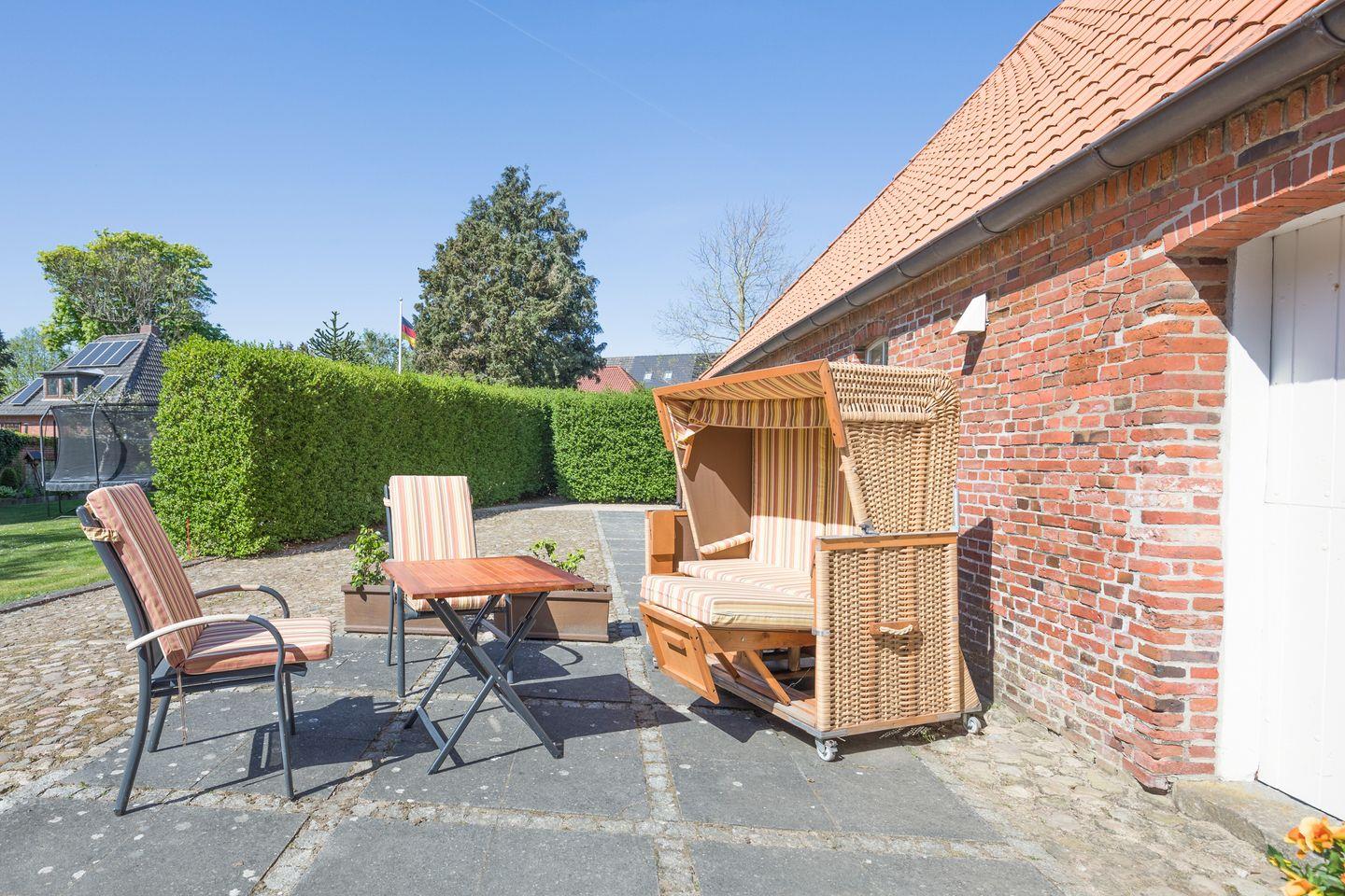 Auf der großen, geschützten Terrasse können Sie auf den bequemen Gartenstühlen oder auch in dem schönen Strandkorb den Tag ausklingen lassen.