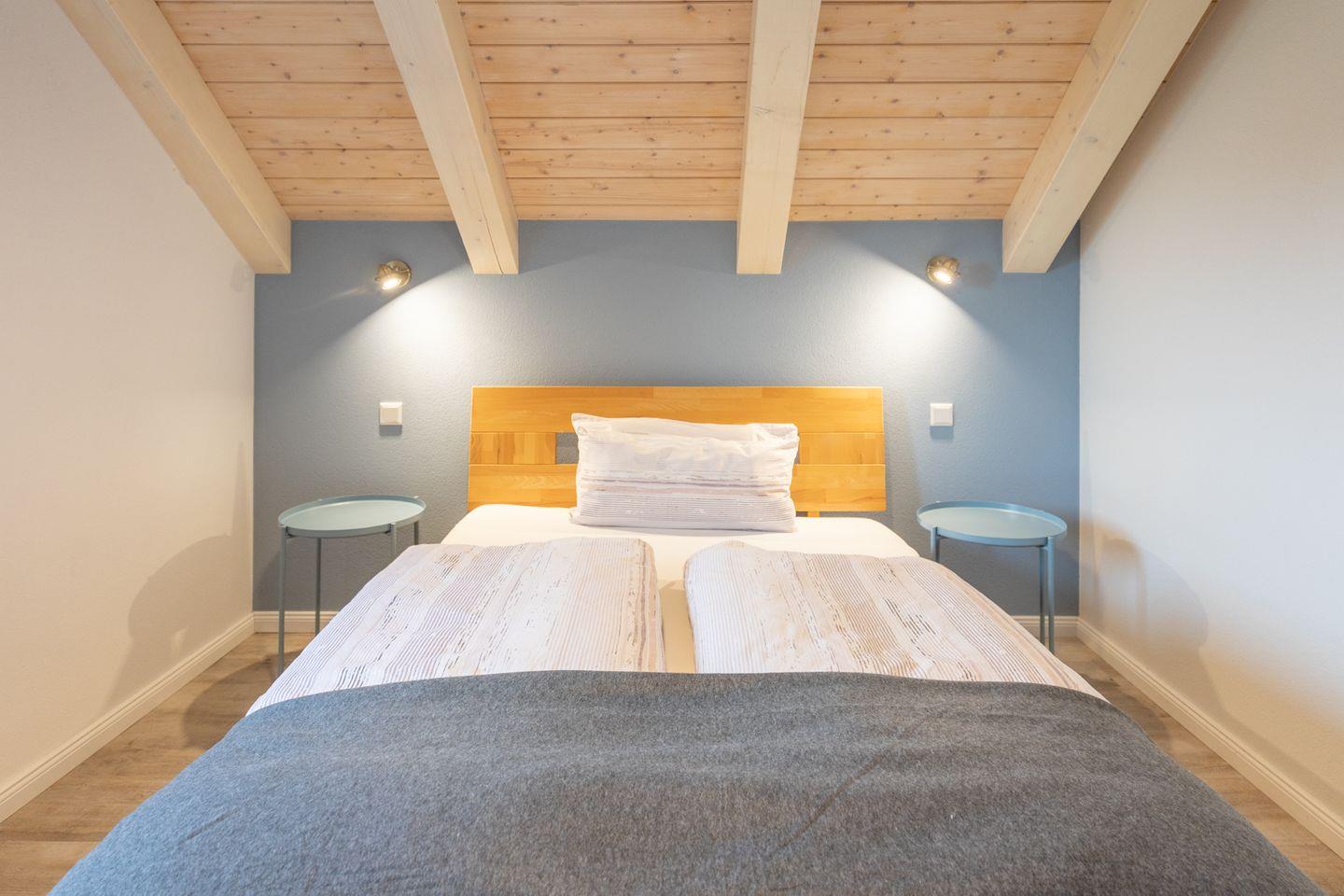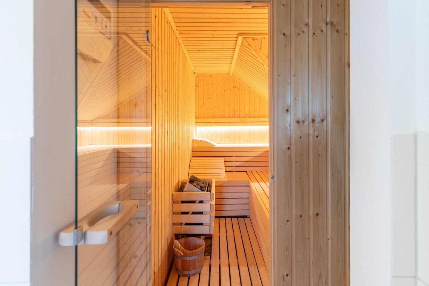 Über eine offene Treppe gelangen Sie in das Obergeschoss mit seinen drei Schlafzimmern mit (1x 180 x 200, 1x 140 x 200 und 2 Kojenbetten). In allen Schlafzimmern steht Ihnen je ein TV-Gerät zur Verfügung. Das große Badezimmer bietet eine geräumige Walk-In-Dusche und eine schöne Sauna. Auf der Galerie ist ein gemütlicher Ruhebereich mit Liegen und TV-Gerät eingerichtet.