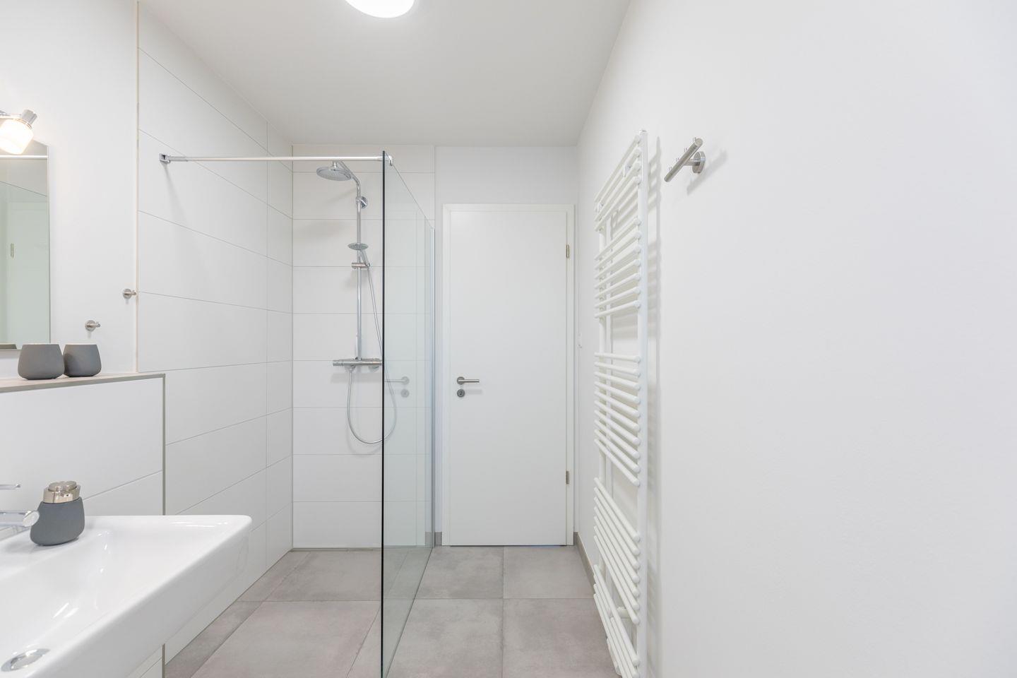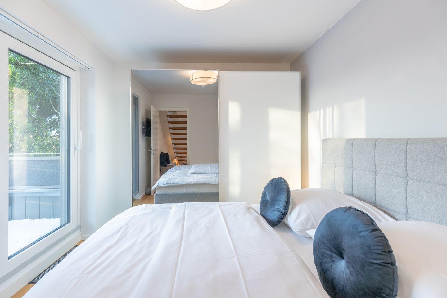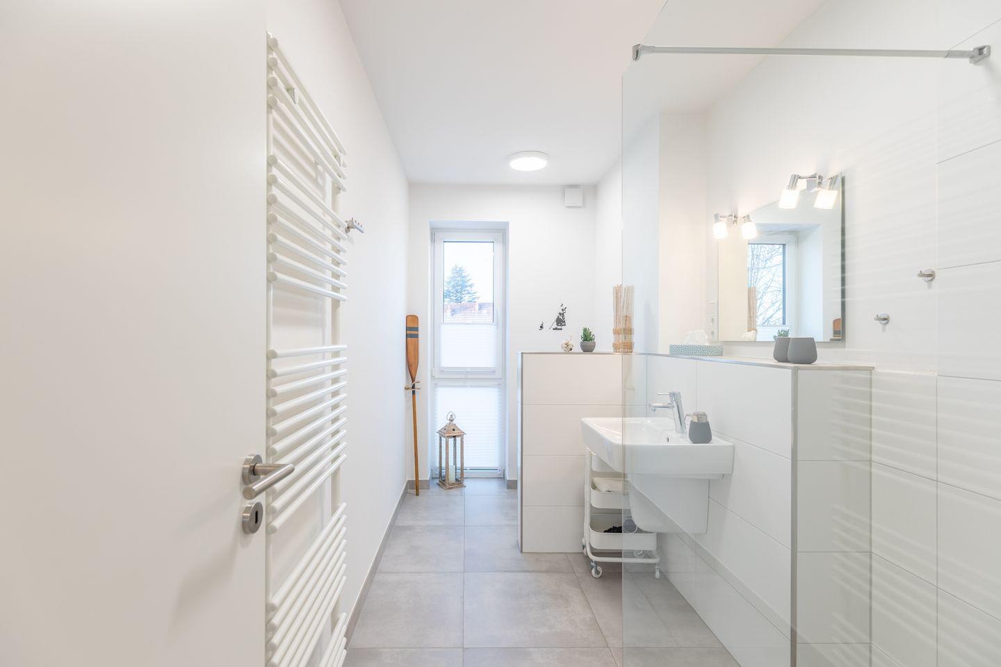Die Wohnung bietet Ihnen ein Schlafzimmer mit einem gehobenen Doppelpolsterbett (180 x 200) in der Wohnebene: Das großzügige, top-moderne Tageslichtbad verfügt über eine ebenerdige Dusche, ein WC und ein Waschbecken.