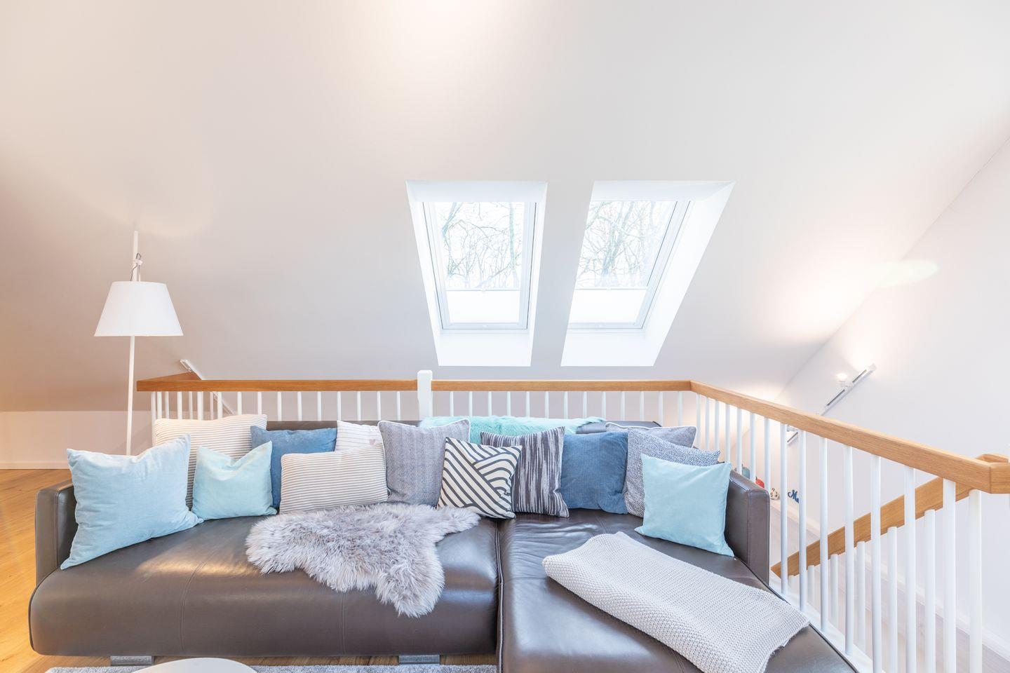 Die Empore mit einem hochwertigen Ledersofa und einem zusätzlichen Flatscreen-TV erreichen Sie über eine Treppe. Das vorhandene Reisebett (90x180) kann hier aufgestellt werden.