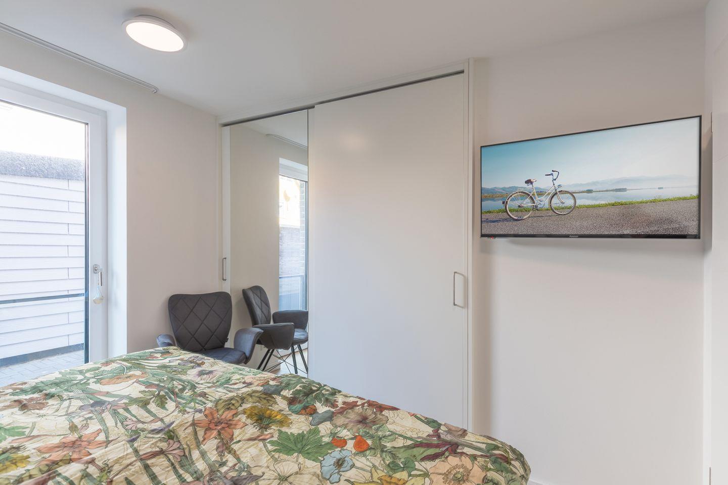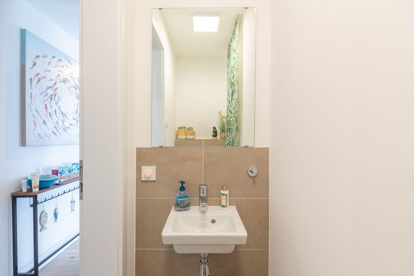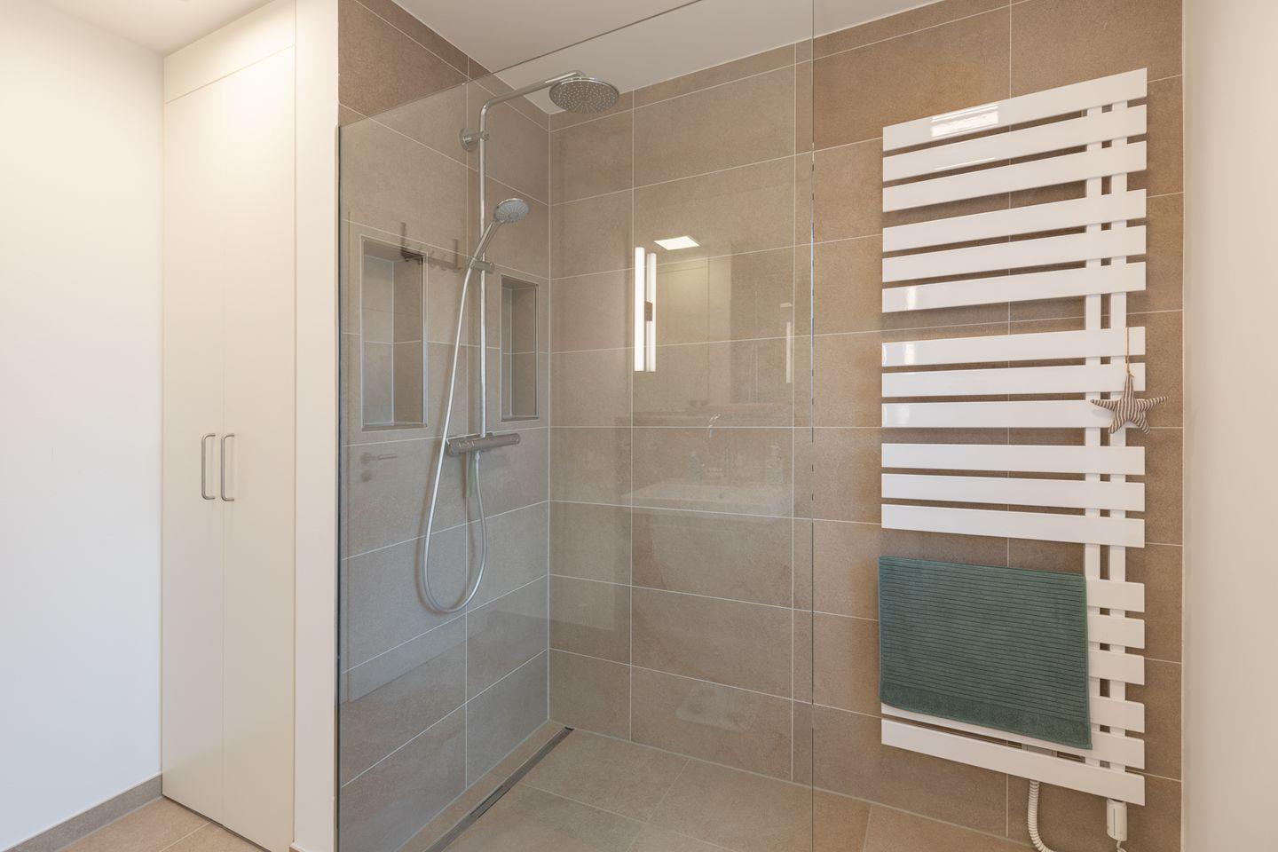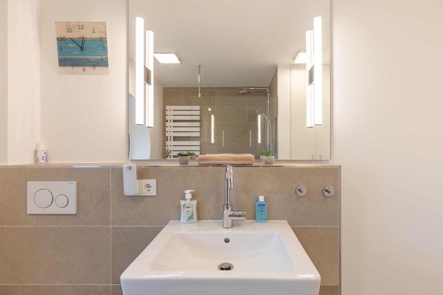 Das moderne Badezimmer ist mit einer ebenerdigen Dusche, WC, Waschbecken und vollautomatischem Waschtrockner eingerichtet. Ein separates Gäste-WC rundet das Bild ab. Alle Fenster sind mit Plissees zu verdunkeln.