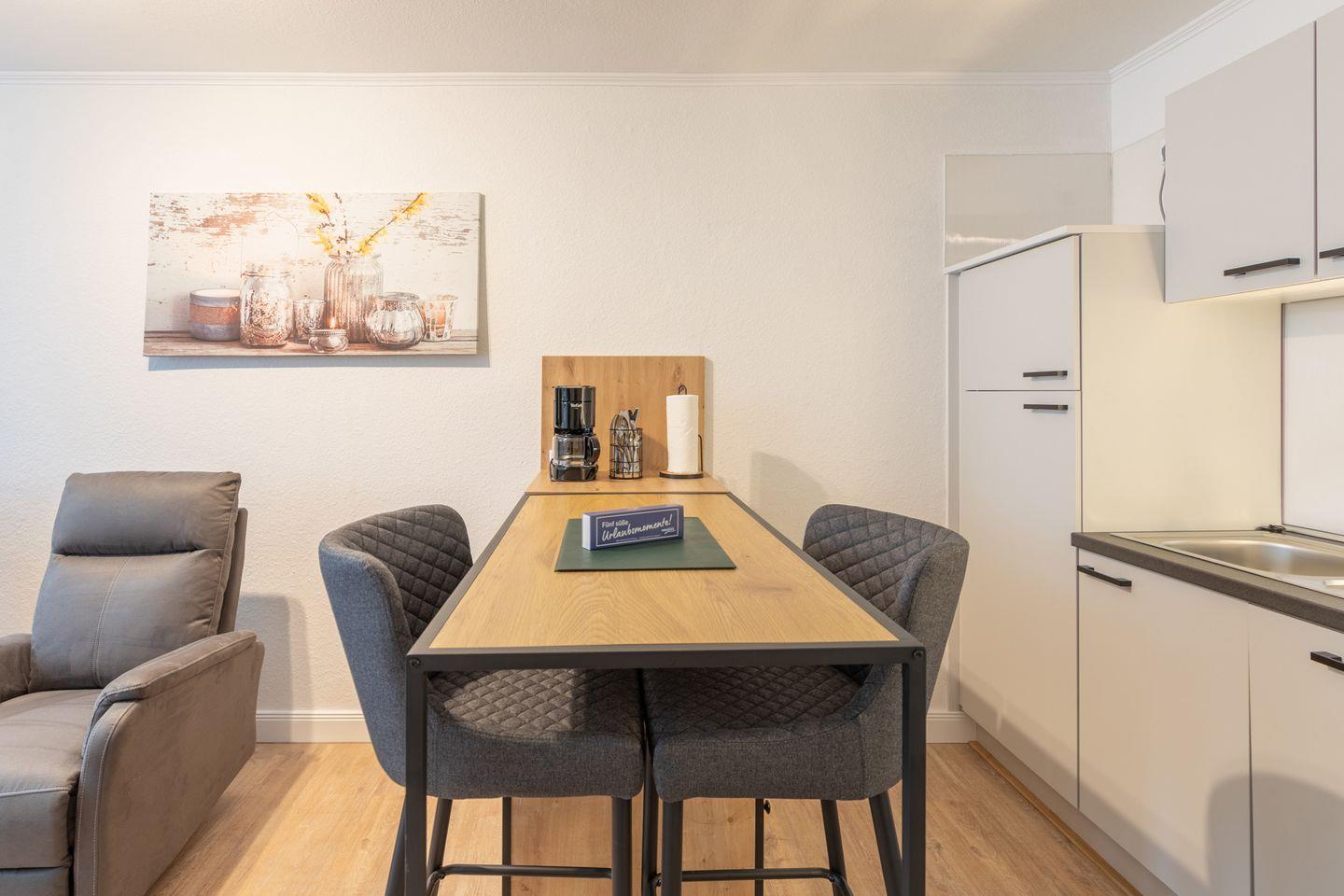 Das Ferienhaus mit ca. 40 qm Wohnfläche wurde komplett renoviert und liebevoll eingerichtet. Geschmackvolles Wohnzimmer mit zwei gemütlichen Sesseln und Flachbild-TV, Essbereich mit 2 Barhockern, komfortabel eingerichtete, offene Küche mit Geschirrspüler, 4-Platten-Ceranfeld, Kühlschrank mit Gefrierfach, Filterkaffeemaschine (Filtergröße 4), Wasserkocher und Toaster. Das Schlafzimmer ist mit einem gemütlichen Boxspringbett (180 × 200) ausgestattet.