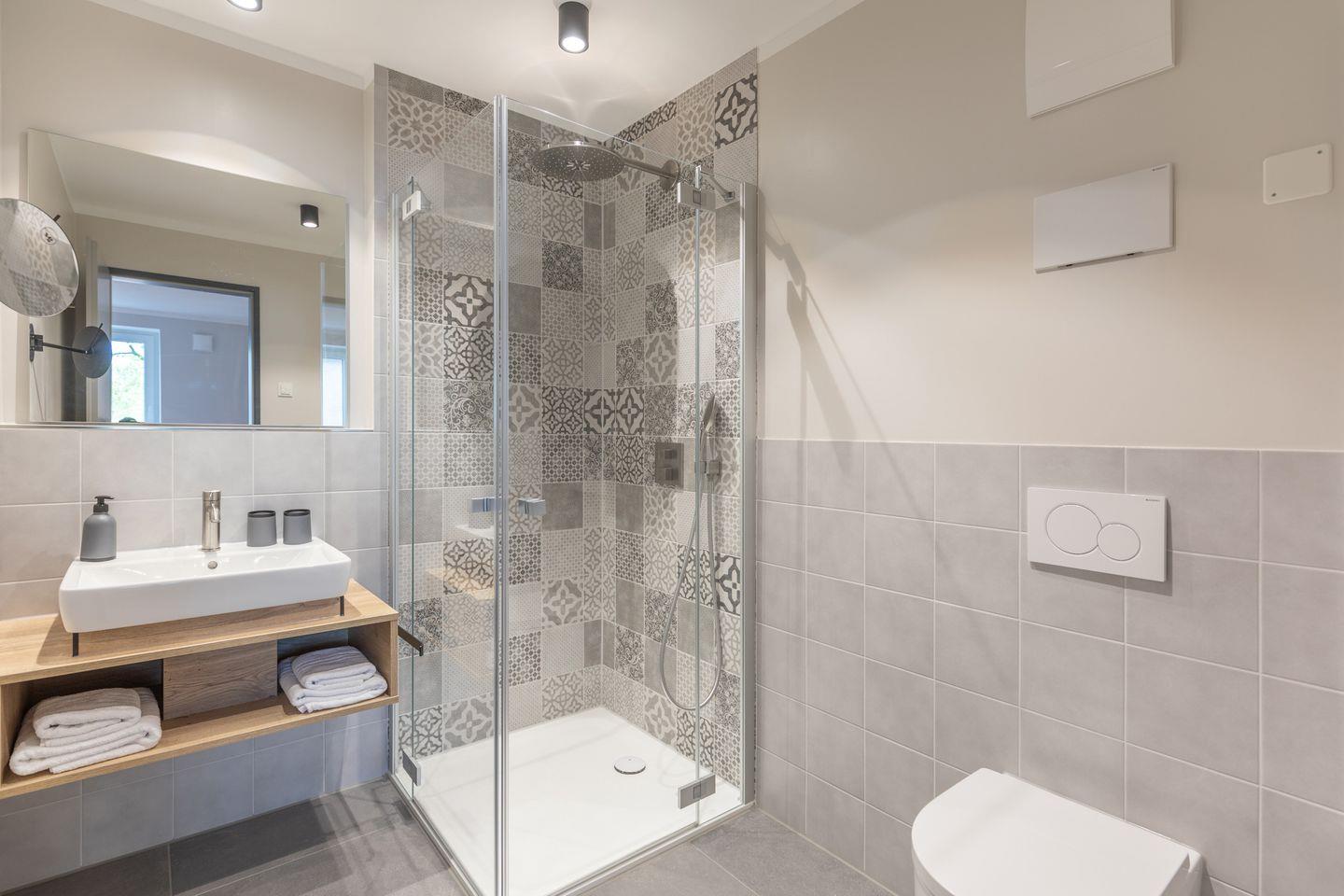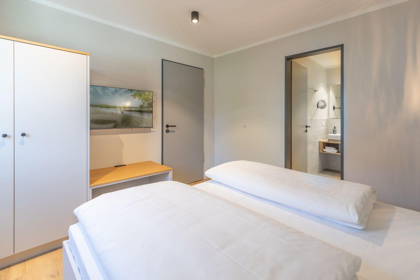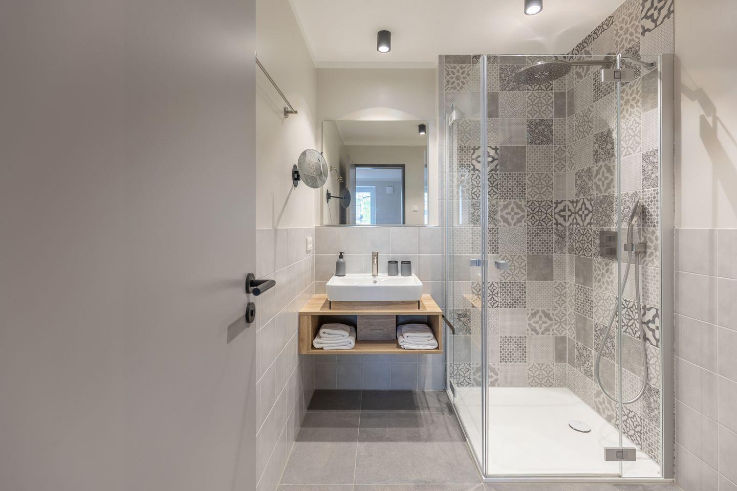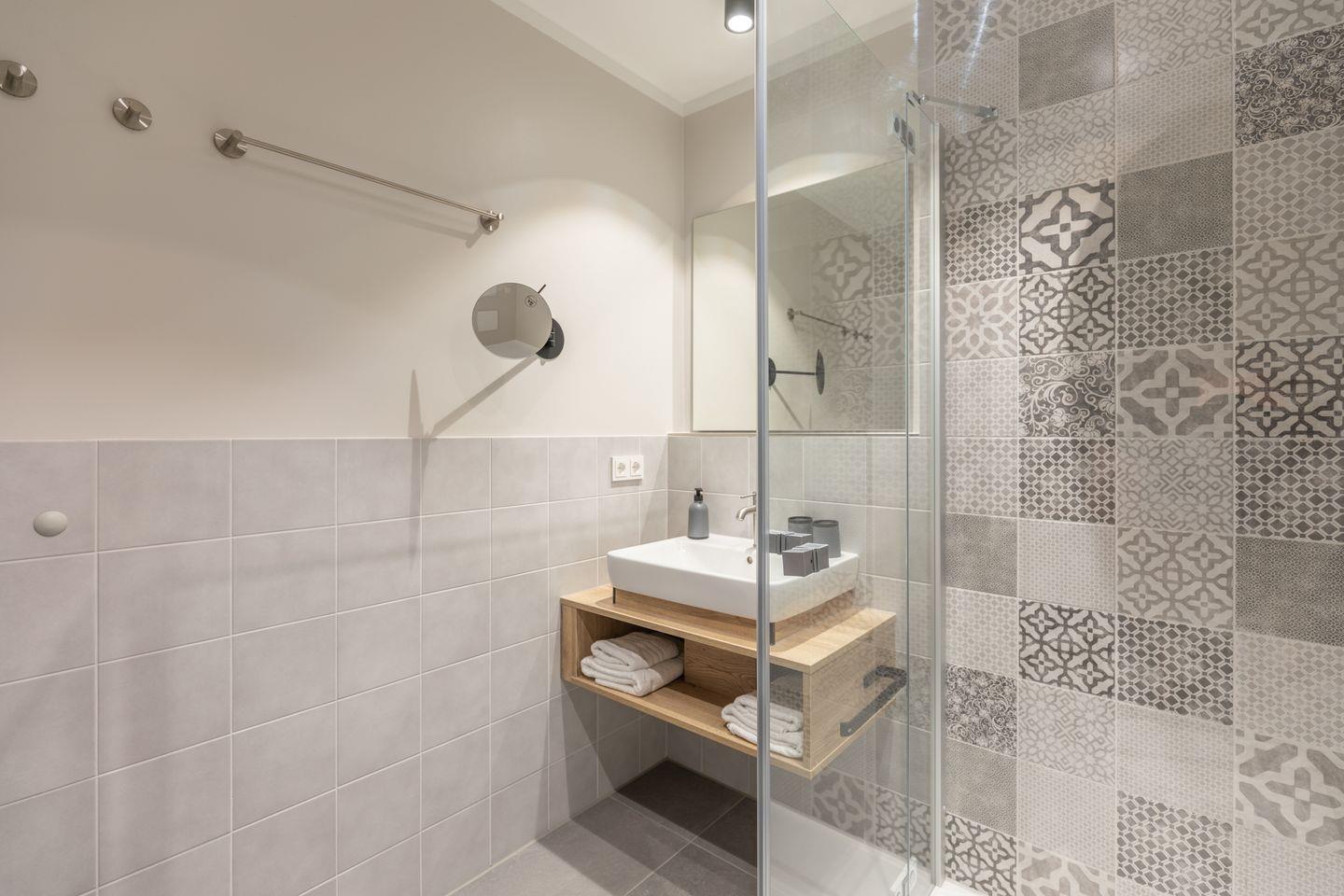Das Badezimmer (Zugang über eines der Schlafzimmer) verfügt über eine ebenerdige Dusche, WC, Kosmetikspiegel und Föhn. Zudem ist das Apartment komplett mit Fußbodenheizung ausgestattet und bietet im Schlafzimmer Verdunkelungsgardinen für einen entspannten Schlaf. Alle Apartments in den oberen Etagen sind über einen Aufzug erreichbar.