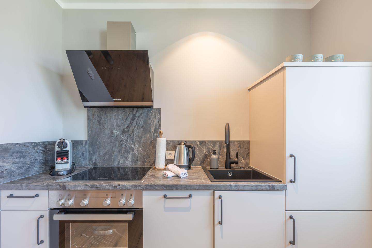 Direkt angeschlossen befindet sich die offene Küche mit Essbereich, Kühlschrank (mit Gefrierfach), Herd, Backofen, Spülmaschine (Tabs inklusive), Kaffeemaschine, Wasserkocher, Besteck, Geschirr plus Töpfe & Pfannen.