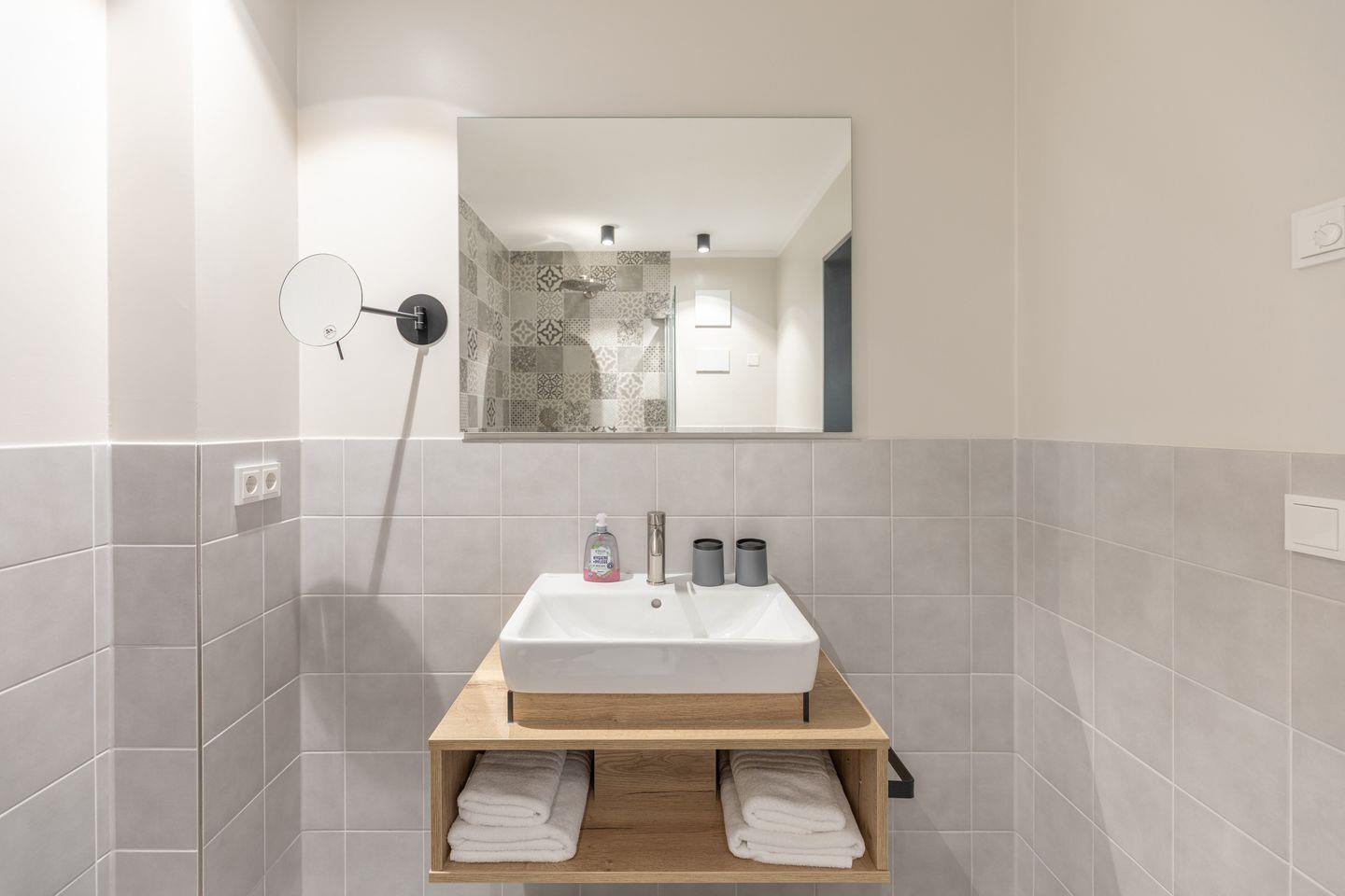 Das Badezimmer verfügt über eine ebenerdige Dusche, WC, Kosmetikspiegel und Föhn. Zudem ist das Apartment komplett mit Fußbodenheizung ausgestattet und bietet im Schlafzimmer Verdunkelungsgardinen für einen entspannten Schlaf. Alle Apartments in den oberen Etagen sind über einen Aufzug erreichbar.
