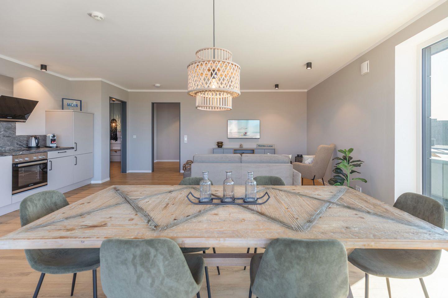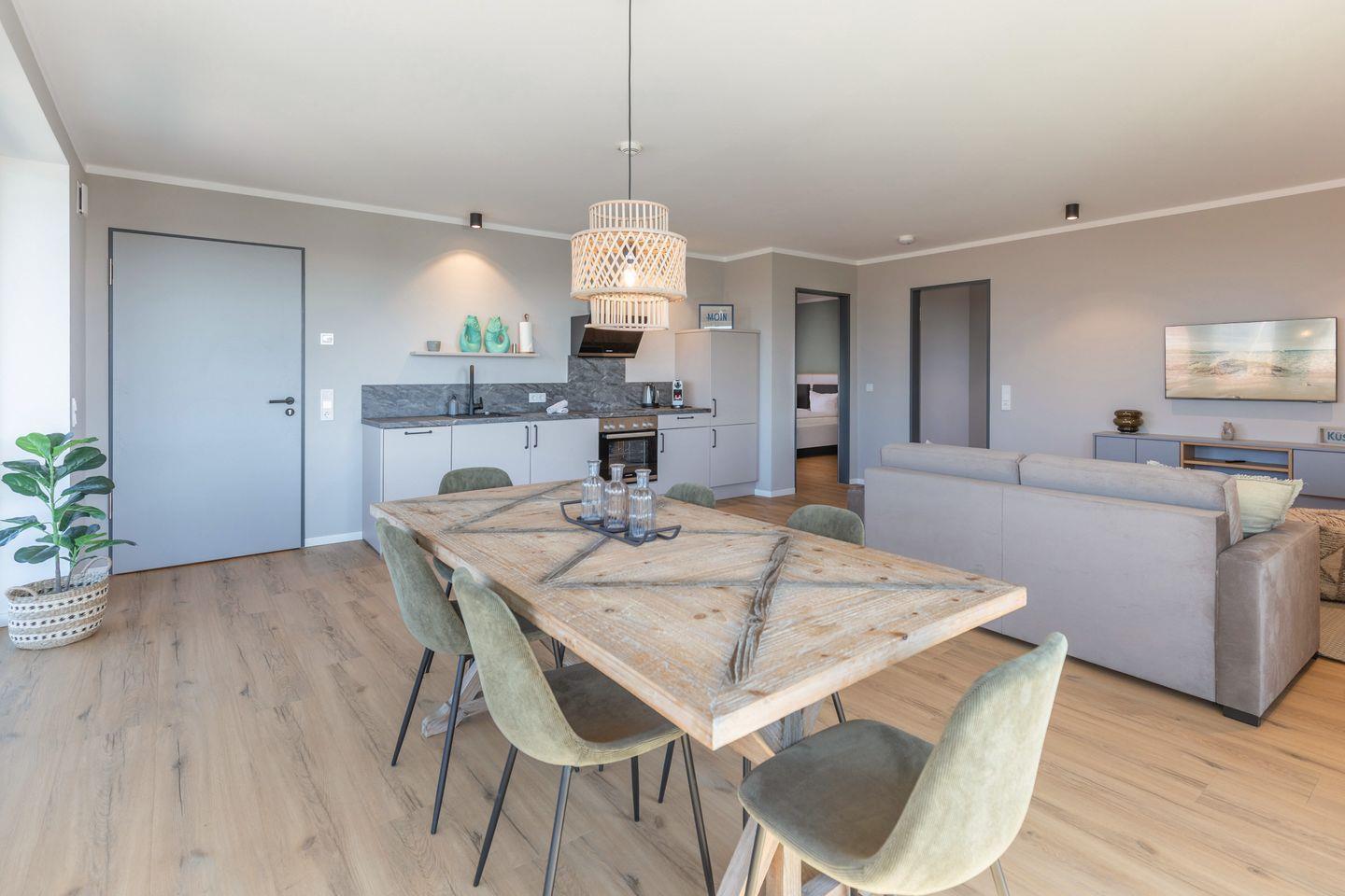 Direkt angeschlossen befindet sich die offene Küche mit Essbereich, Kühlschrank (mit Gefrierfach), Herd, Backofen, Spülmaschine (Tabs inklusive), Kaffeemaschine, Wasserkocher, Besteck, Geschirr plus Töpfe & Pfannen.
