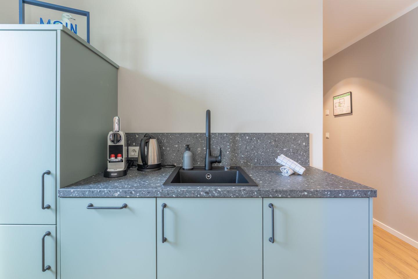 Direkt angeschlossen befindet sich die offene Küche mit Essbereich, Kühlschrank (mit Gefrierfach), Herd, Backofen, Spülmaschine (Tabs inklusive), Kaffeemaschine, Wasserkocher, Besteck, Geschirr plus Töpfe & Pfannen.