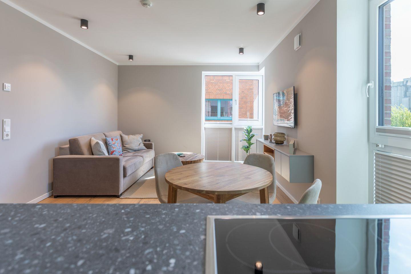Der gemütliche Wohnbereich des Apartments ist mit einer bequemen Couch und einem Flachbildfernseher ausgestattet.