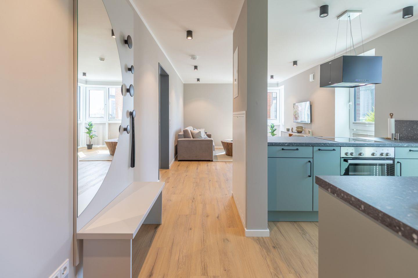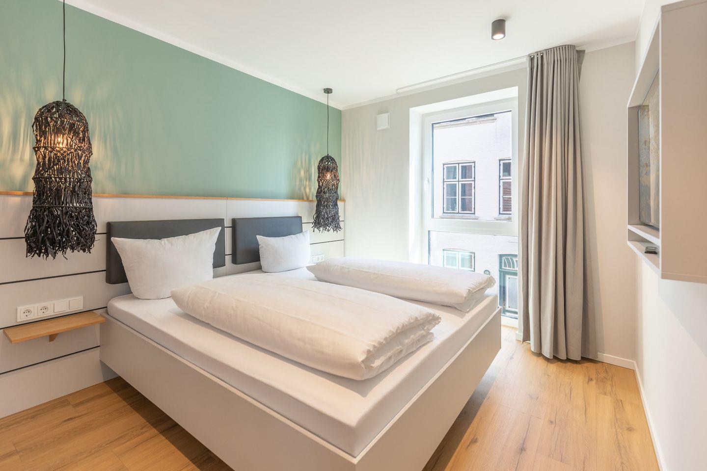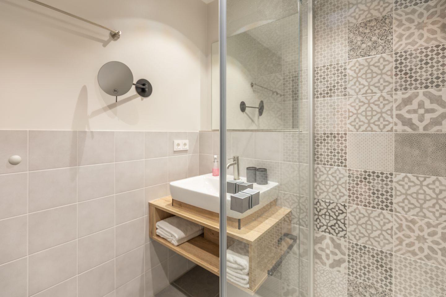 Das Badezimmer verfügt über eine ebenerdige Dusche, WC, Kosmetikspiegel und Föhn. Zudem ist das Apartment komplett mit Fußbodenheizung ausgestattet und bietet im Schlafzimmer Verdunkelungsgardinen für einen entspannten Schlaf. Alle Apartments in den oberen Etagen sind über einen Aufzug erreichbar.